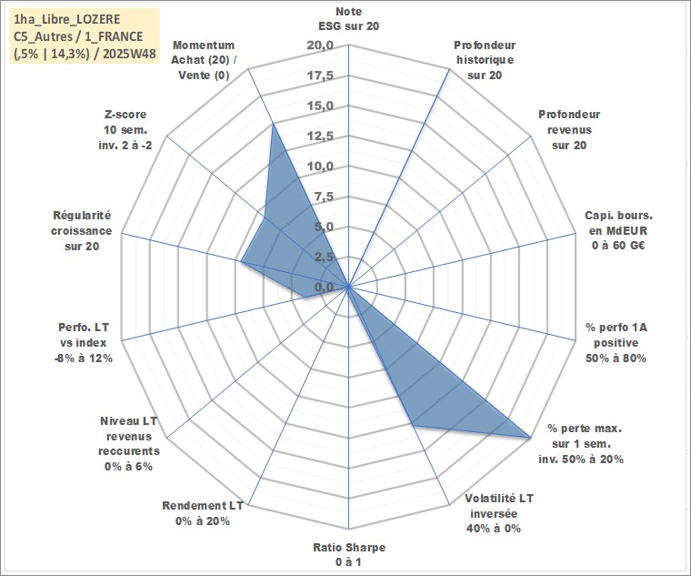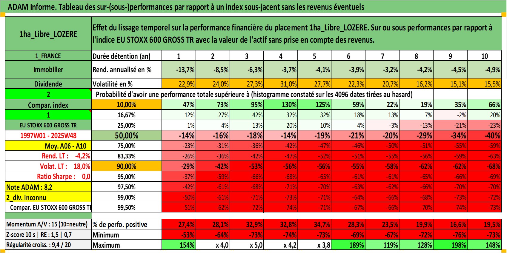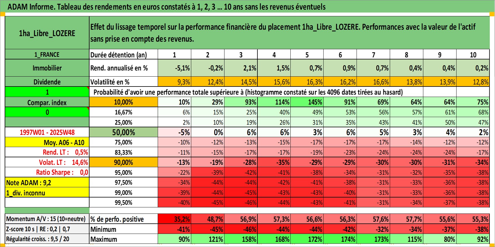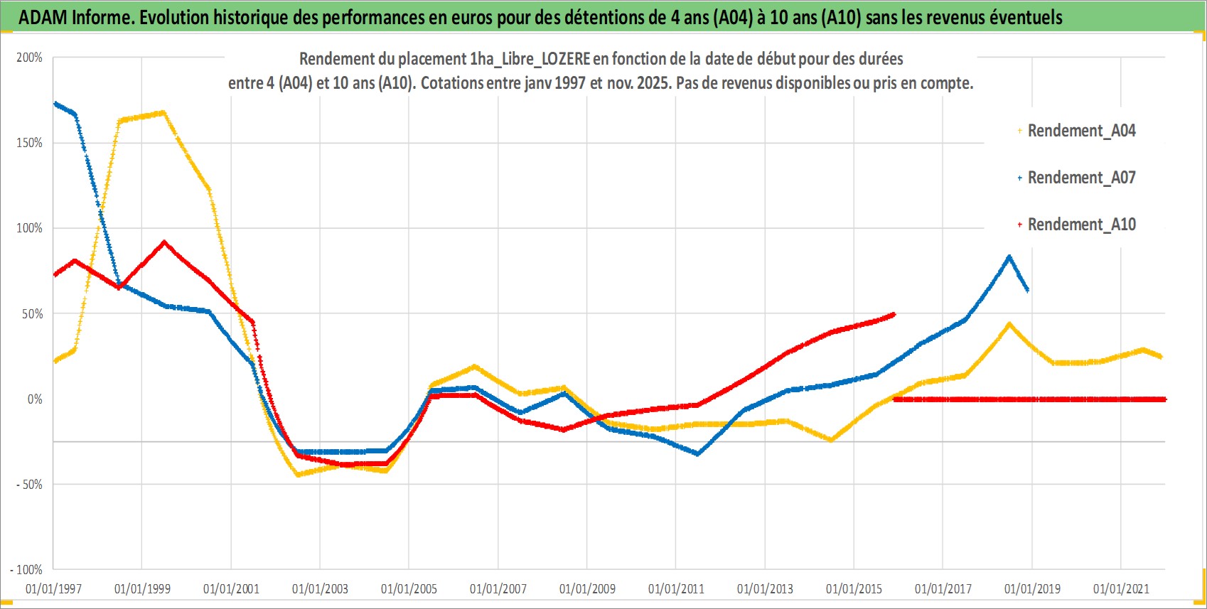 Site dédié aux investisseursPage dédiée sur site financeAnalyse des valorisations hebdomadaires de l'actif 1ha_Libre_LOZERE. Cet actif est cote en EUR. Les valorisations couvrent les semaines 1997W01 a 2025W48. Les fermages de ce bien foncier sont pris egaux a 2,5% annuels de la valeur venale du bien.