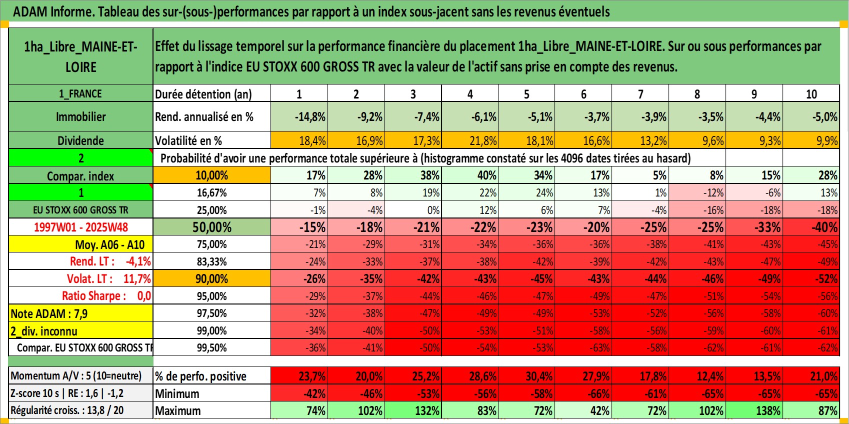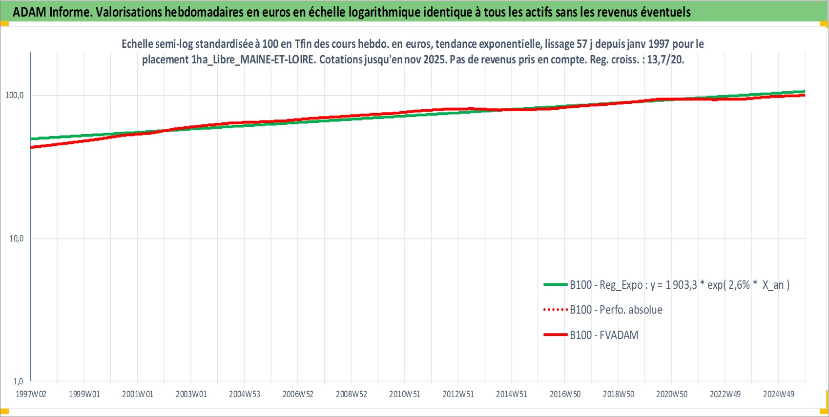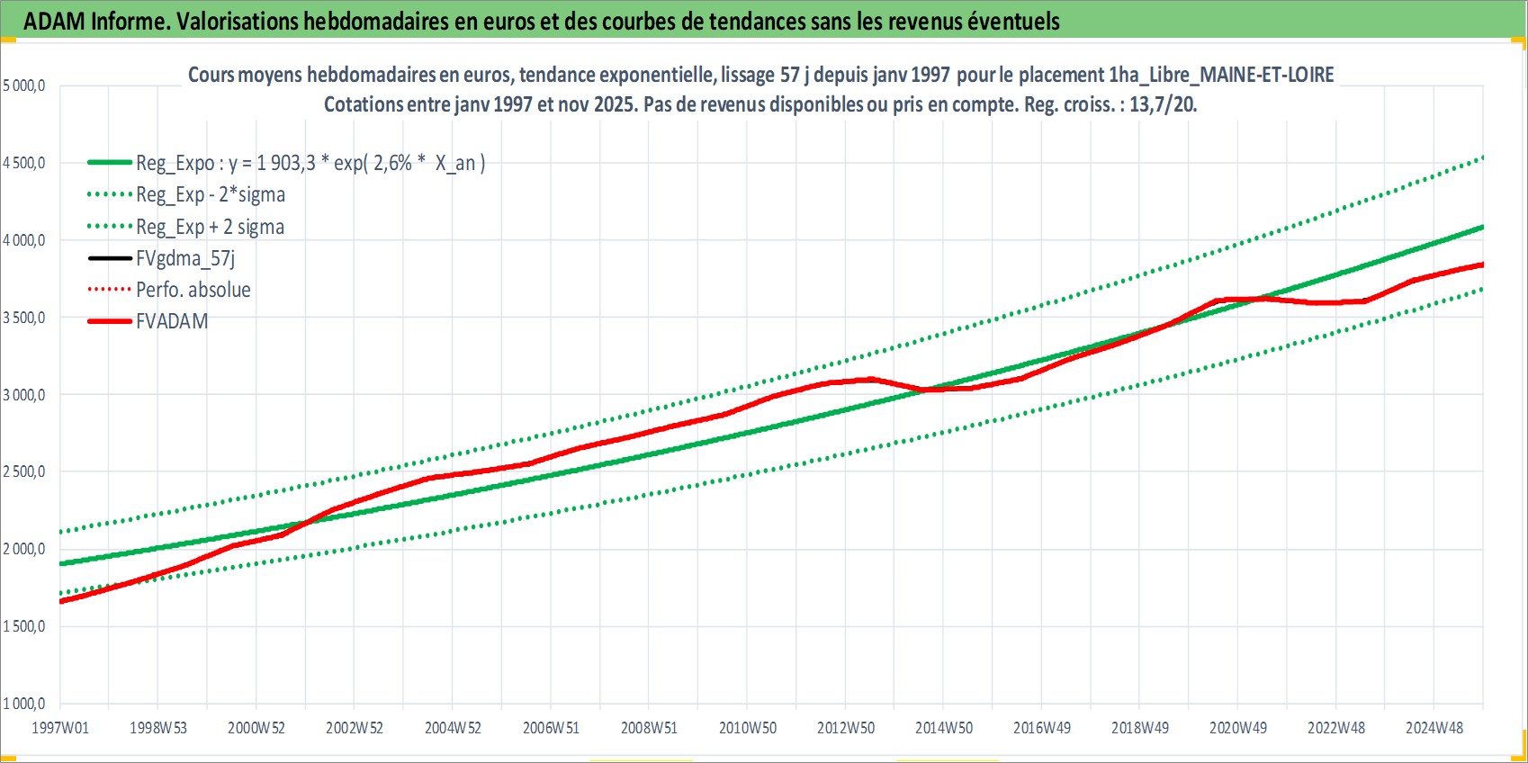 Site dédié aux investisseursPage dédiée sur site financeAnalyse des valorisations hebdomadaires de l'actif 1ha_Libre_MAINE-ET-LOIRE. Cet actif est cote en EUR. Les valorisations couvrent les semaines 1997W01 a 2025W48. Les fermages de ce bien foncier sont pris egaux a 2,5% annuels de la valeur venale du bien.