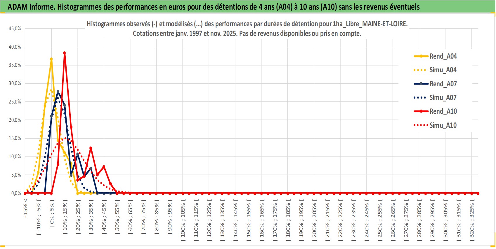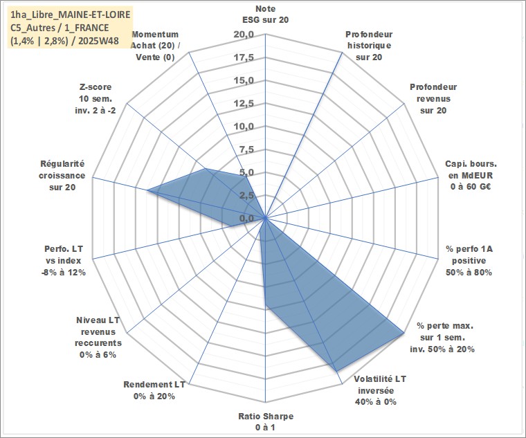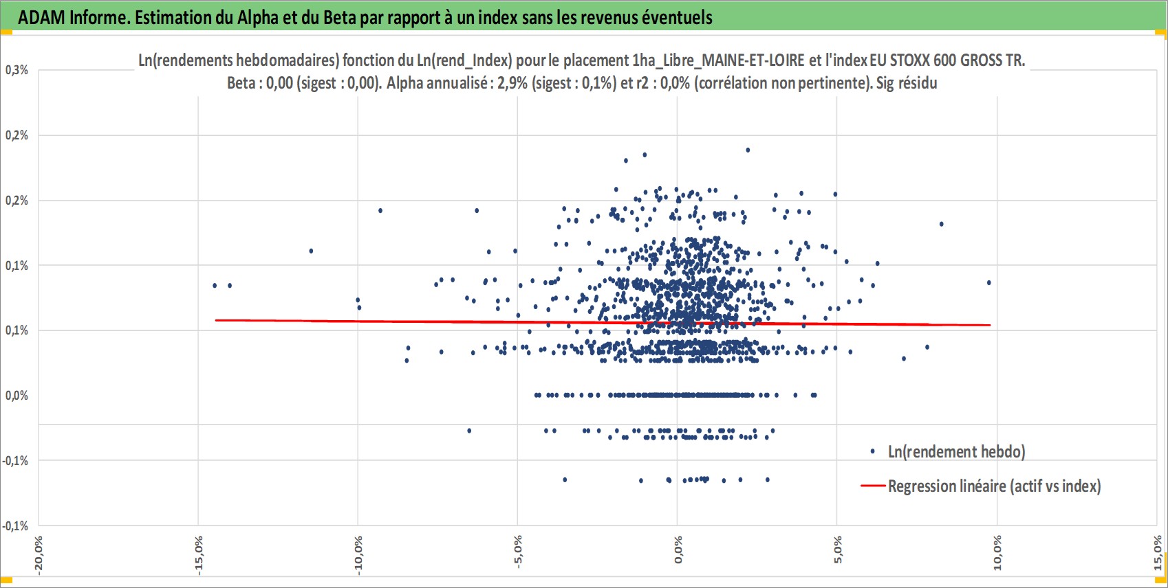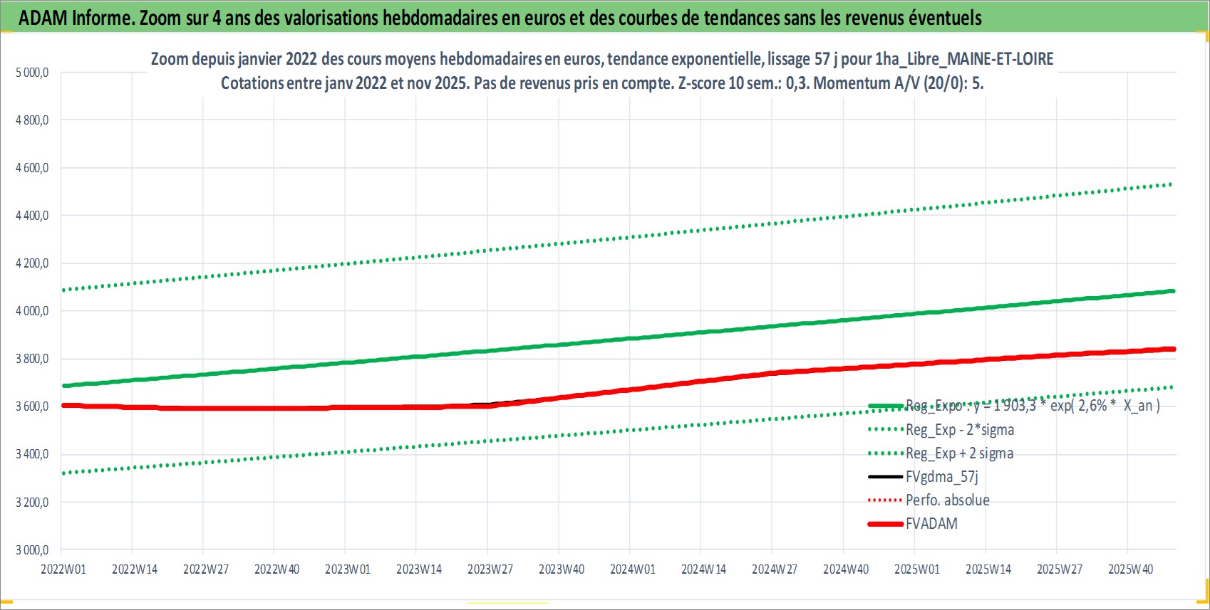 Site dédié aux investisseursPage dédiée sur site financeAnalyse des valorisations hebdomadaires de l'actif 1ha_Libre_MAINE-ET-LOIRE. Cet actif est cote en EUR. Les valorisations couvrent les semaines 1997W01 a 2025W48. Les fermages de ce bien foncier sont pris egaux a 2,5% annuels de la valeur venale du bien.