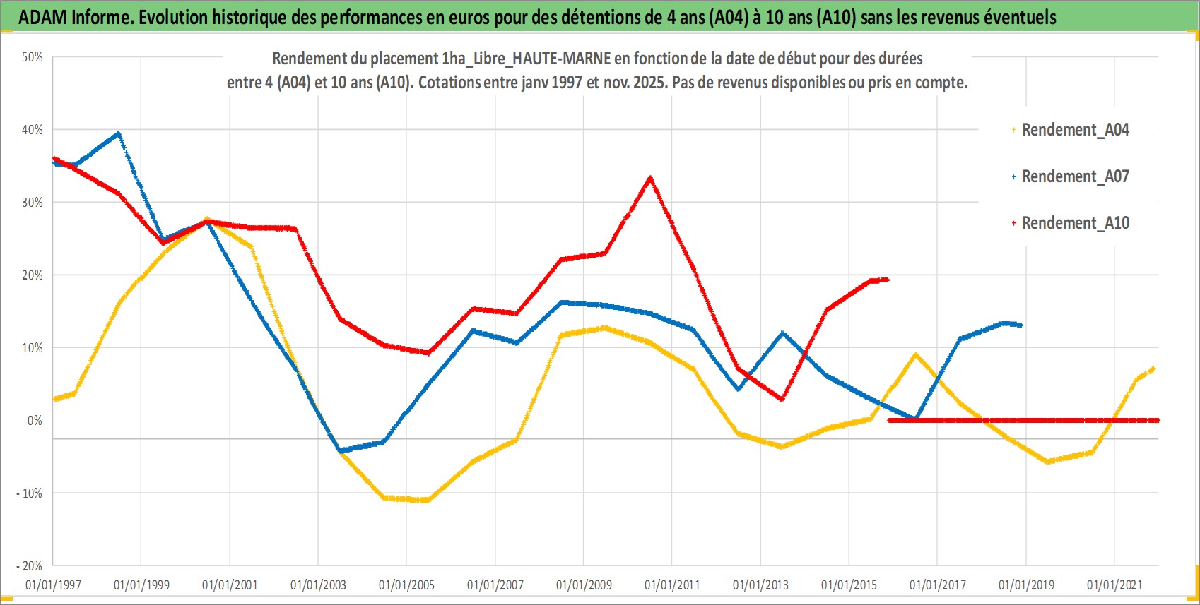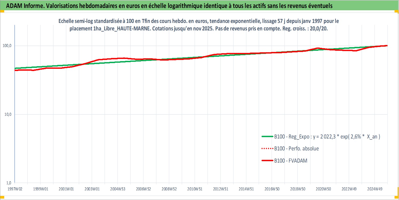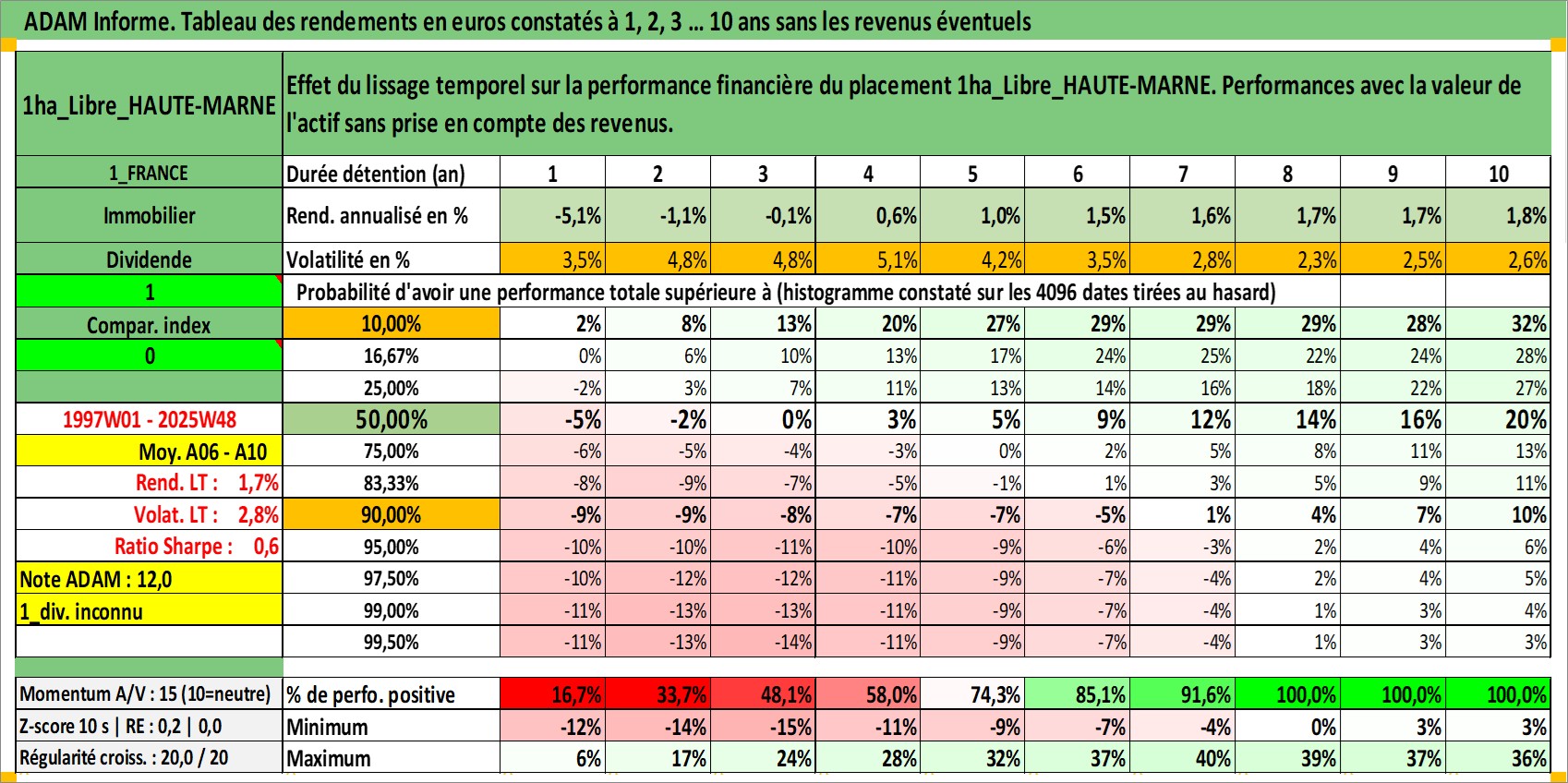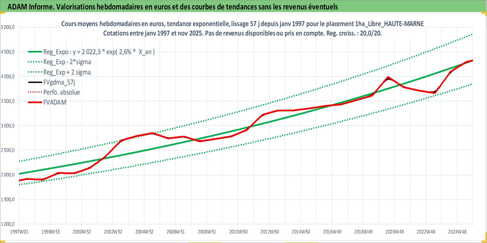 Site dédié aux investisseursPage dédiée sur site financeAnalyse des valorisations hebdomadaires de l'actif 1ha_Libre_HAUTE-MARNE. Cet actif est cote en EUR. Les valorisations couvrent les semaines 1997W01 a 2025W48. Les fermages de ce bien foncier sont pris egaux a 2,5% annuels de la valeur venale du bien.