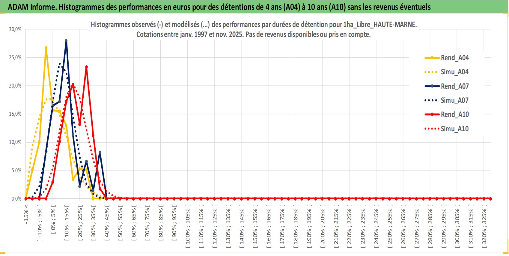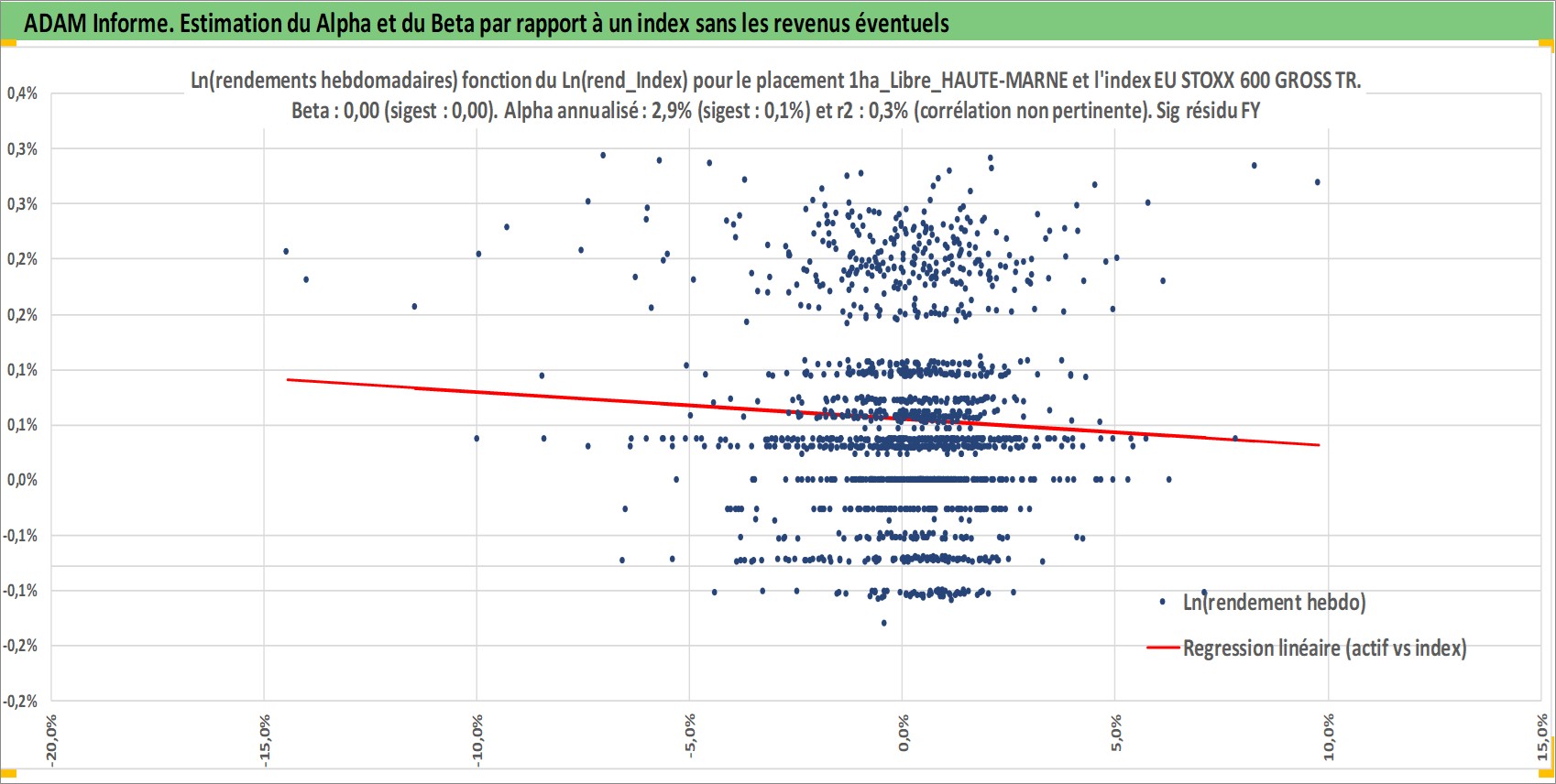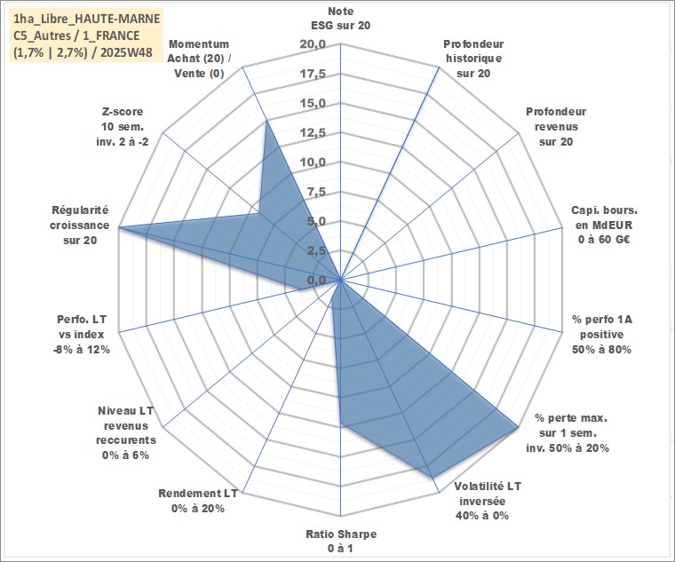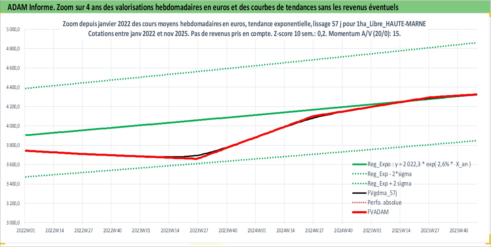 Site dédié aux investisseursPage dédiée sur site financeAnalyse des valorisations hebdomadaires de l'actif 1ha_Libre_HAUTE-MARNE. Cet actif est cote en EUR. Les valorisations couvrent les semaines 1997W01 a 2025W48. Les fermages de ce bien foncier sont pris egaux a 2,5% annuels de la valeur venale du bien.