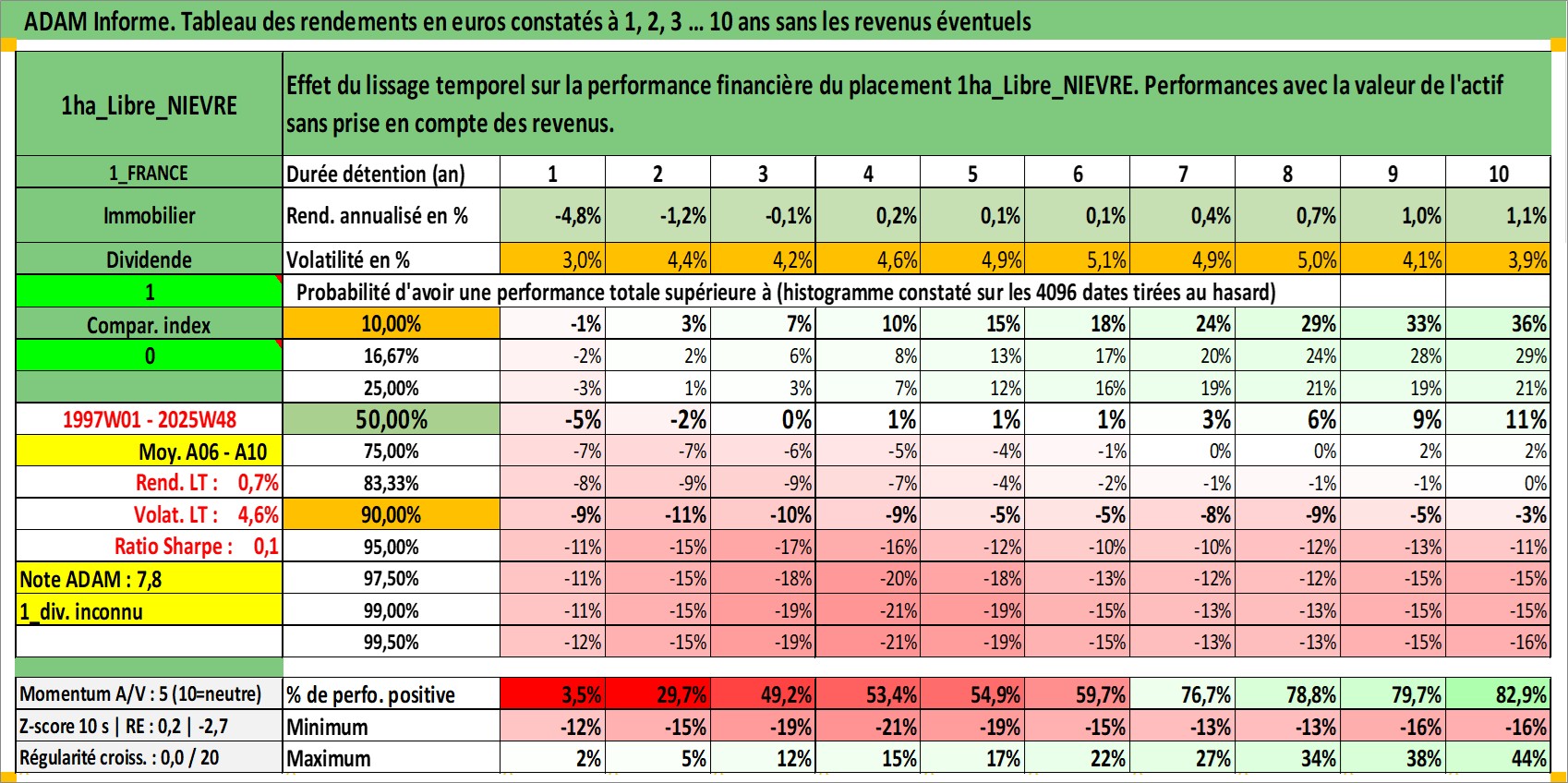 Site dédié aux investisseursPage dédiée sur site financeAnalyse des valorisations hebdomadaires de l'actif 1ha_Libre_NIEVRE. Cet actif est cote en EUR. Les valorisations couvrent les semaines 1997W01 a 2025W48. Les fermages de ce bien foncier sont pris egaux a 2,5% annuels de la valeur venale du bien.