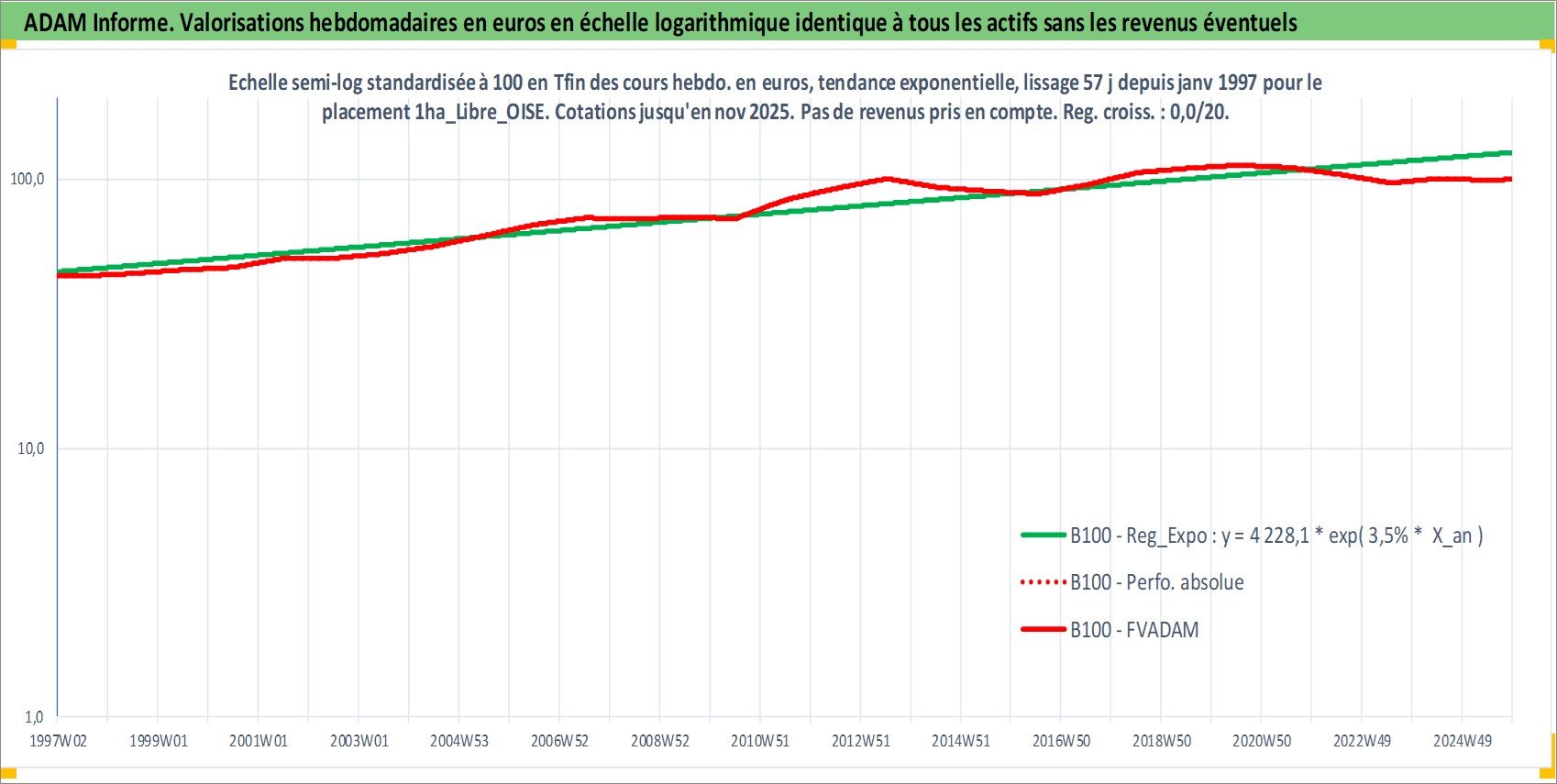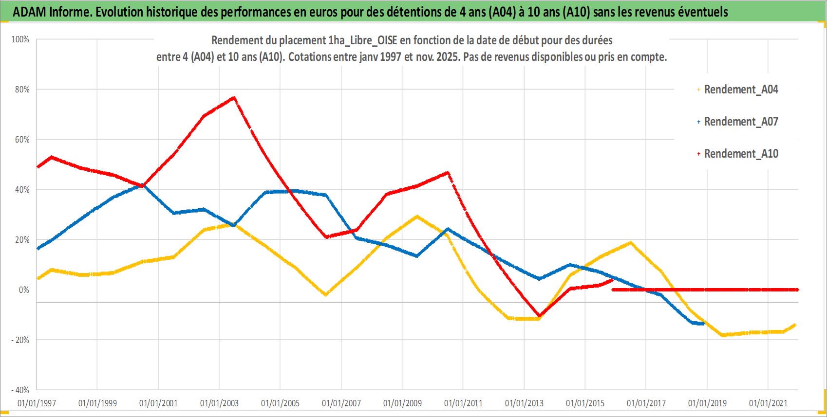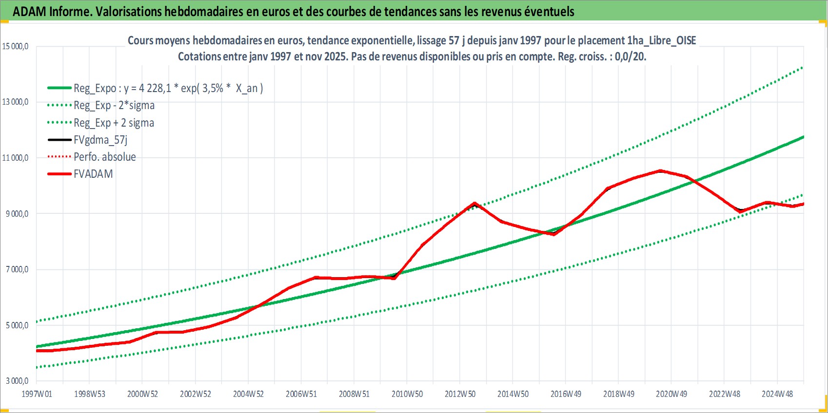 Site dédié aux investisseursPage dédiée sur site financeAnalyse des valorisations hebdomadaires de l'actif 1ha_Libre_OISE. Cet actif est cote en EUR. Les valorisations couvrent les semaines 1997W01 a 2025W48. Les fermages de ce bien foncier sont pris egaux a 2,5% annuels de la valeur venale du bien.
