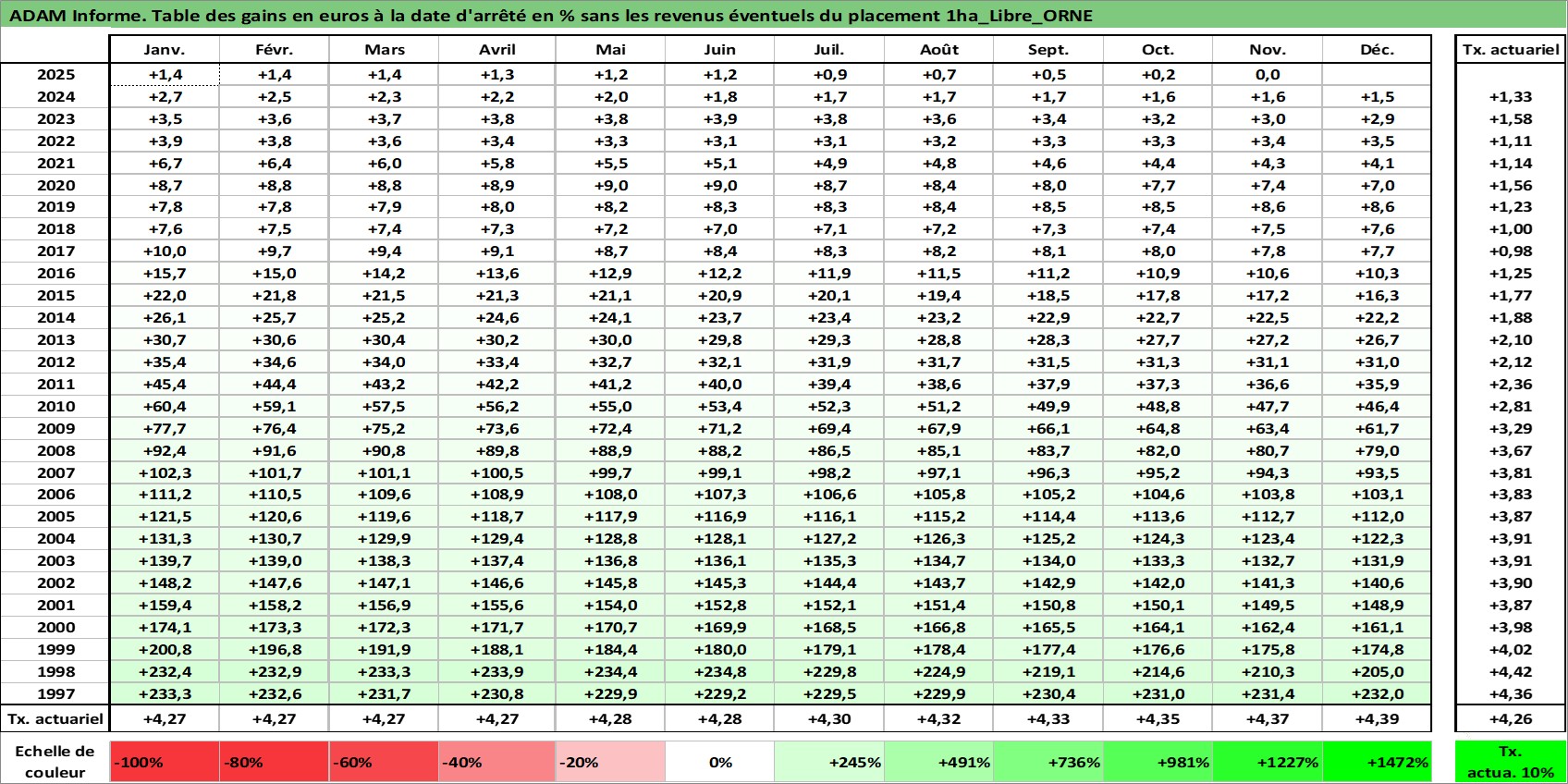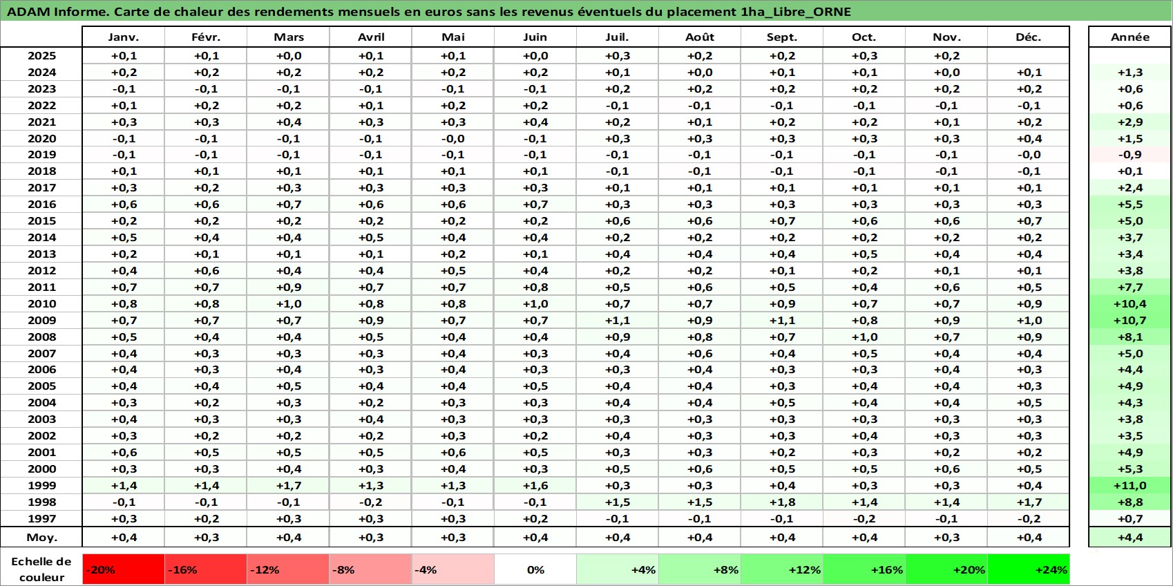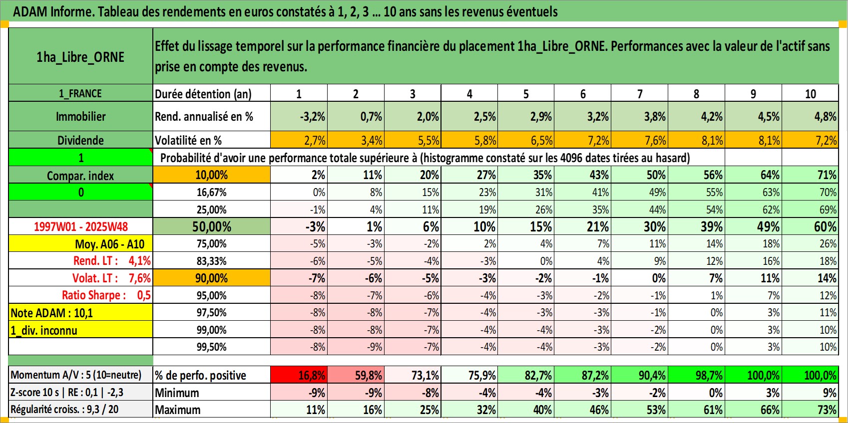 Site dédié aux investisseursPage dédiée sur site financeAnalyse des valorisations hebdomadaires de l'actif 1ha_Libre_ORNE. Cet actif est cote en EUR. Les valorisations couvrent les semaines 1997W01 a 2025W48. Les fermages de ce bien foncier sont pris egaux a 2,5% annuels de la valeur venale du bien.