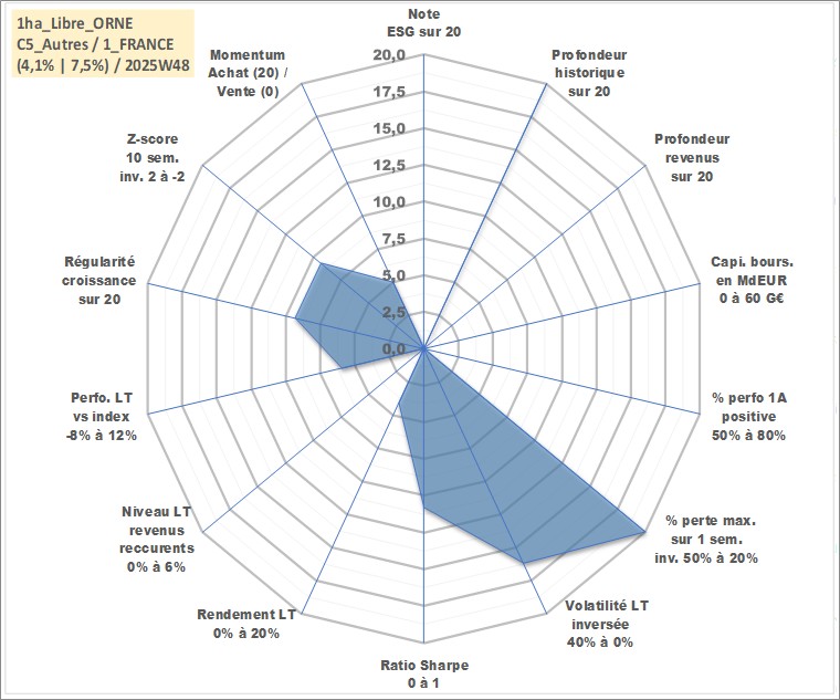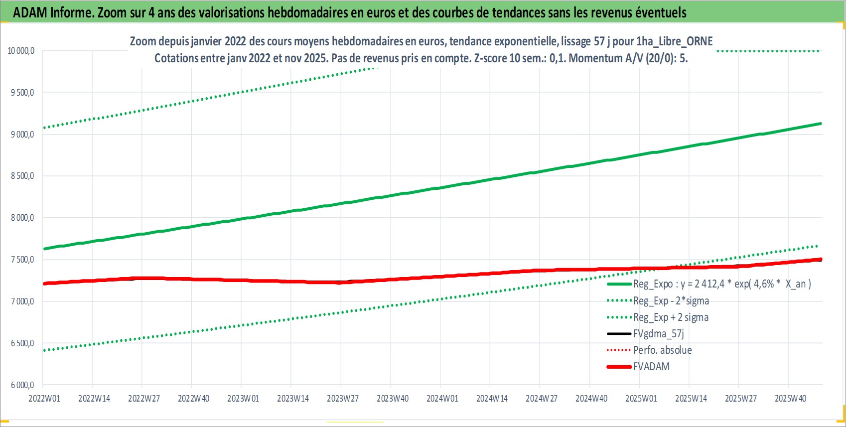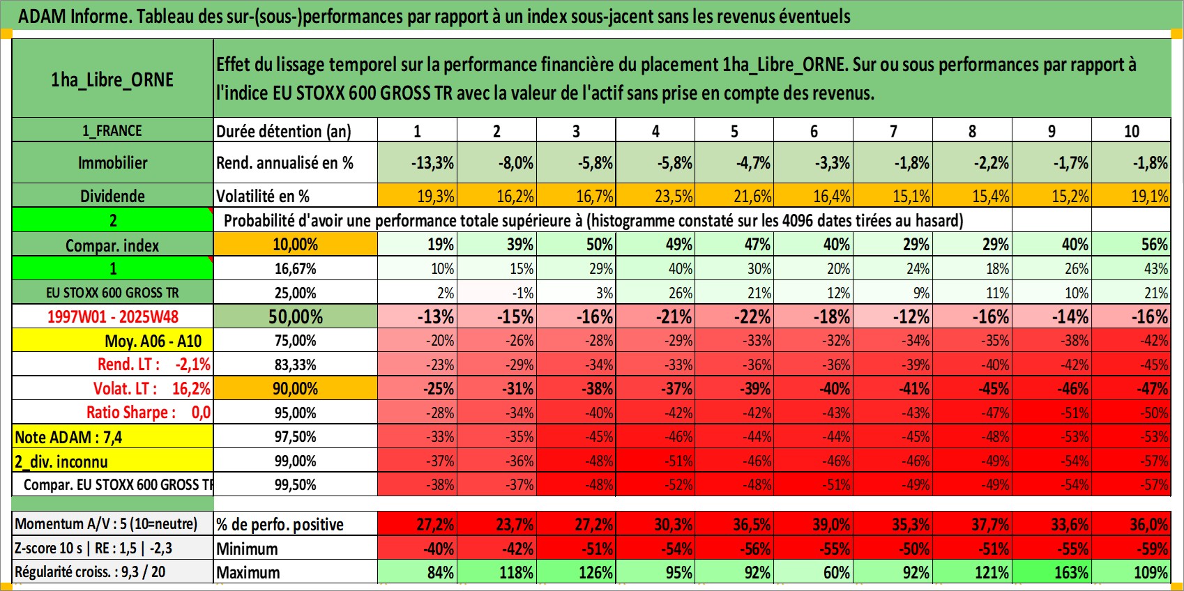 Site dédié aux investisseursPage dédiée sur site financeAnalyse des valorisations hebdomadaires de l'actif 1ha_Libre_ORNE. Cet actif est cote en EUR. Les valorisations couvrent les semaines 1997W01 a 2025W48. Les fermages de ce bien foncier sont pris egaux a 2,5% annuels de la valeur venale du bien.