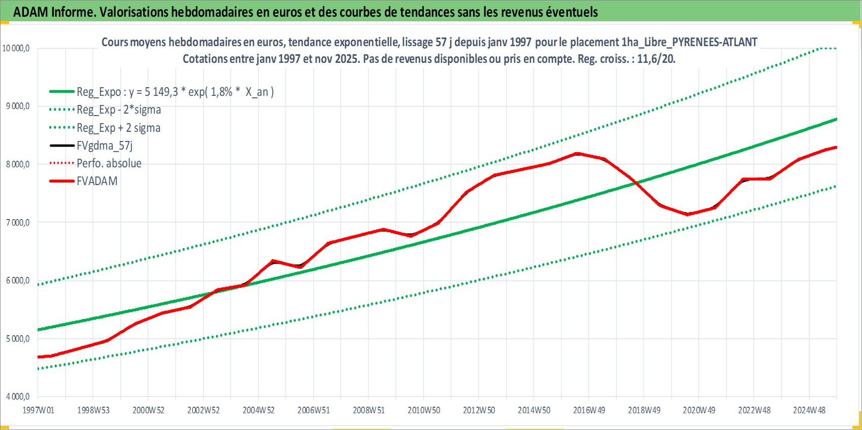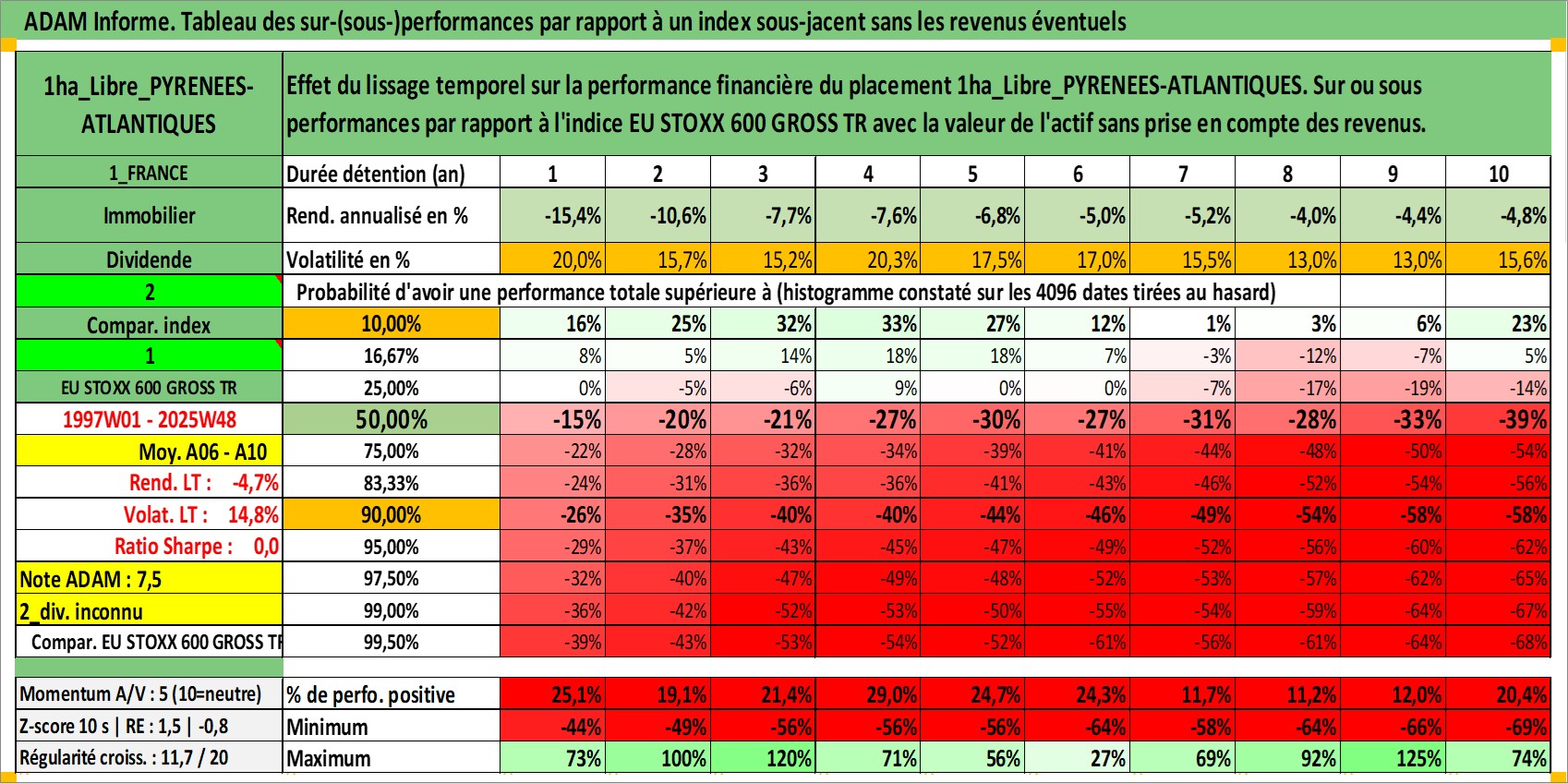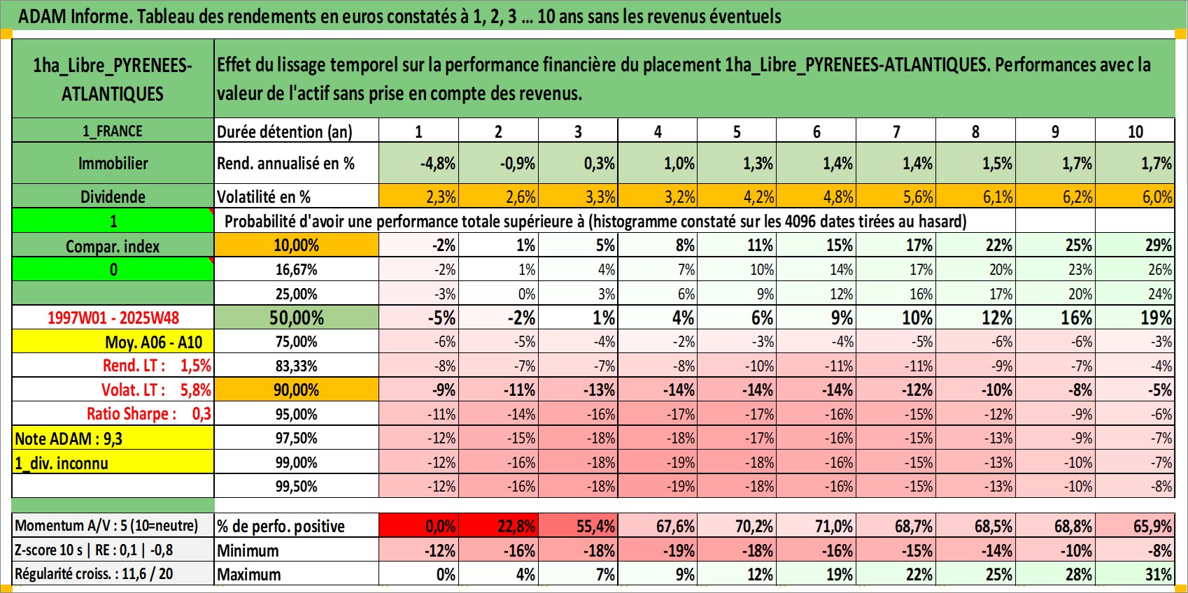 Site dédié aux investisseursPage dédiée sur site financeAnalyse des valorisations hebdomadaires de l'actif 1ha_Libre_PYRENEES-ATLANTIQUES. Cet actif est cote en EUR. Les valorisations couvrent les semaines 1997W01 a 2025W48. Les fermages de ce bien foncier sont pris egaux a 2,5% annuels de la valeur venale du bien.