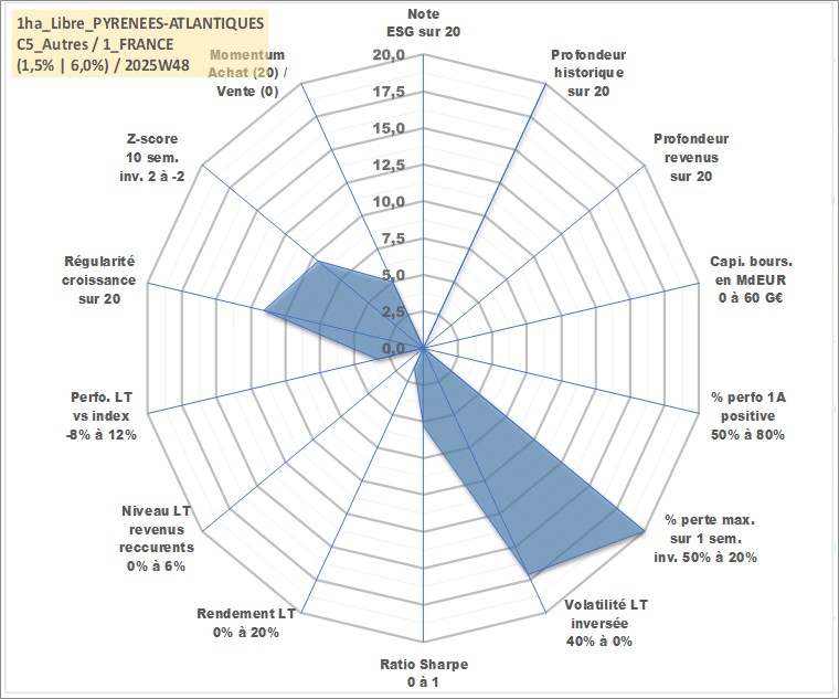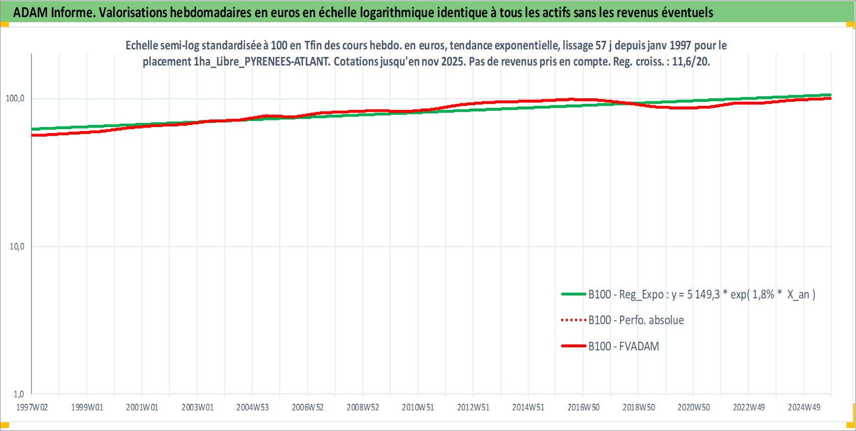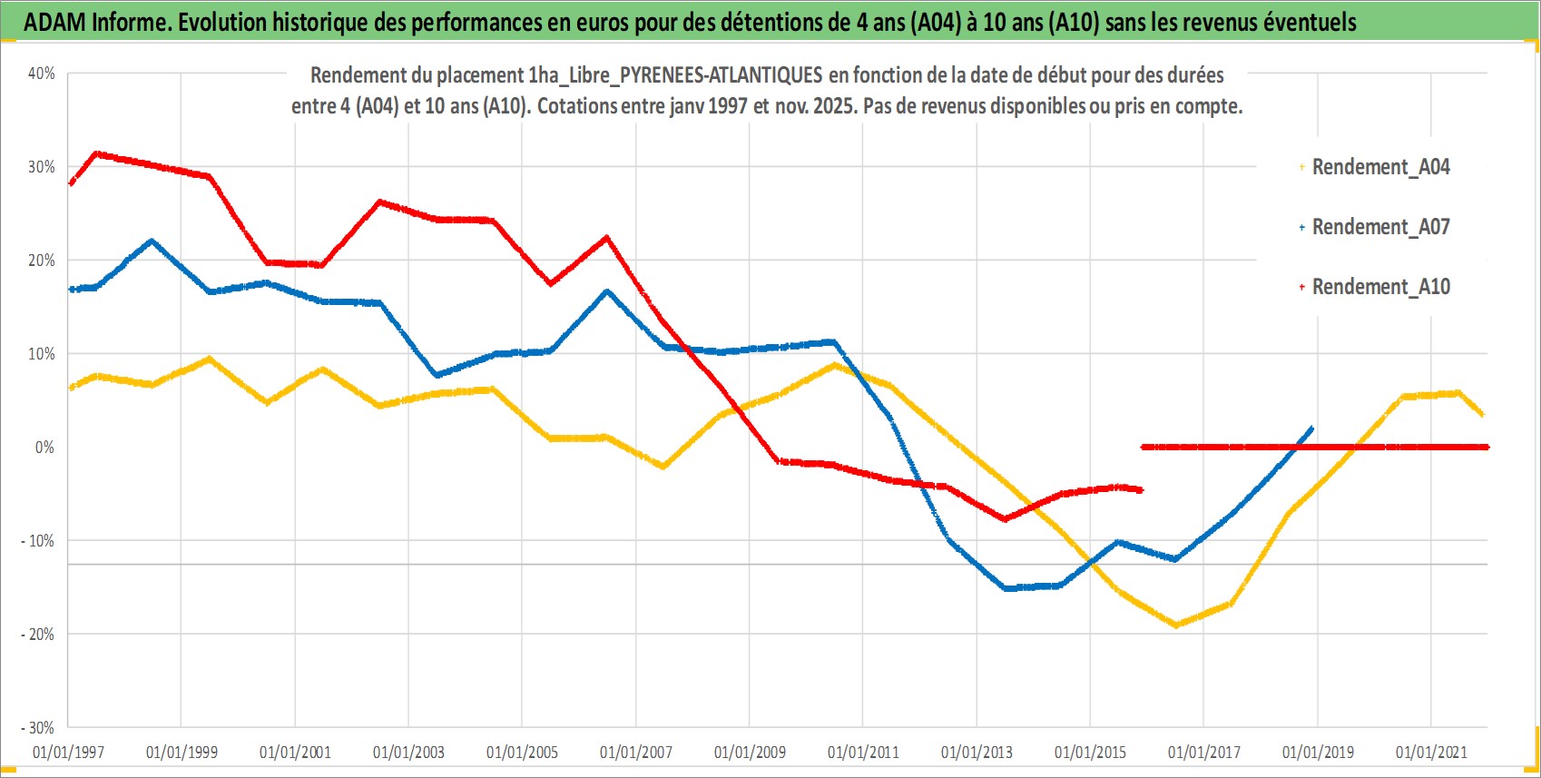Site dédié aux investisseursPage dédiée sur site financeAnalyse des valorisations hebdomadaires de l'actif 1ha_Libre_PYRENEES-ATLANTIQUES. Cet actif est cote en EUR. Les valorisations couvrent les semaines 1997W01 a 2025W48. Les fermages de ce bien foncier sont pris egaux a 2,5% annuels de la valeur venale du bien.