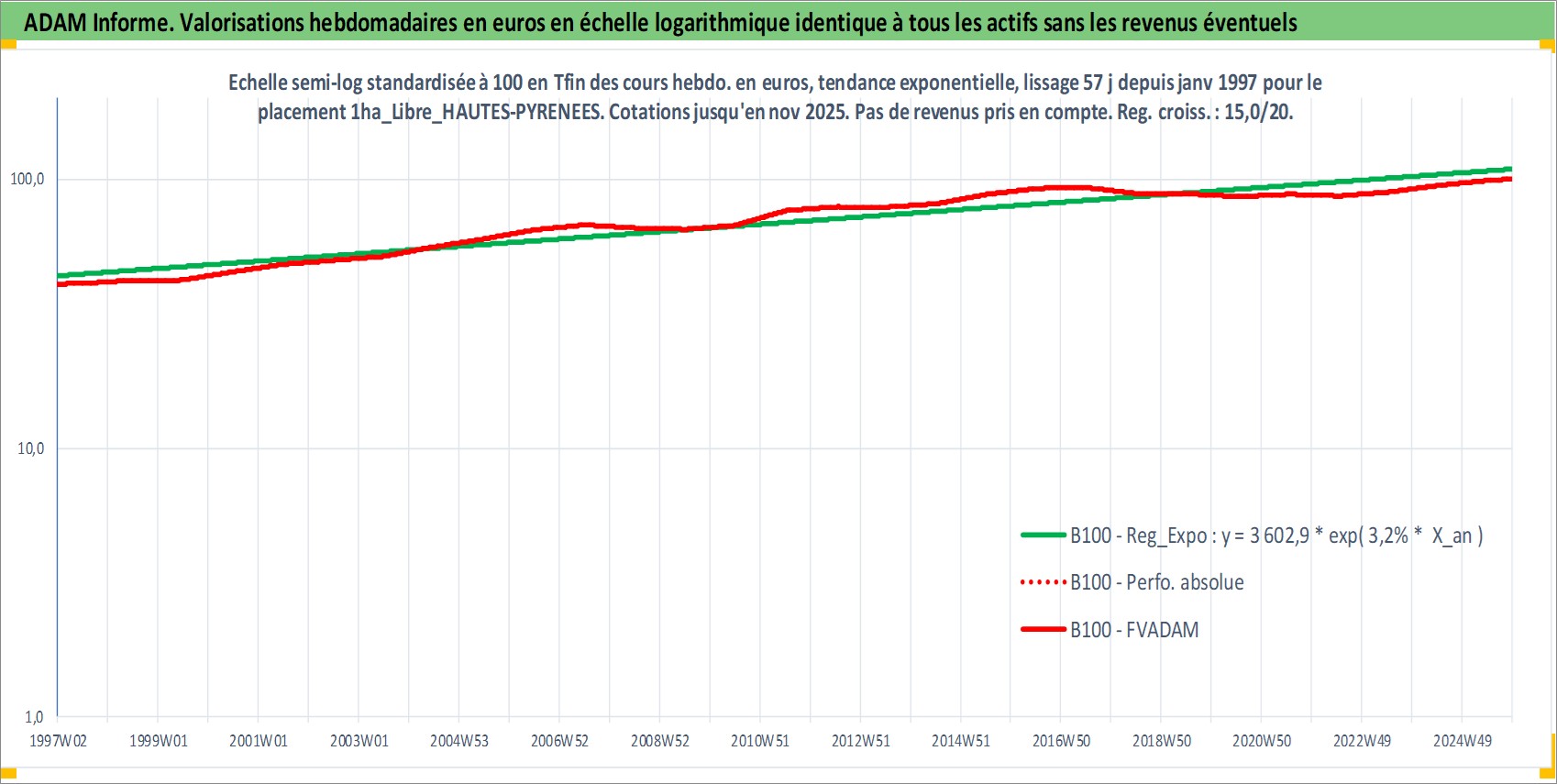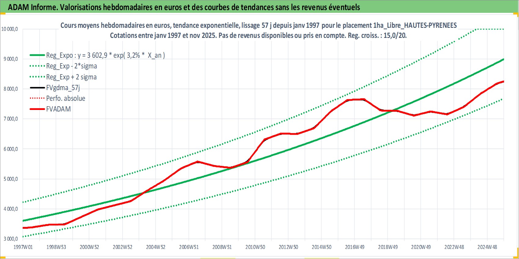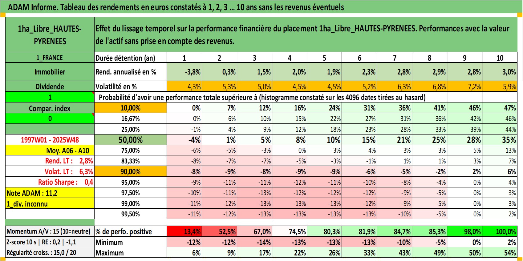 Site dédié aux investisseursPage dédiée sur site financeAnalyse des valorisations hebdomadaires de l'actif 1ha_Libre_HAUTES-PYRENEES. Cet actif est cote en EUR. Les valorisations couvrent les semaines 1997W01 a 2025W48. Les fermages de ce bien foncier sont pris egaux a 2,5% annuels de la valeur venale du bien.