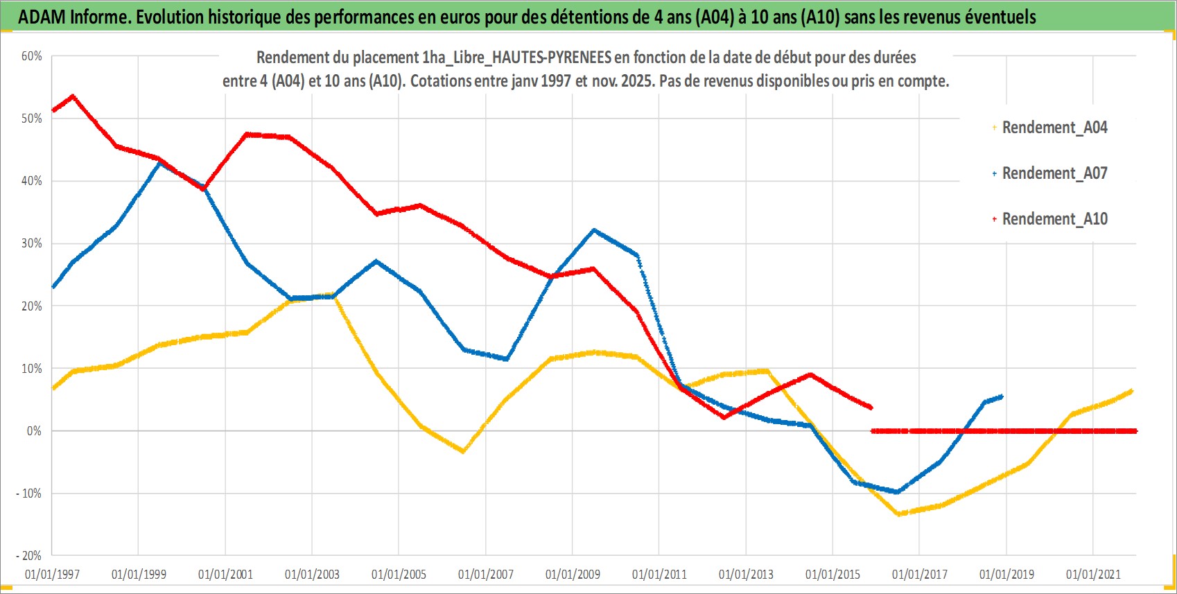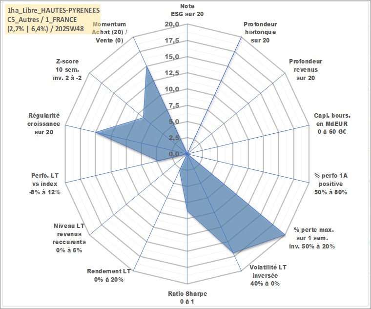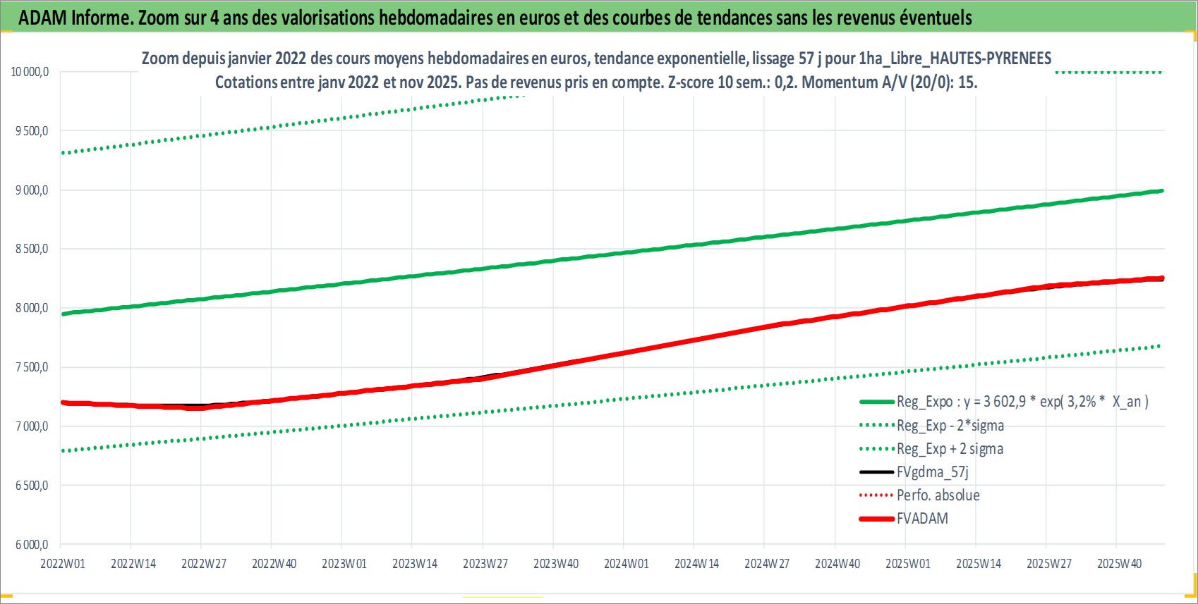 Site dédié aux investisseursPage dédiée sur site financeAnalyse des valorisations hebdomadaires de l'actif 1ha_Libre_HAUTES-PYRENEES. Cet actif est cote en EUR. Les valorisations couvrent les semaines 1997W01 a 2025W48. Les fermages de ce bien foncier sont pris egaux a 2,5% annuels de la valeur venale du bien.