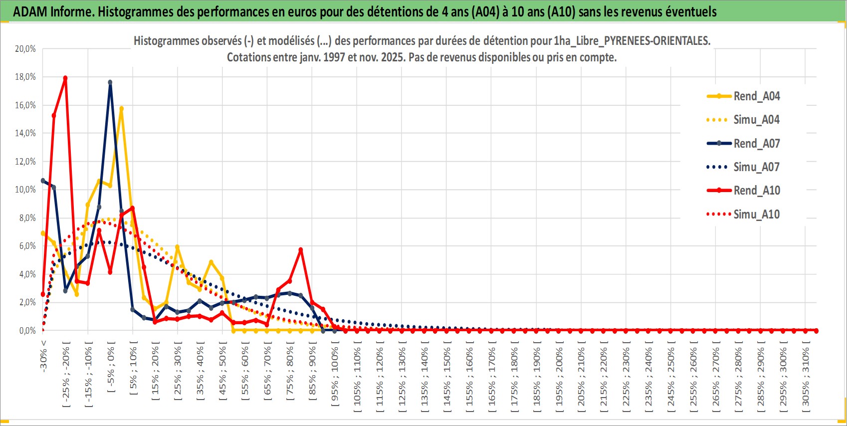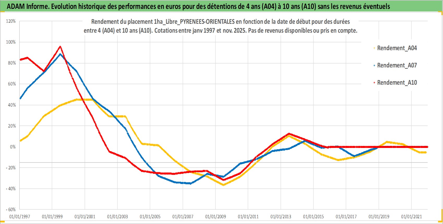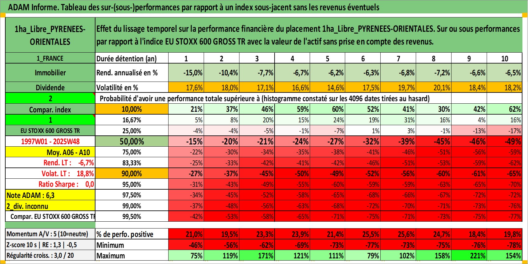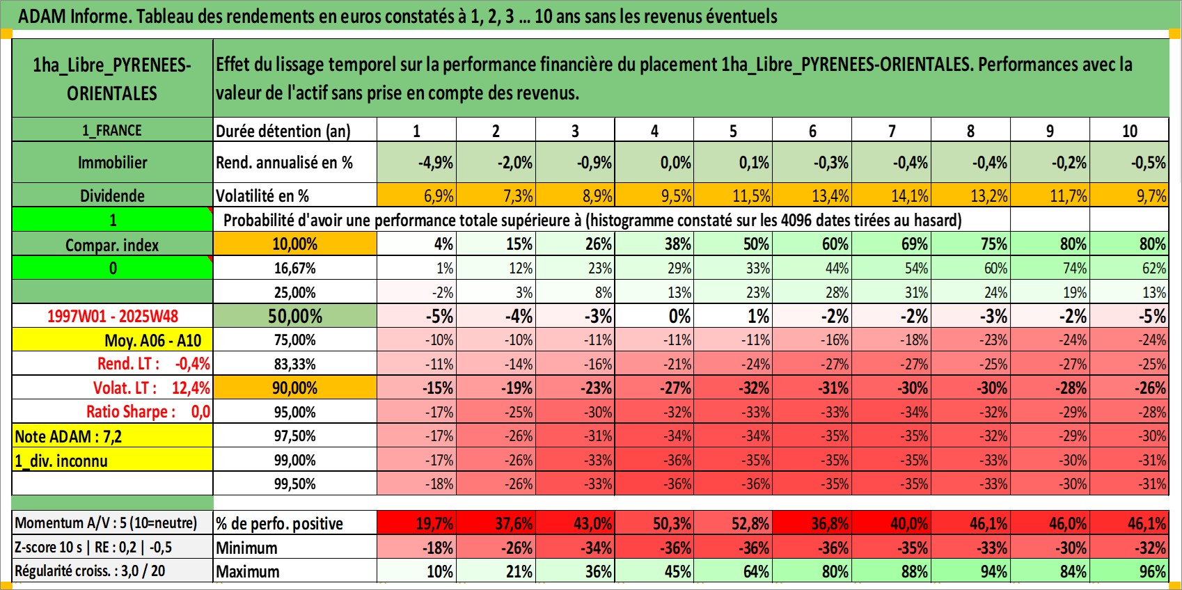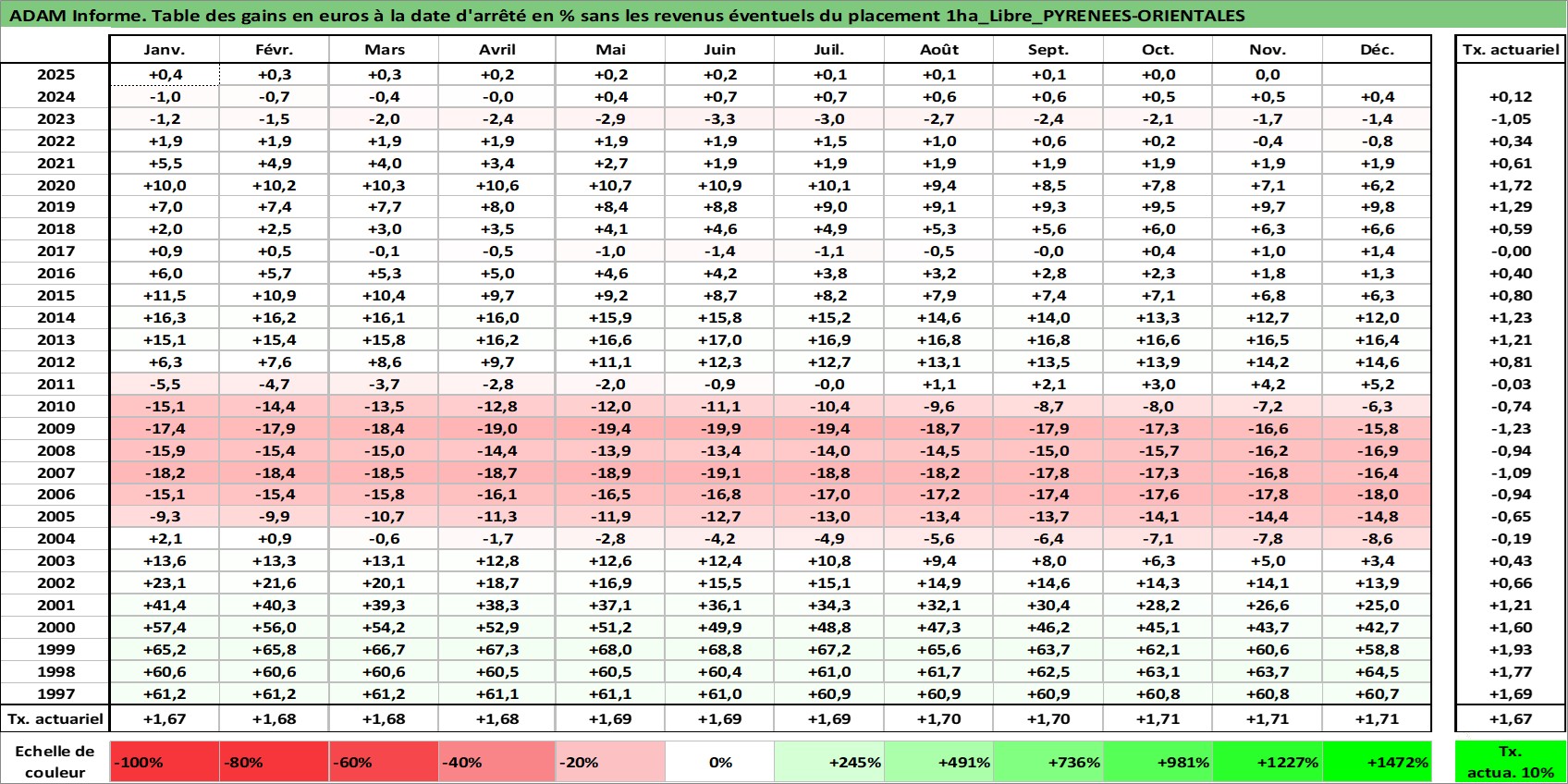 Site dédié aux investisseursPage dédiée sur site financeAnalyse des valorisations hebdomadaires de l'actif 1ha_Libre_PYRENEES-ORIENTALES. Cet actif est cote en EUR. Les valorisations couvrent les semaines 1997W01 a 2025W48. Les fermages de ce bien foncier sont pris egaux a 2,5% annuels de la valeur venale du bien.