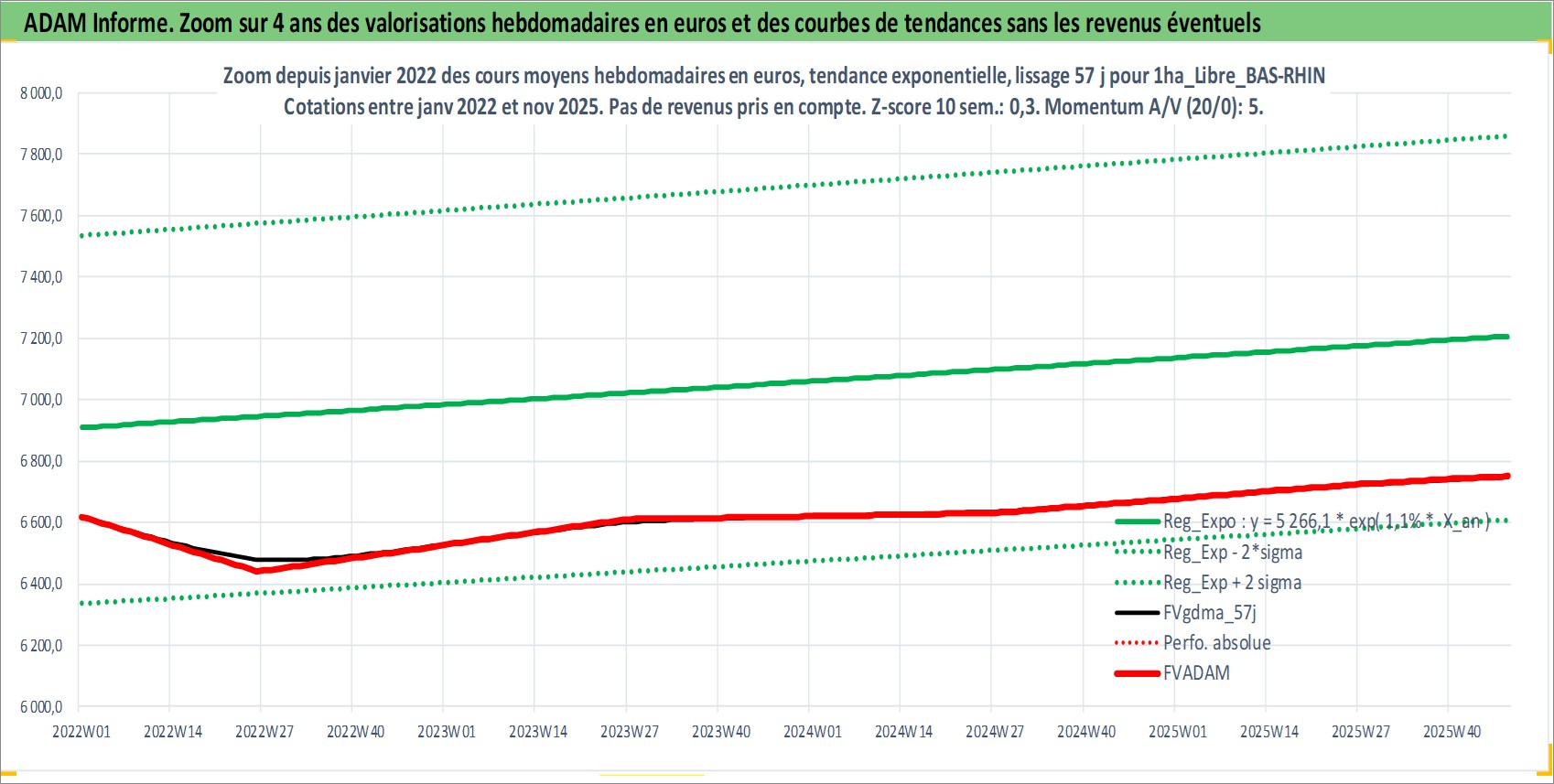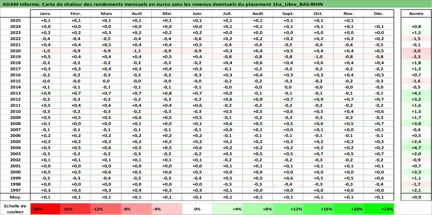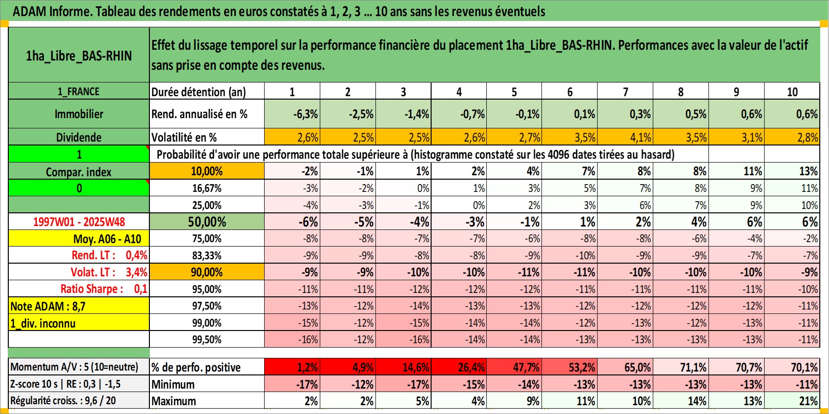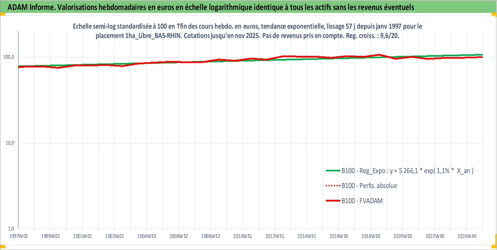 Site dédié aux investisseursPage dédiée sur site financeAnalyse des valorisations hebdomadaires de l'actif 1ha_Libre_BAS-RHIN. Cet actif est cote en EUR. Les valorisations couvrent les semaines 1997W01 a 2025W48. Les fermages de ce bien foncier sont pris egaux a 2,5% annuels de la valeur venale du bien.