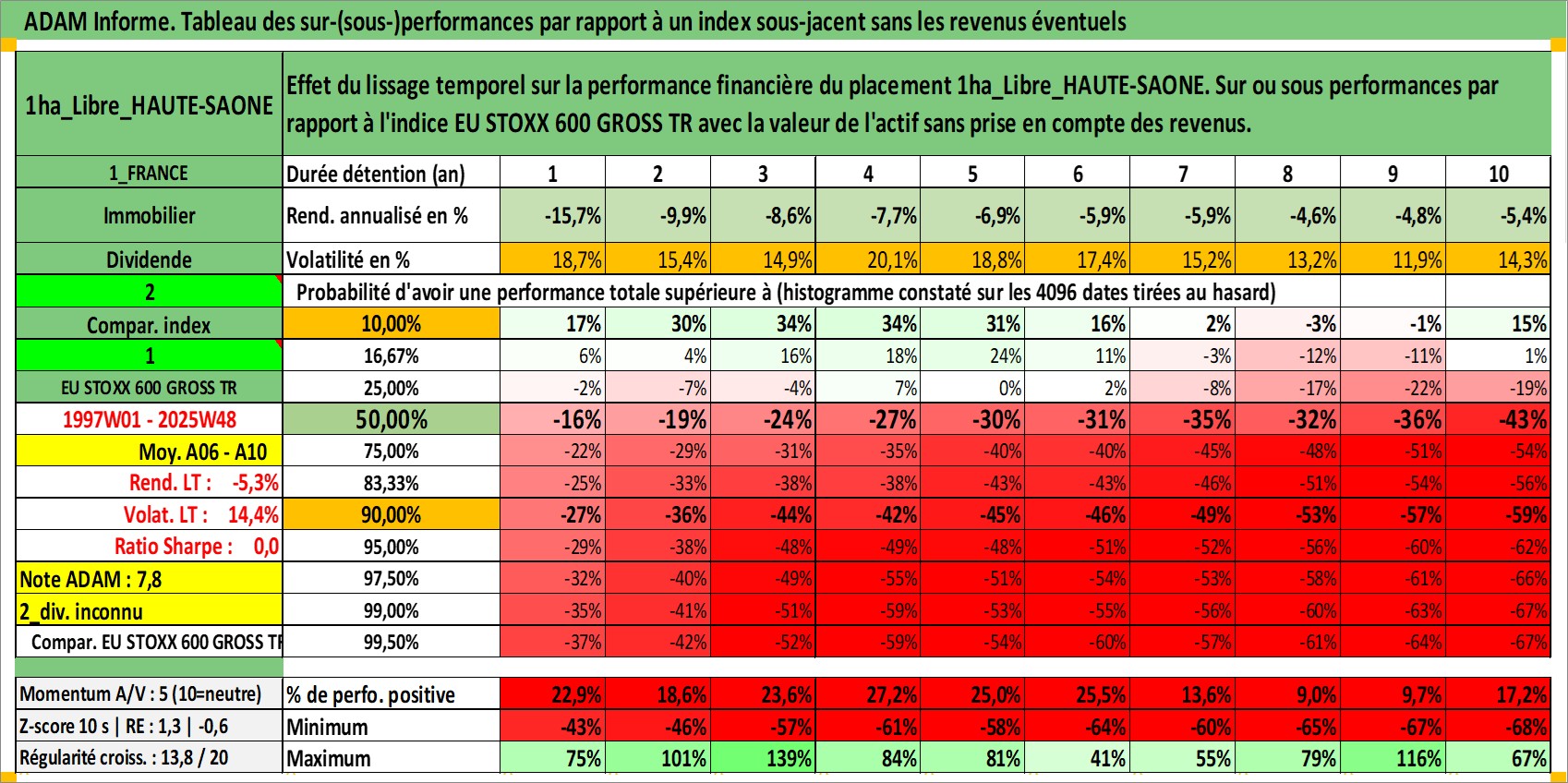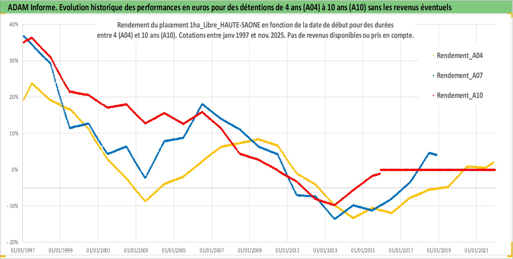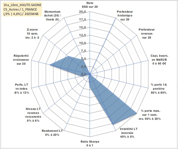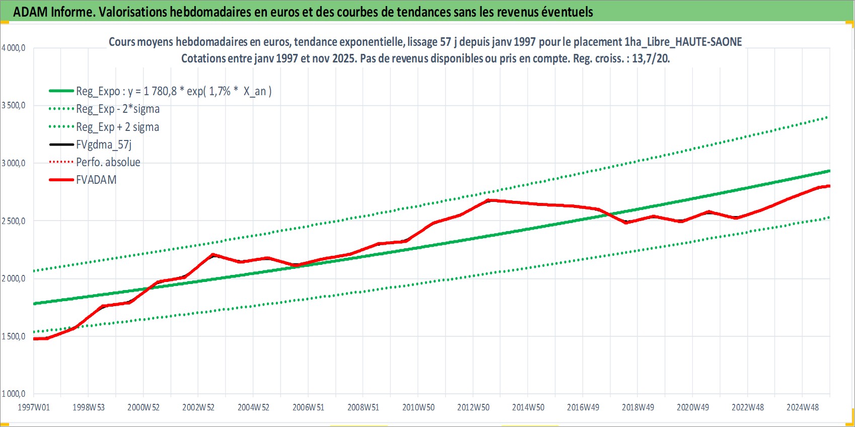 Site dédié aux investisseursPage dédiée sur site financeAnalyse des valorisations hebdomadaires de l'actif 1ha_Libre_HAUTE-SAONE. Cet actif est cote en EUR. Les valorisations couvrent les semaines 1997W01 a 2025W48. Les fermages de ce bien foncier sont pris egaux a 2,5% annuels de la valeur venale du bien.