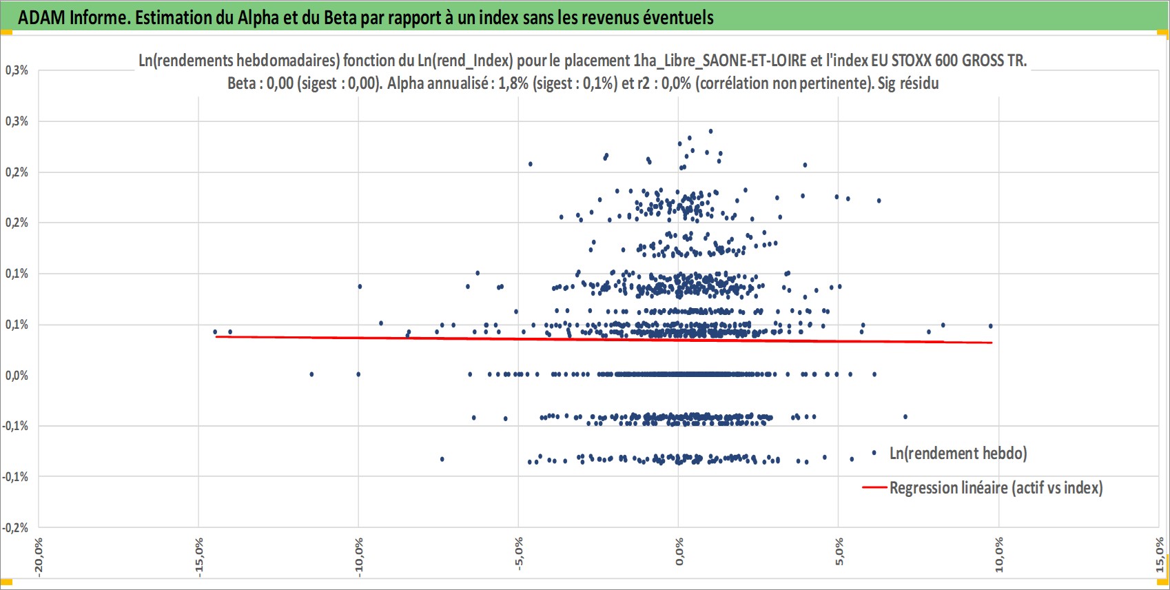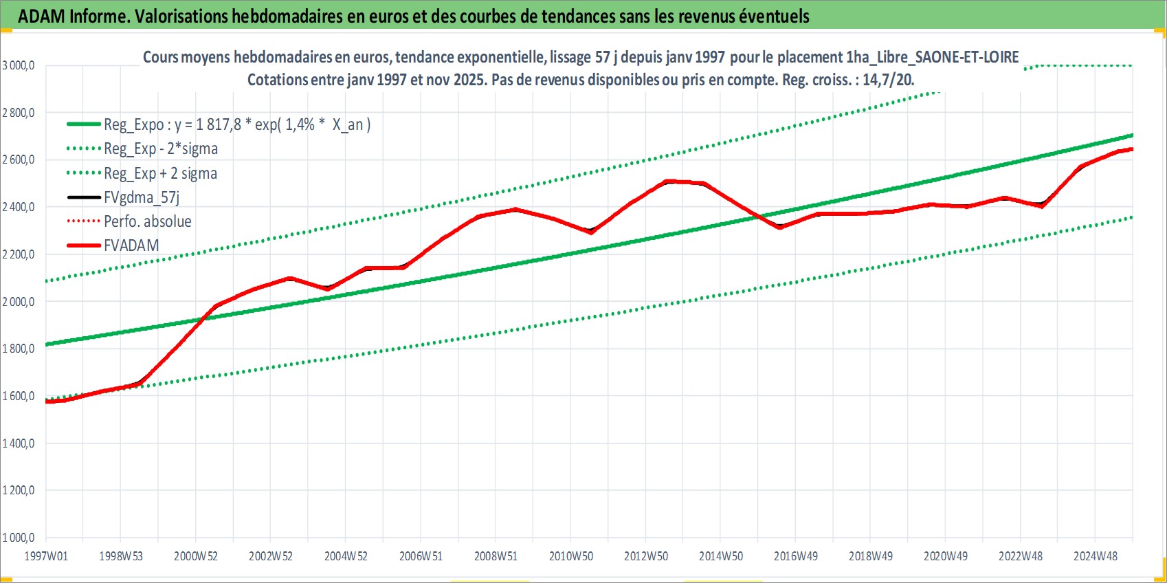Site dédié aux investisseursPage dédiée sur site financeAnalyse des valorisations hebdomadaires de l'actif 1ha_Libre_SAONE-ET-LOIRE. Cet actif est cote en EUR. Les valorisations couvrent les semaines 1997W01 a 2025W48. Les fermages de ce bien foncier sont pris egaux a 2,5% annuels de la valeur venale du bien.