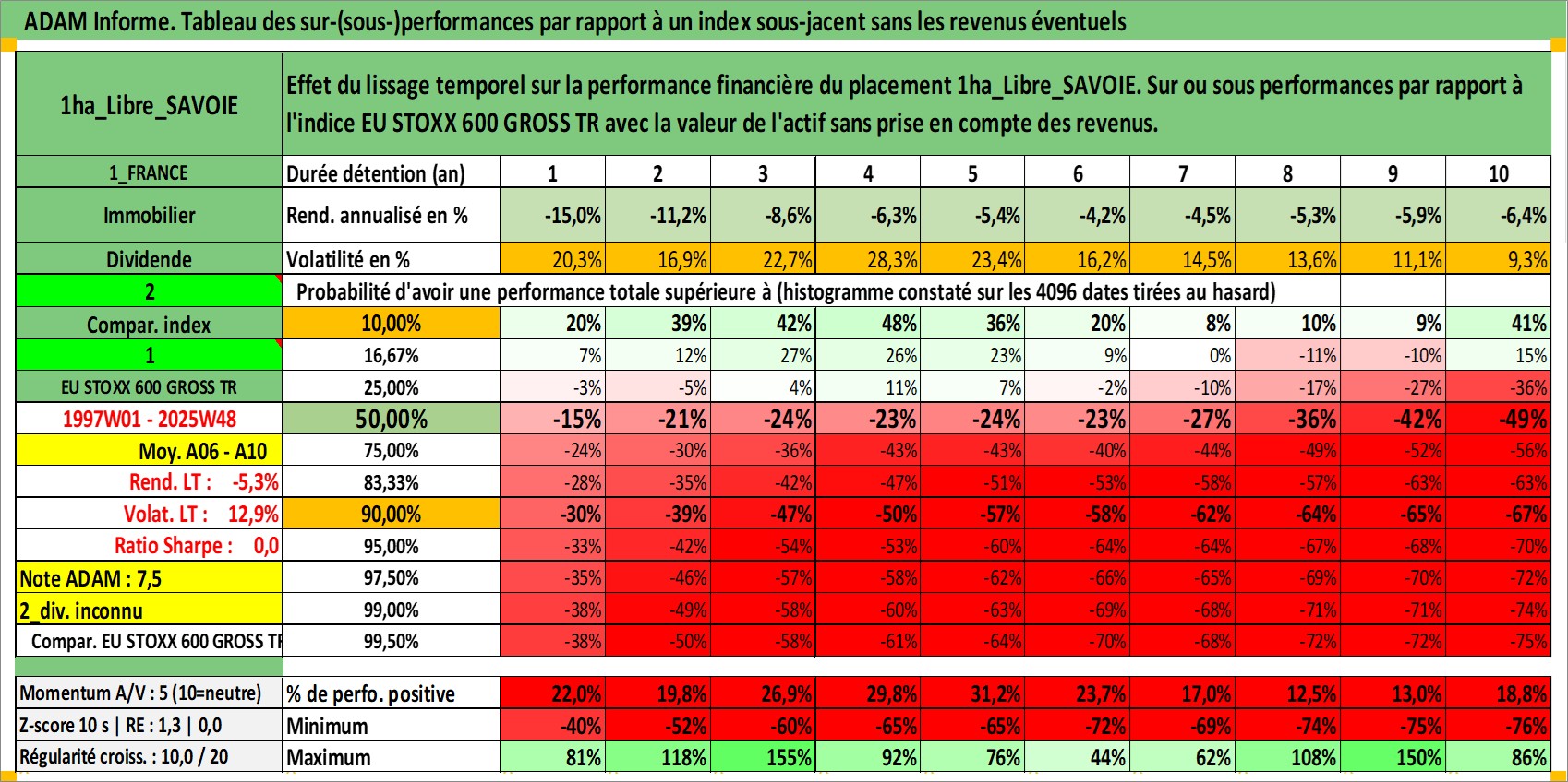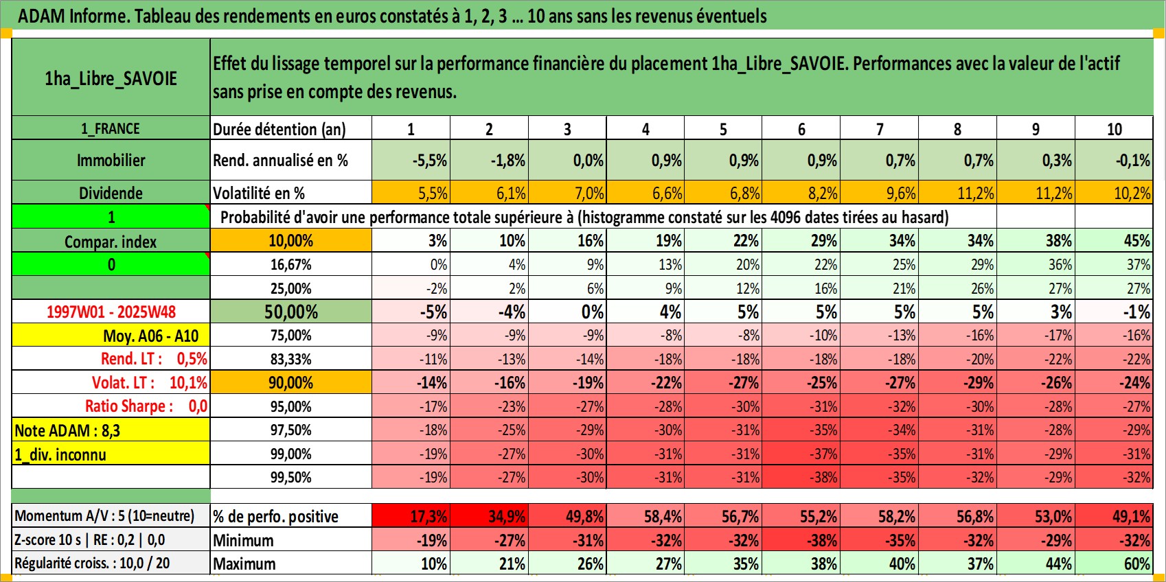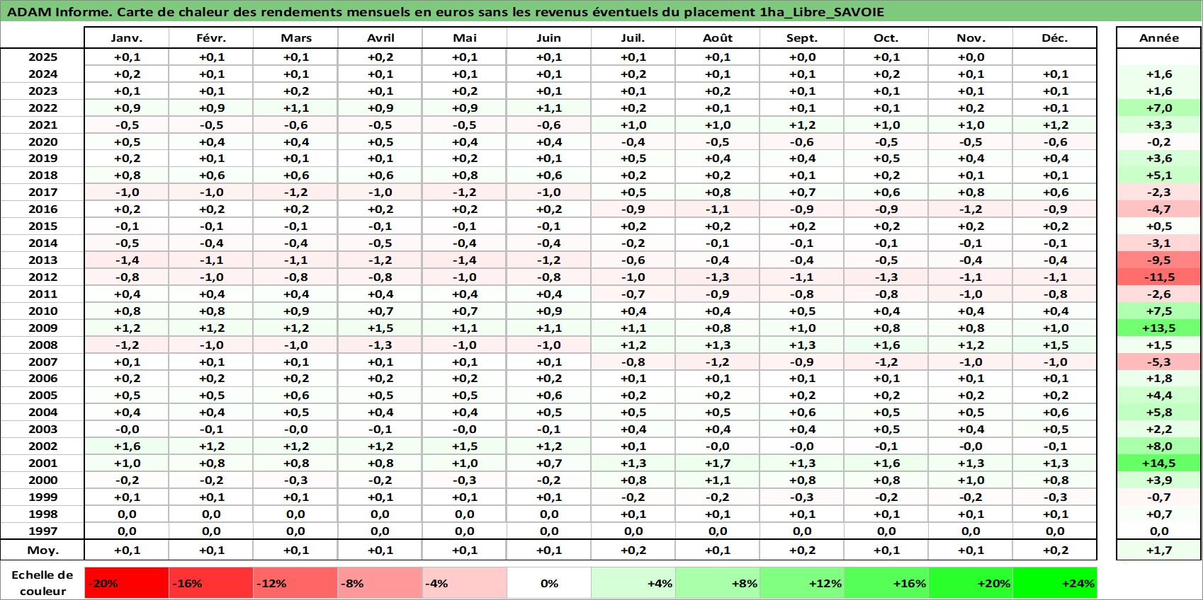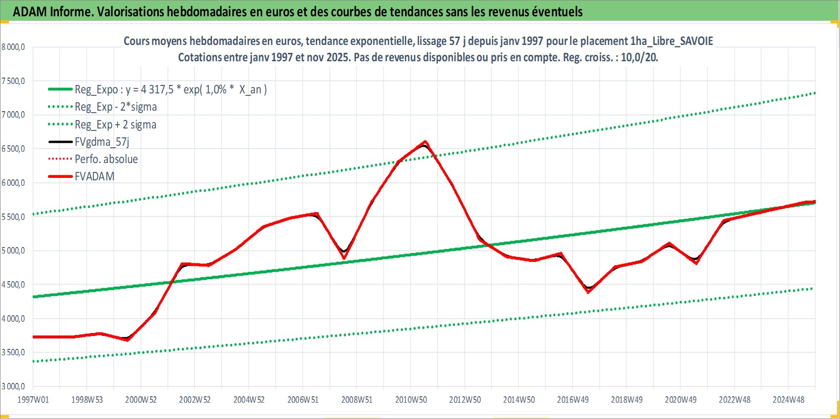 Site dédié aux investisseursPage dédiée sur site financeAnalyse des valorisations hebdomadaires de l'actif 1ha_Libre_SAVOIE. Cet actif est cote en EUR. Les valorisations couvrent les semaines 1997W01 a 2025W48. Les fermages de ce bien foncier sont pris egaux a 2,5% annuels de la valeur venale du bien.