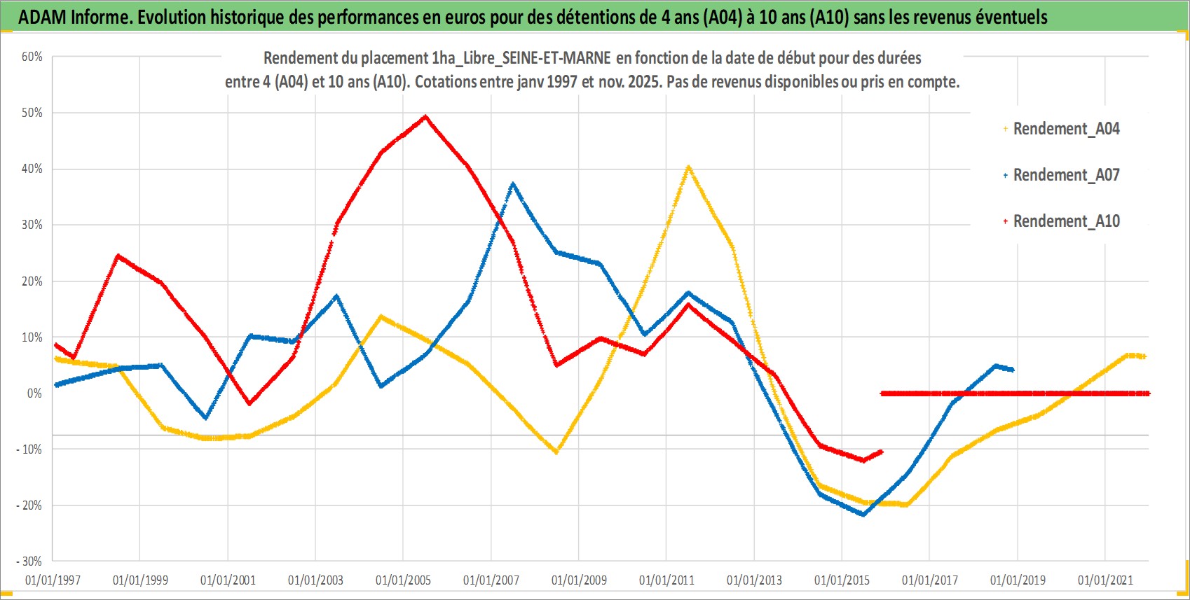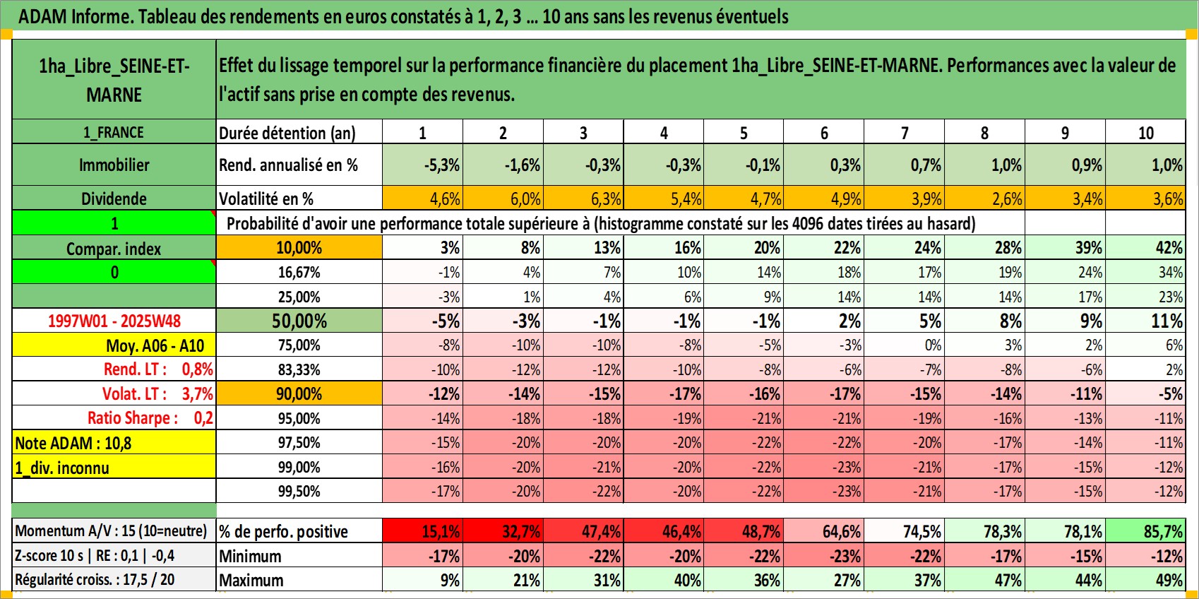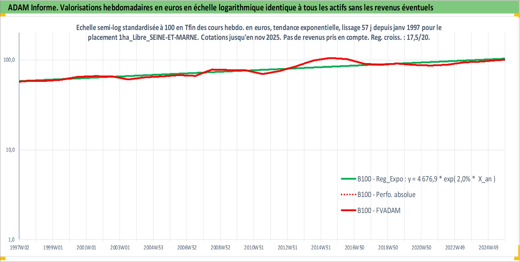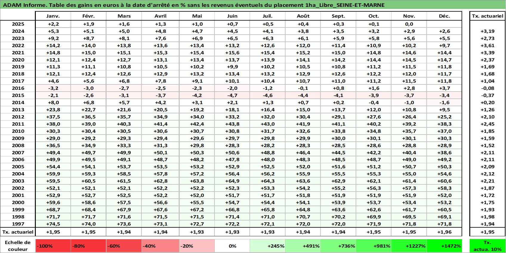 Site dédié aux investisseursPage dédiée sur site financeAnalyse des valorisations hebdomadaires de l'actif 1ha_Libre_SEINE-ET-MARNE. Cet actif est cote en EUR. Les valorisations couvrent les semaines 1997W01 a 2025W48. Les fermages de ce bien foncier sont pris egaux a 2,5% annuels de la valeur venale du bien.