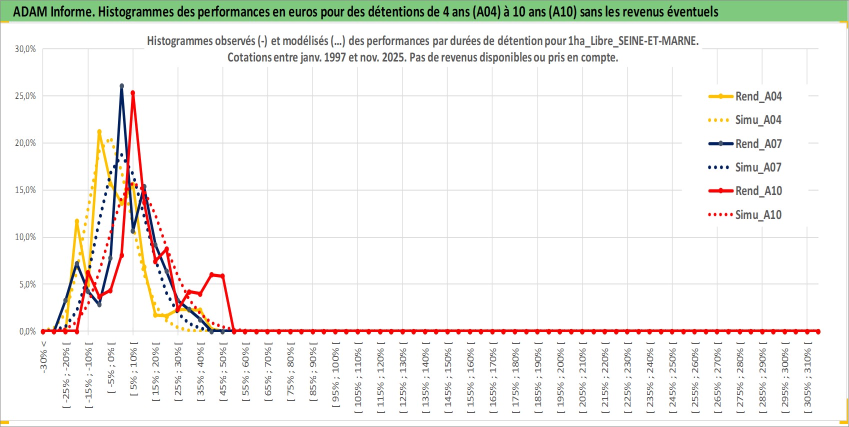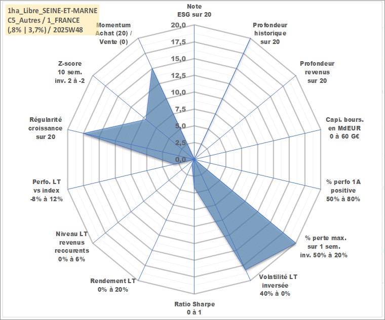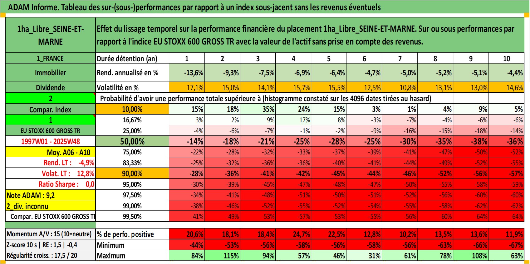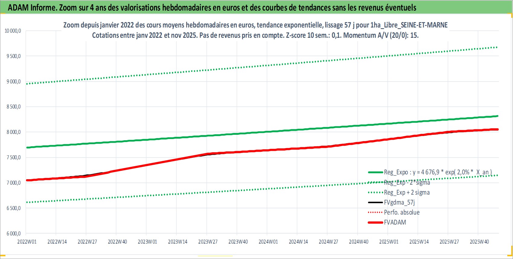 Site dédié aux investisseursPage dédiée sur site financeAnalyse des valorisations hebdomadaires de l'actif 1ha_Libre_SEINE-ET-MARNE. Cet actif est cote en EUR. Les valorisations couvrent les semaines 1997W01 a 2025W48. Les fermages de ce bien foncier sont pris egaux a 2,5% annuels de la valeur venale du bien.