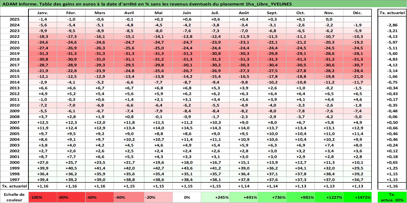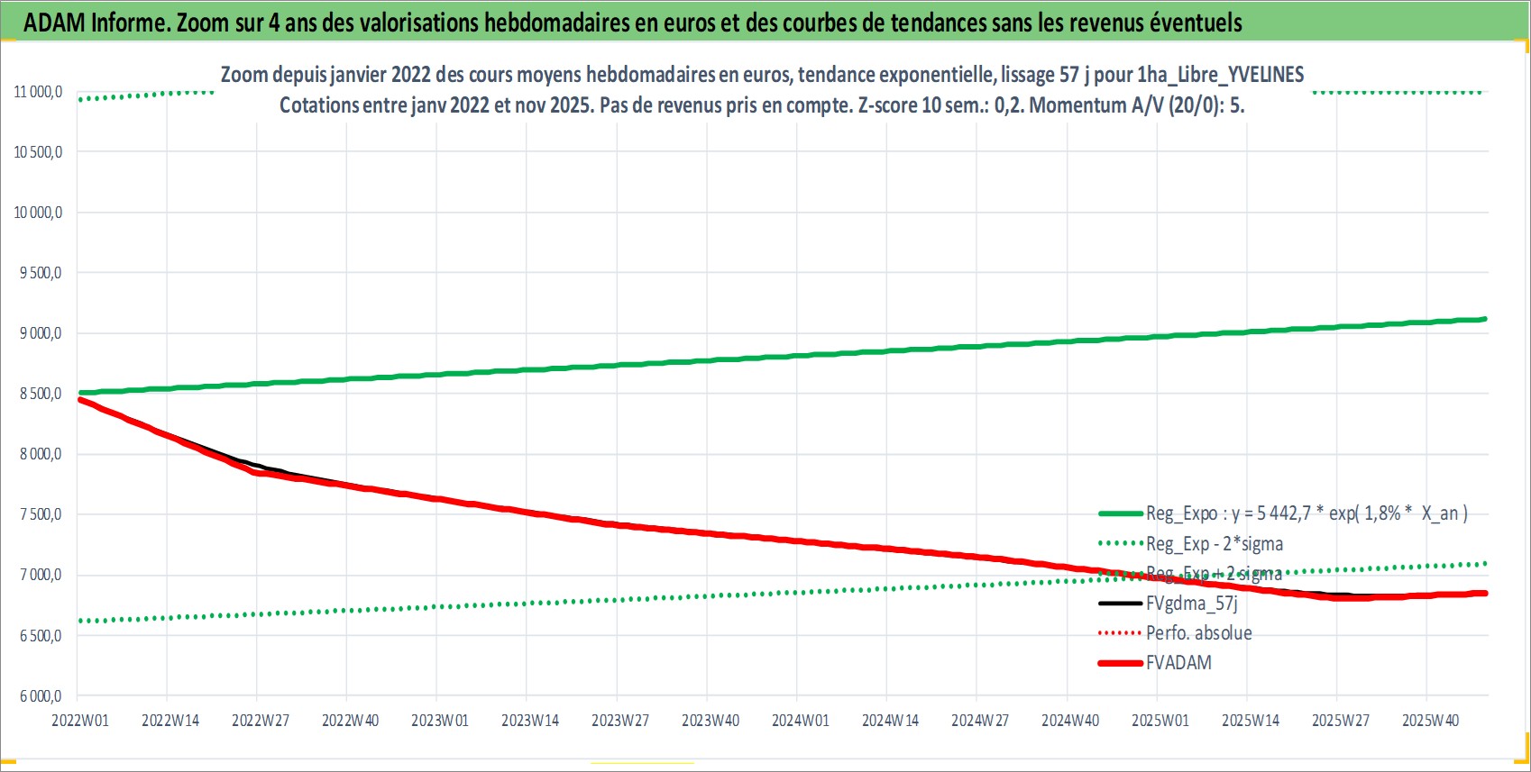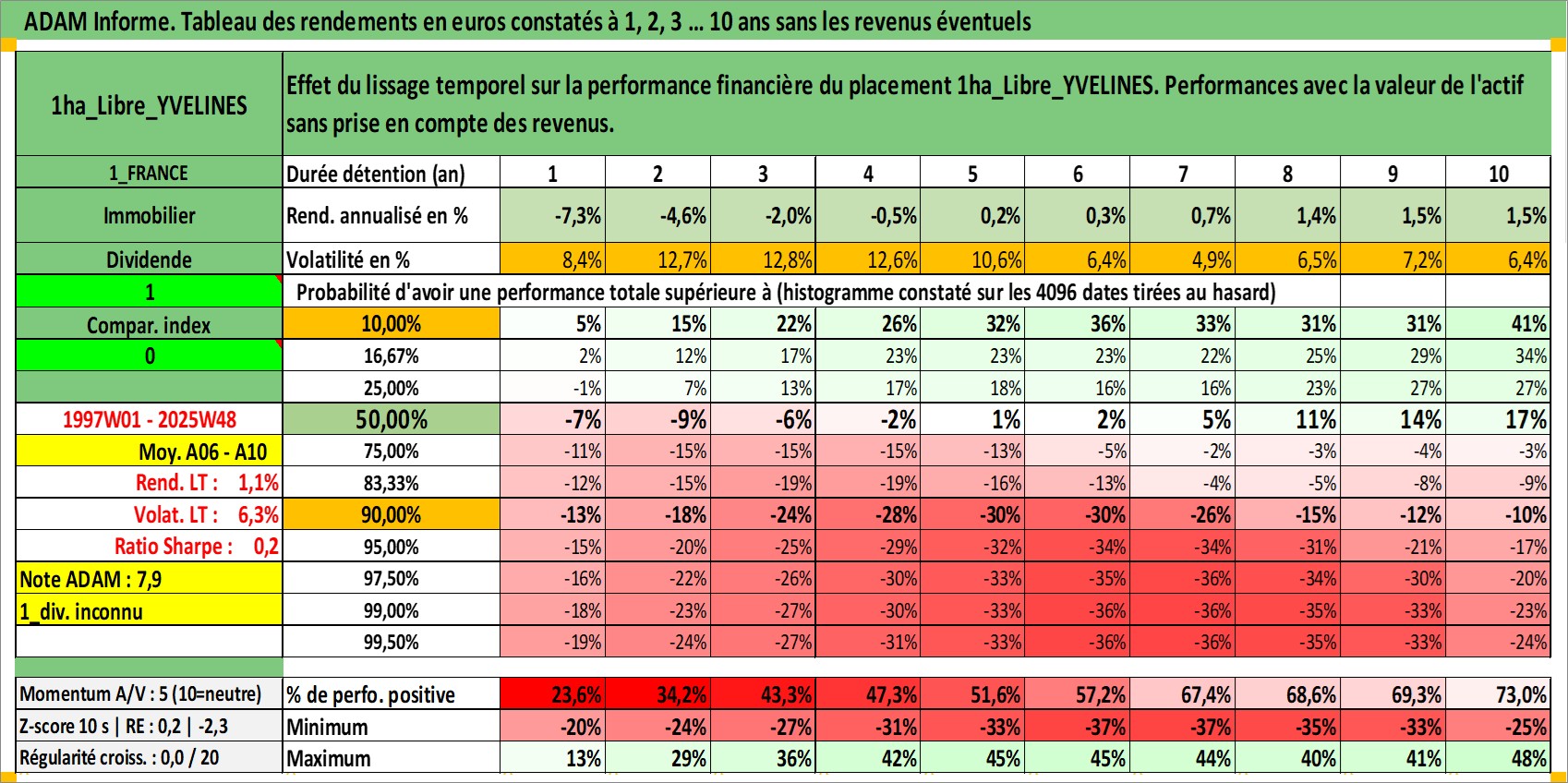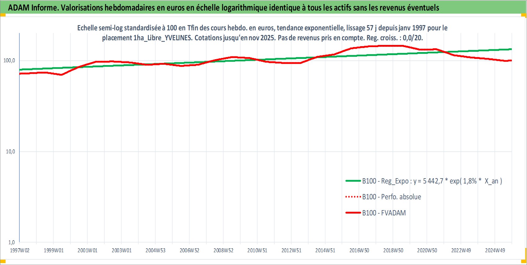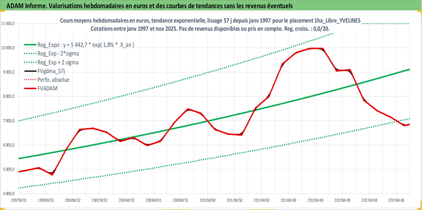 Site dédié aux investisseursPage dédiée sur site financeAnalyse des valorisations hebdomadaires de l'actif 1ha_Libre_YVELINES. Cet actif est cote en EUR. Les valorisations couvrent les semaines 1997W01 a 2025W48. Les fermages de ce bien foncier sont pris egaux a 2,5% annuels de la valeur venale du bien.
