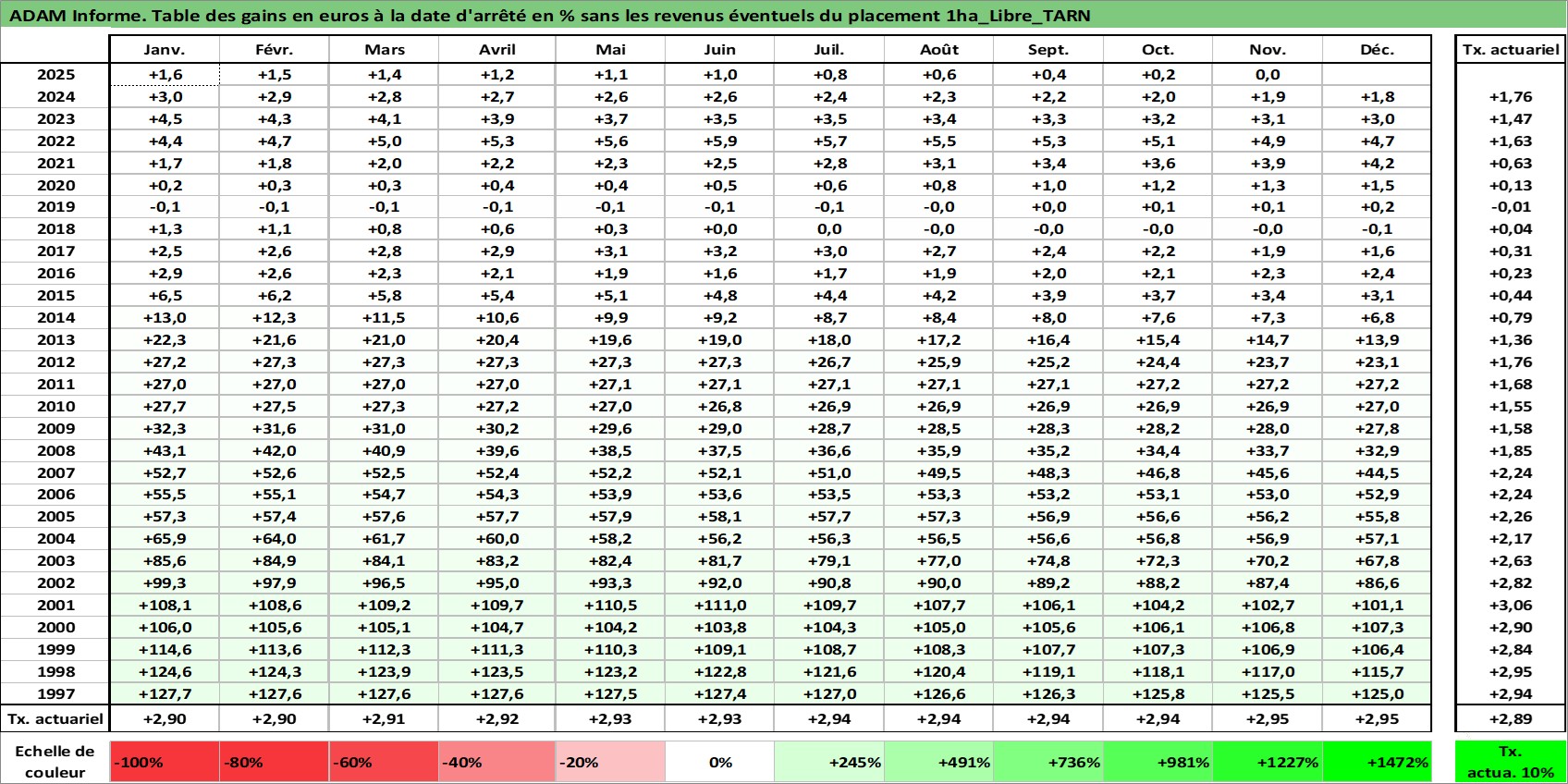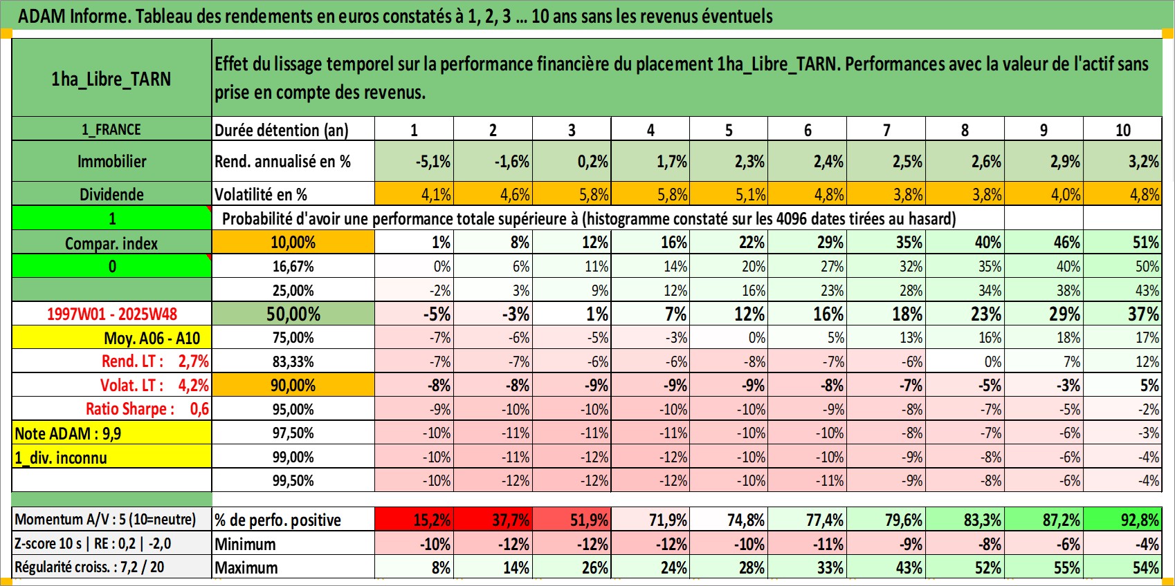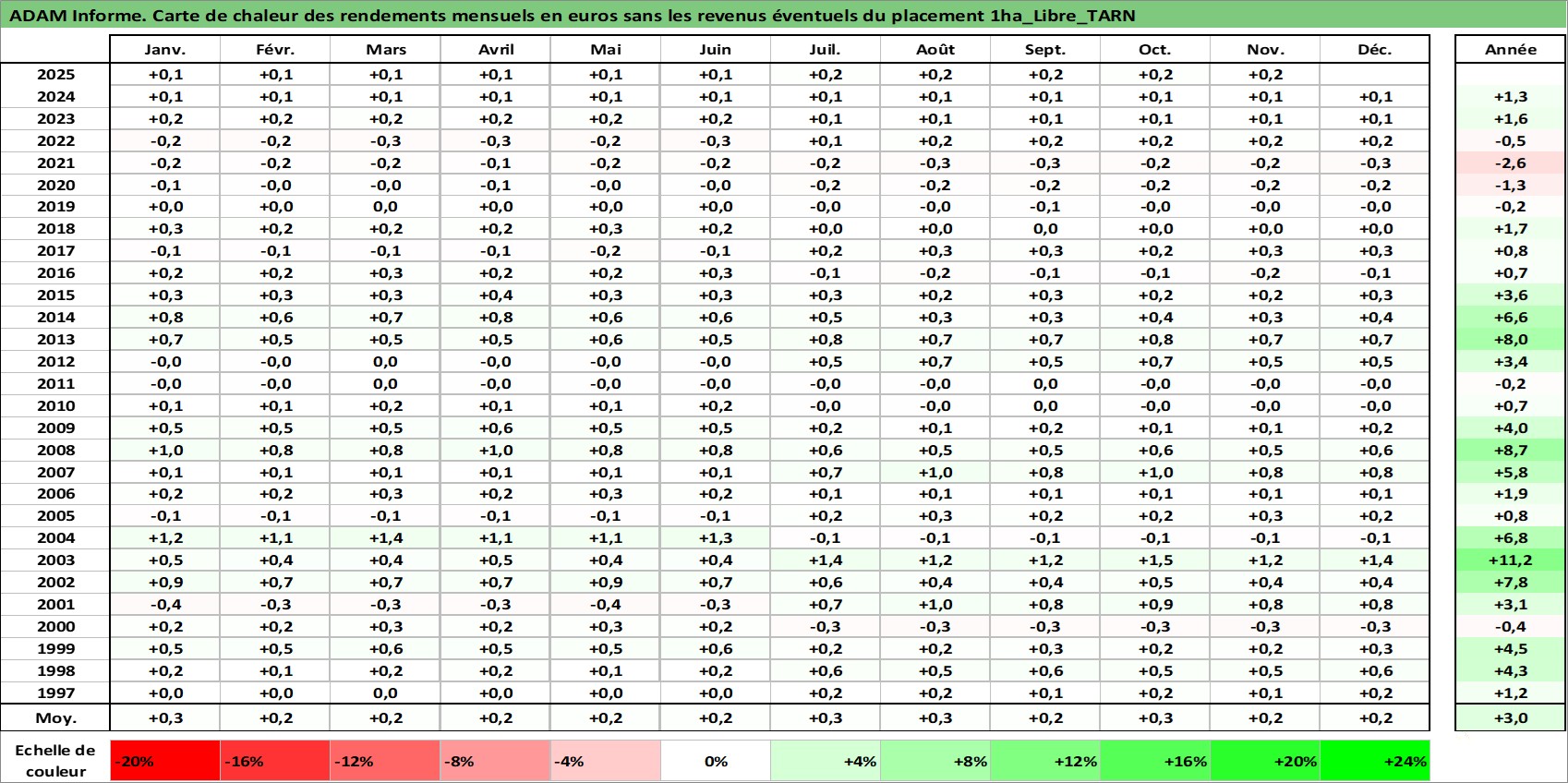 Site dédié aux investisseursPage dédiée sur site financeAnalyse des valorisations hebdomadaires de l'actif 1ha_Libre_TARN. Cet actif est cote en EUR. Les valorisations couvrent les semaines 1997W01 a 2025W48. Les fermages de ce bien foncier sont pris egaux a 2,5% annuels de la valeur venale du bien.