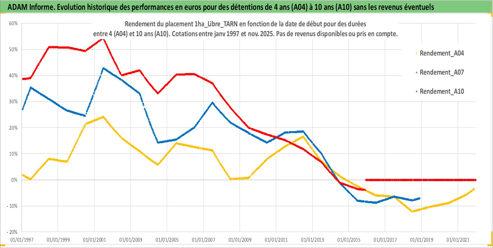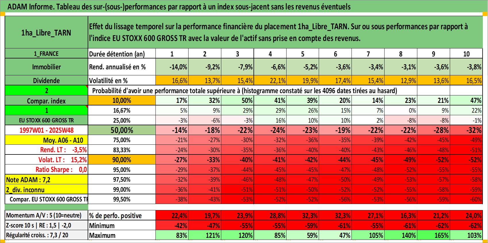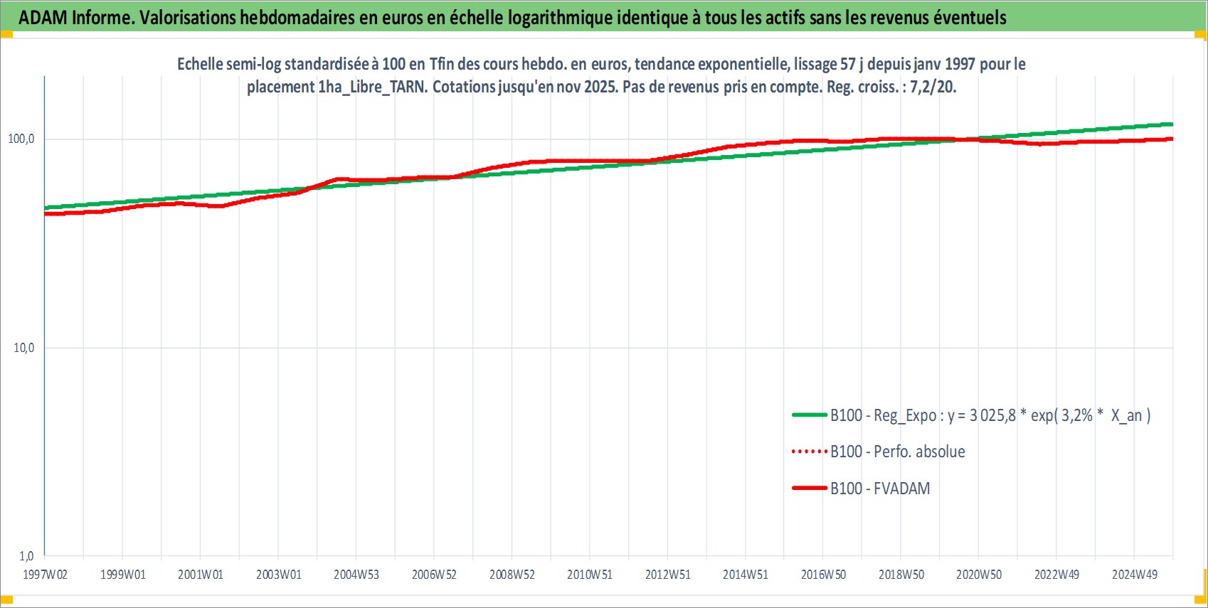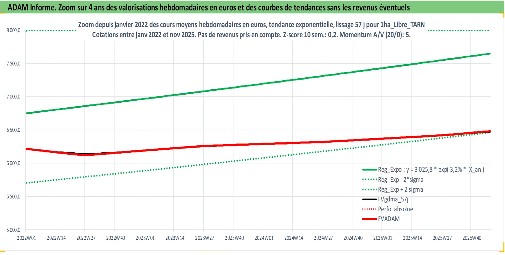 Site dédié aux investisseursPage dédiée sur site financeAnalyse des valorisations hebdomadaires de l'actif 1ha_Libre_TARN. Cet actif est cote en EUR. Les valorisations couvrent les semaines 1997W01 a 2025W48. Les fermages de ce bien foncier sont pris egaux a 2,5% annuels de la valeur venale du bien.