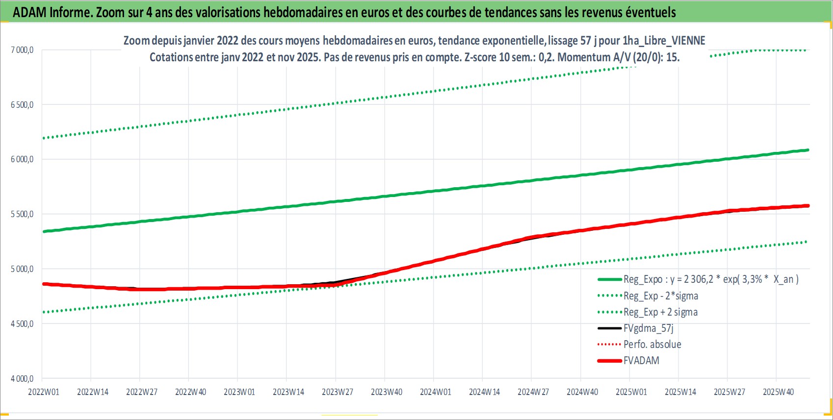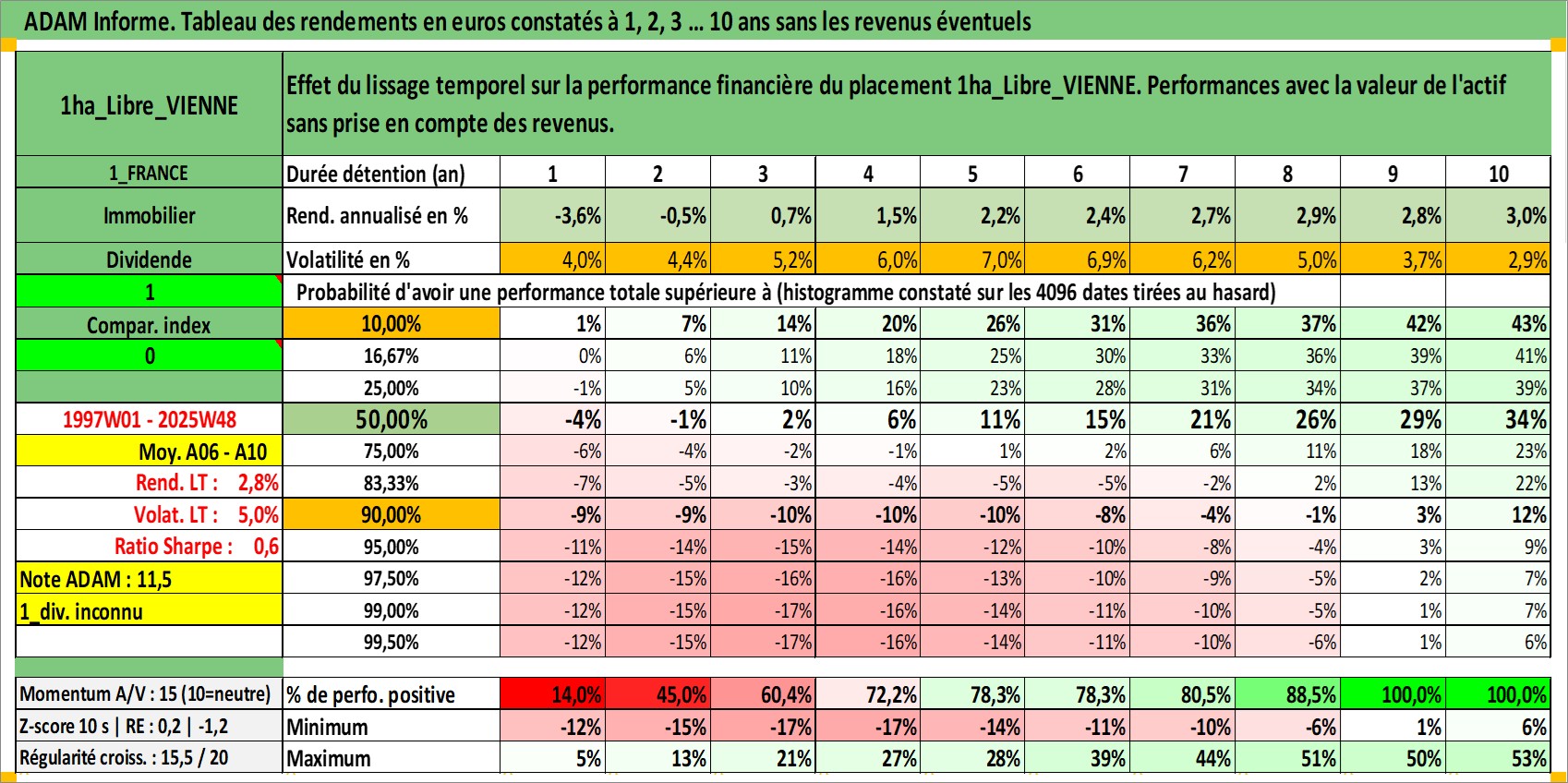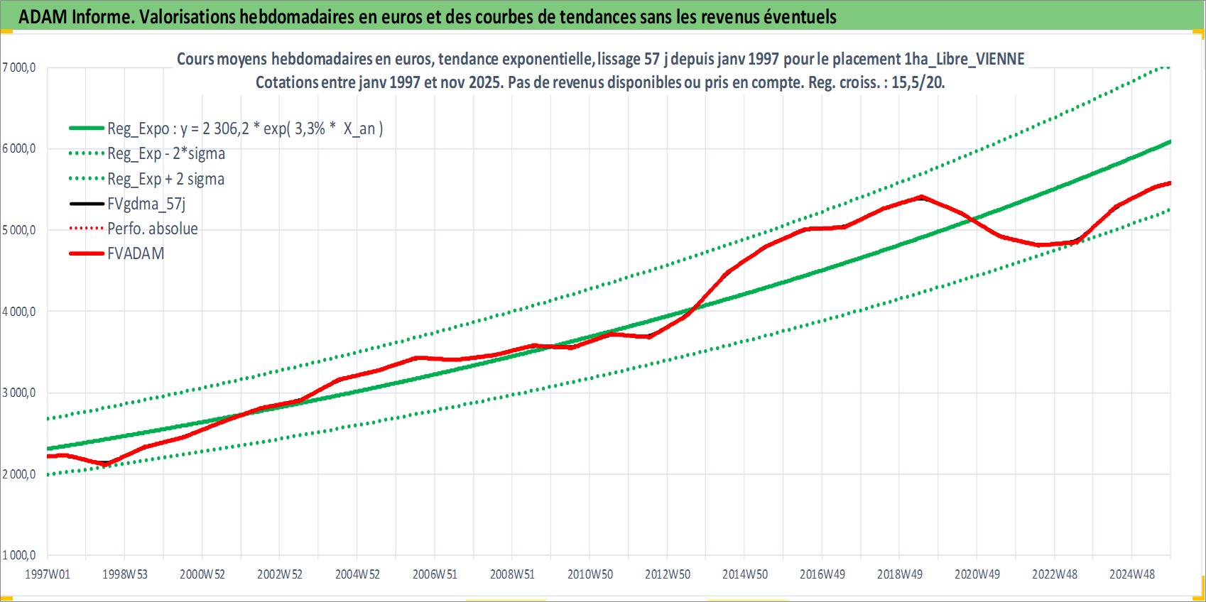 Site dédié aux investisseursPage dédiée sur site financeAnalyse des valorisations hebdomadaires de l'actif 1ha_Libre_VIENNE. Cet actif est cote en EUR. Les valorisations couvrent les semaines 1997W01 a 2025W48. Les fermages de ce bien foncier sont pris egaux a 2,5% annuels de la valeur venale du bien.