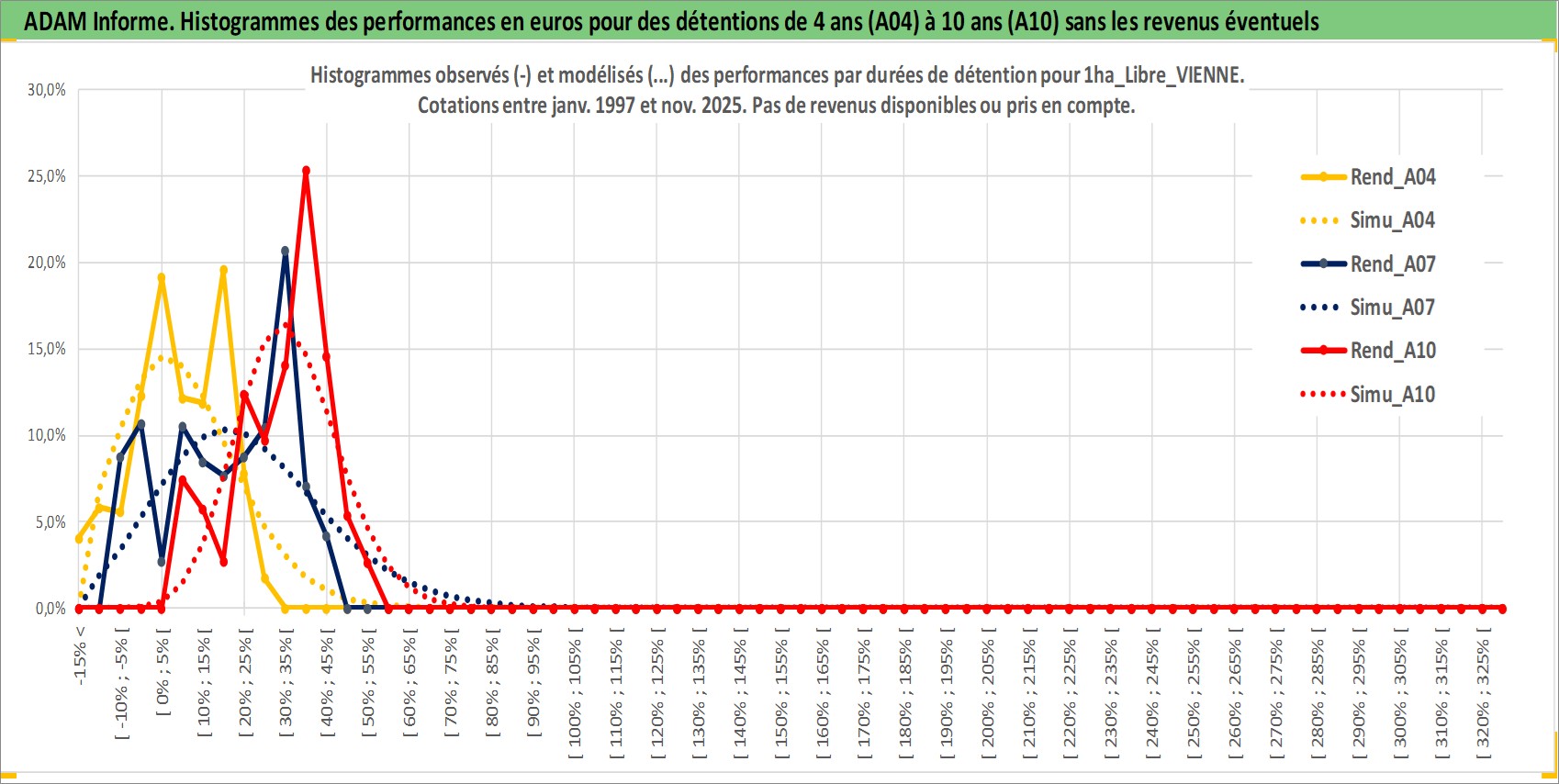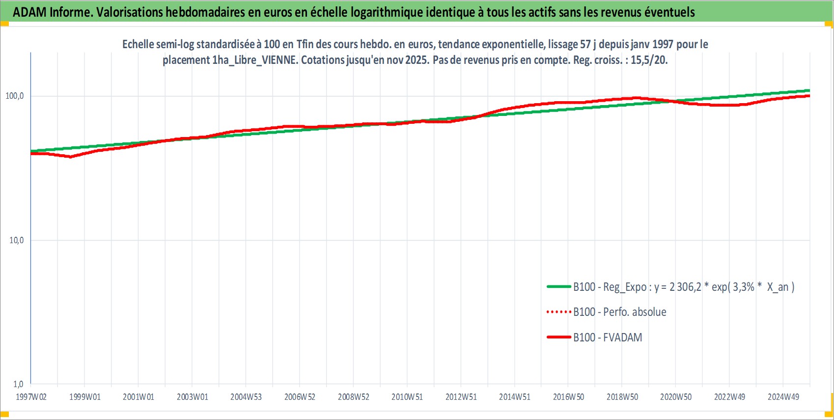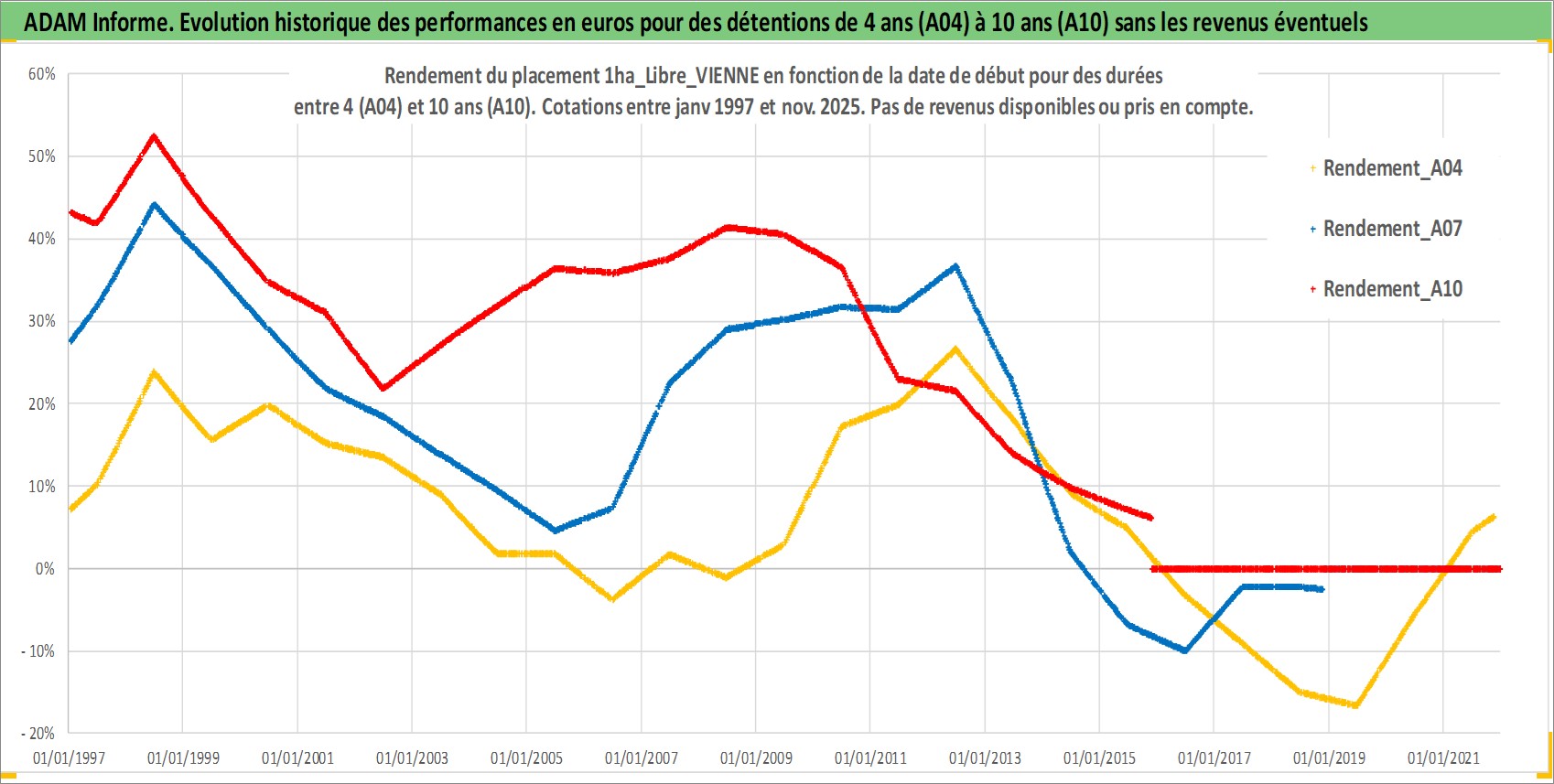 Site dédié aux investisseursPage dédiée sur site financeAnalyse des valorisations hebdomadaires de l'actif 1ha_Libre_VIENNE. Cet actif est cote en EUR. Les valorisations couvrent les semaines 1997W01 a 2025W48. Les fermages de ce bien foncier sont pris egaux a 2,5% annuels de la valeur venale du bien.
