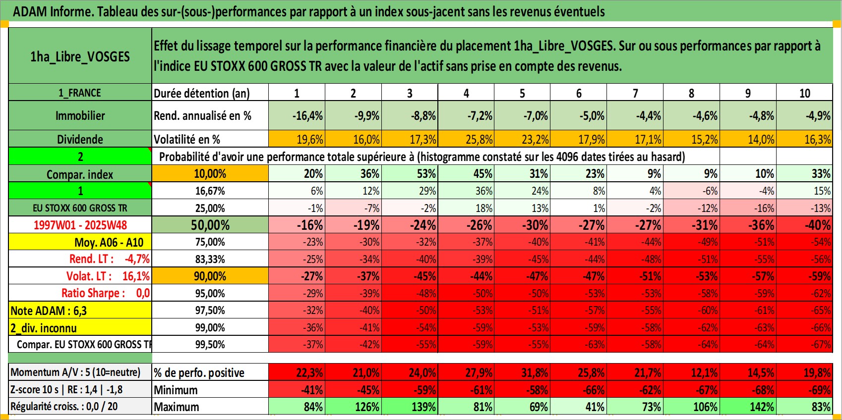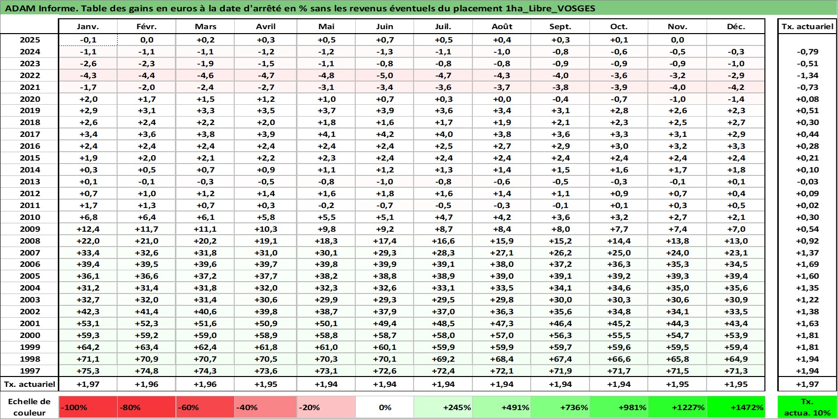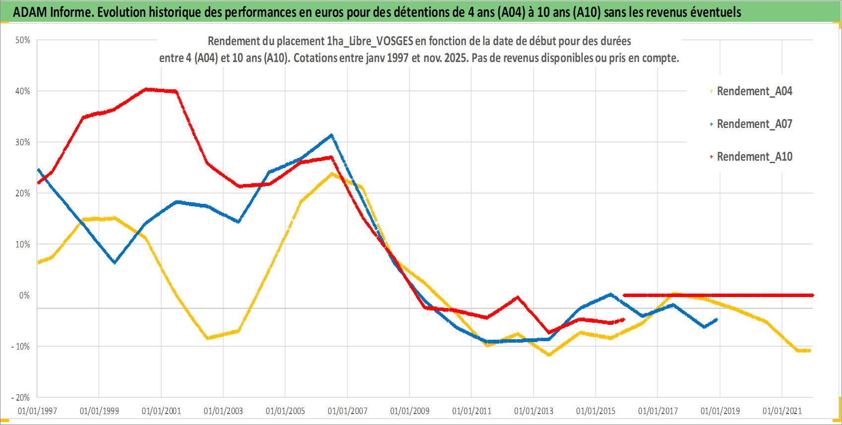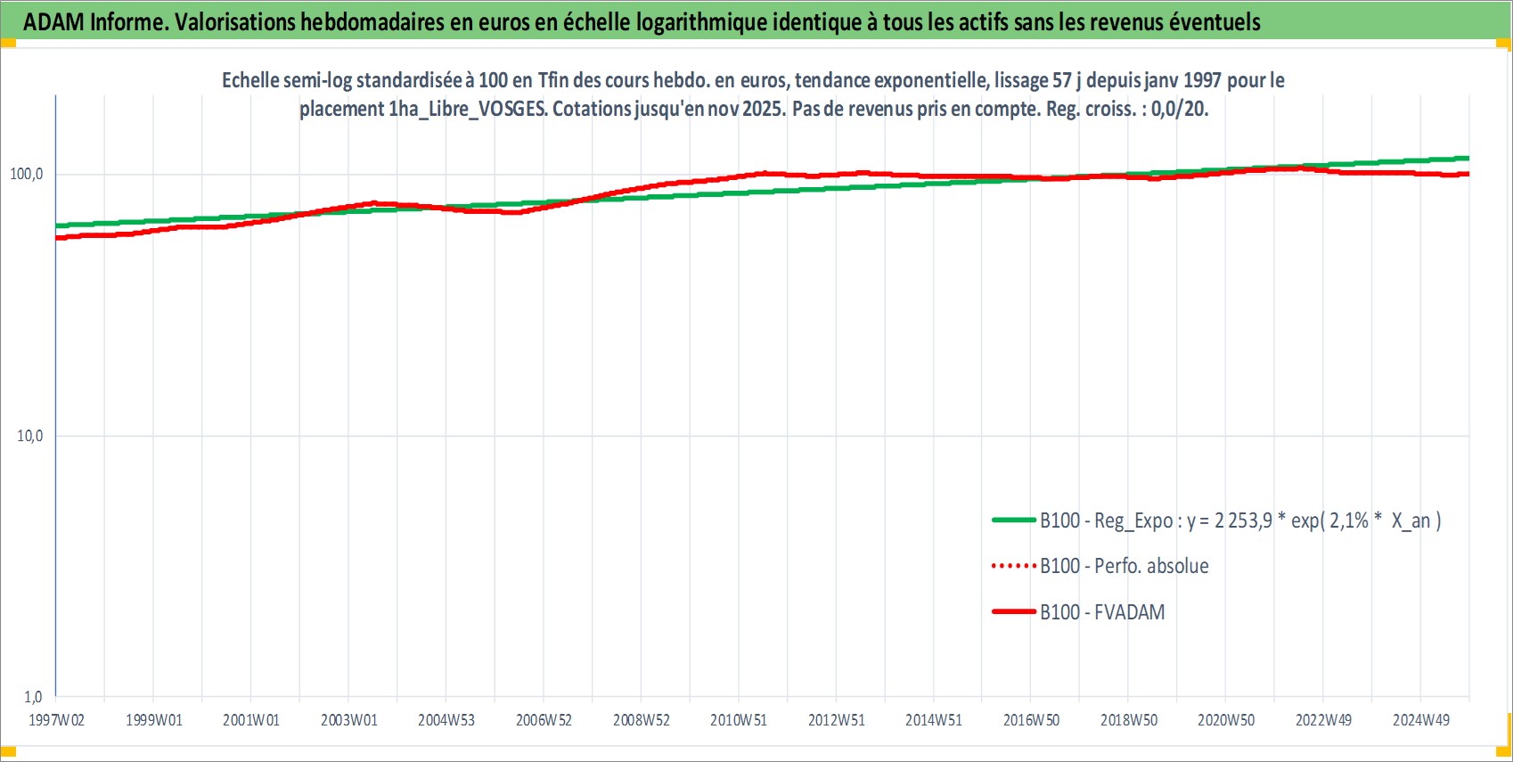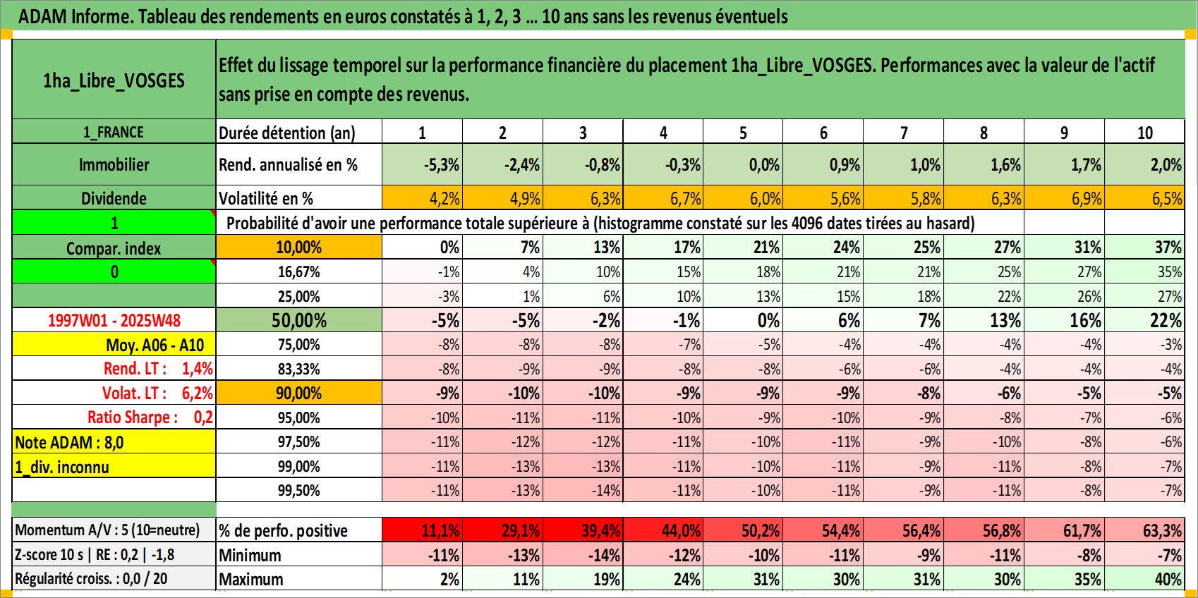 Site dédié aux investisseursPage dédiée sur site financeAnalyse des valorisations hebdomadaires de l'actif 1ha_Libre_VOSGES. Cet actif est cote en EUR. Les valorisations couvrent les semaines 1997W01 a 2025W48. Les fermages de ce bien foncier sont pris egaux a 2,5% annuels de la valeur venale du bien.