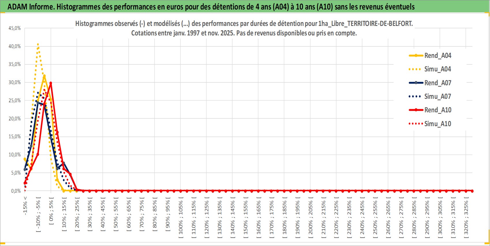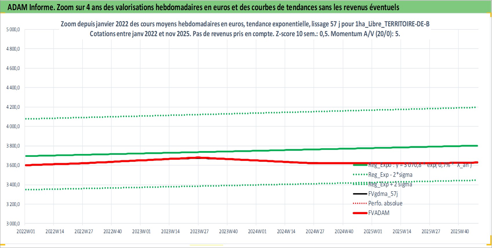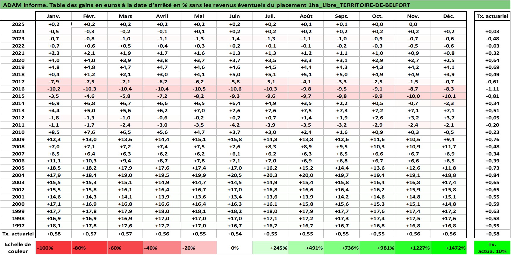 Site dédié aux investisseursPage dédiée sur site financeAnalyse des valorisations hebdomadaires de l'actif 1ha_Libre_TERRITOIRE-DE-BELFORT. Cet actif est cote en EUR. Les valorisations couvrent les semaines 1997W01 a 2025W48. Les fermages de ce bien foncier sont pris egaux a 2,5% annuels de la valeur venale du bien.