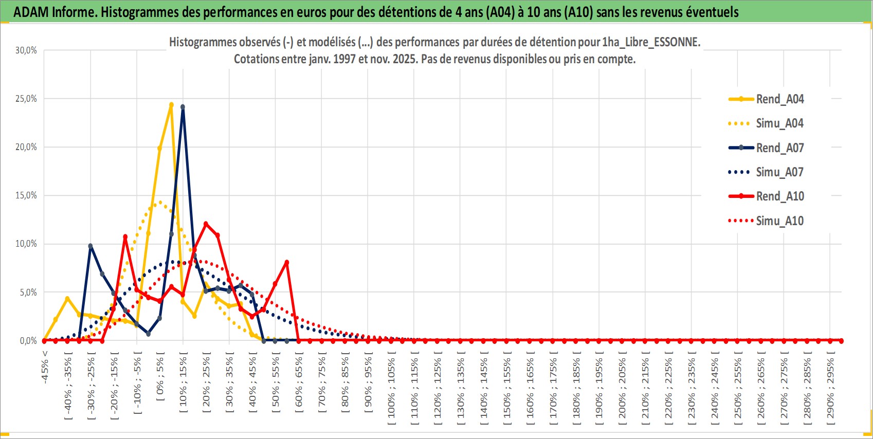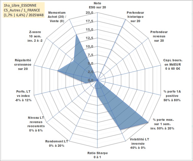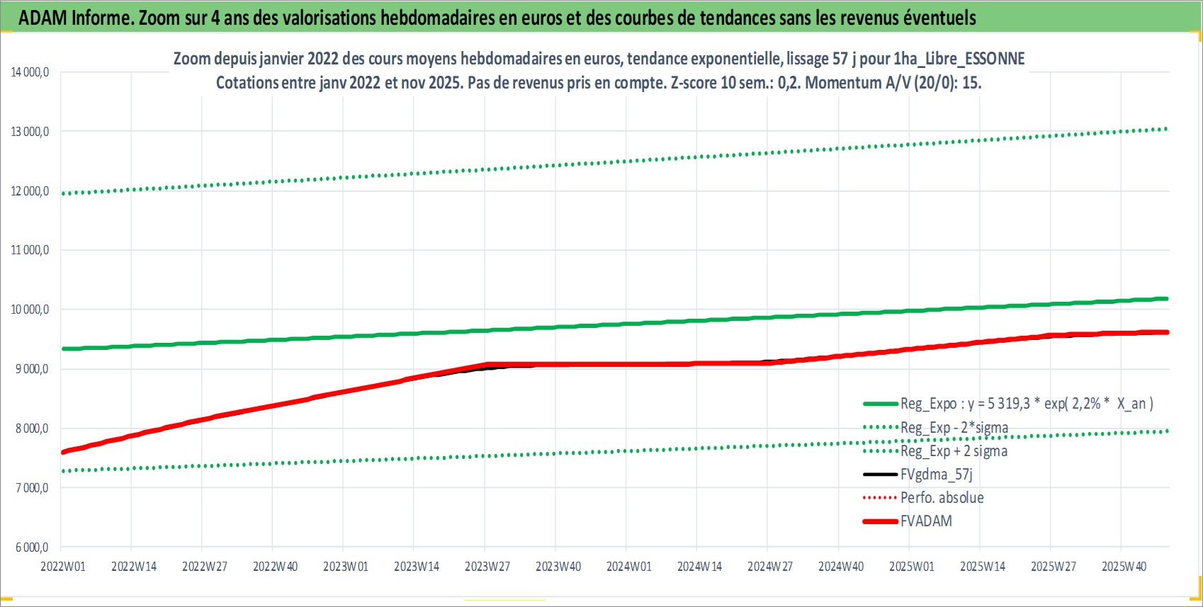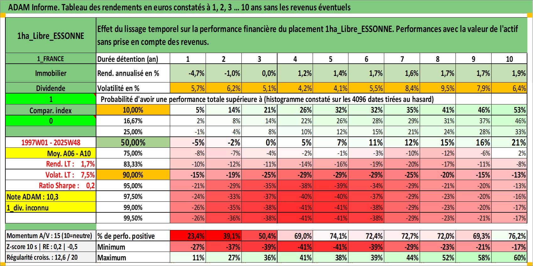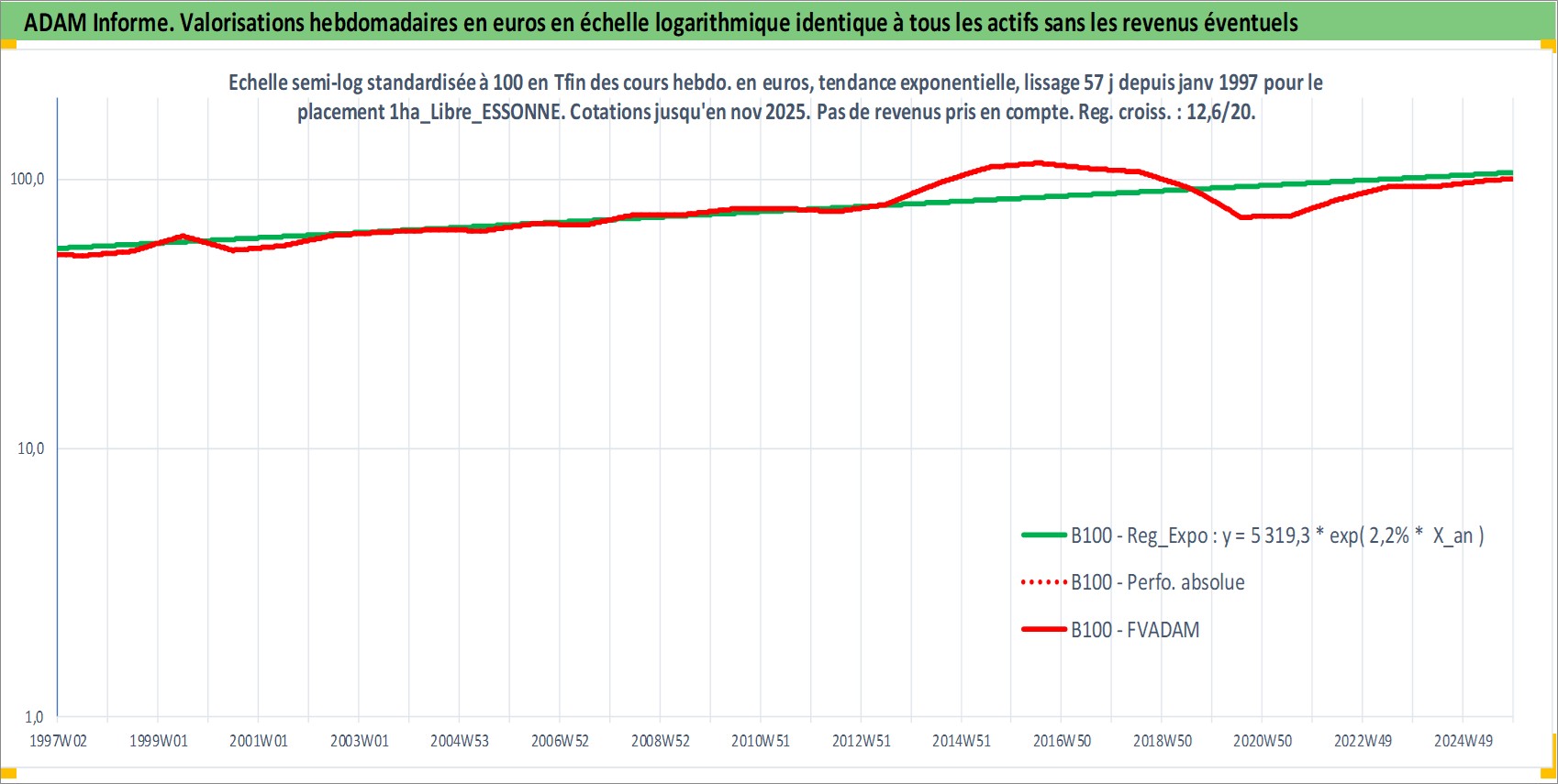 Site dédié aux investisseursPage dédiée sur site financeAnalyse des valorisations hebdomadaires de l'actif 1ha_Libre_ESSONNE. Cet actif est cote en EUR. Les valorisations couvrent les semaines 1997W01 a 2025W48. Les fermages de ce bien foncier sont pris egaux a 2,5% annuels de la valeur venale du bien.