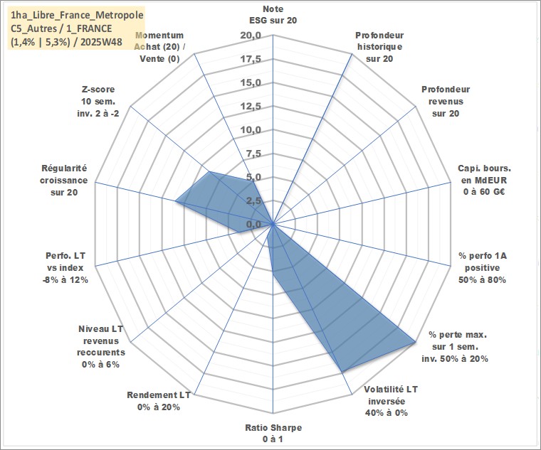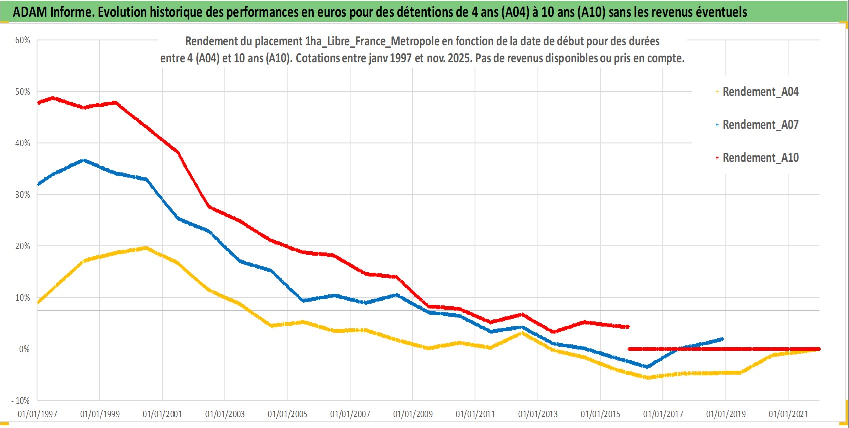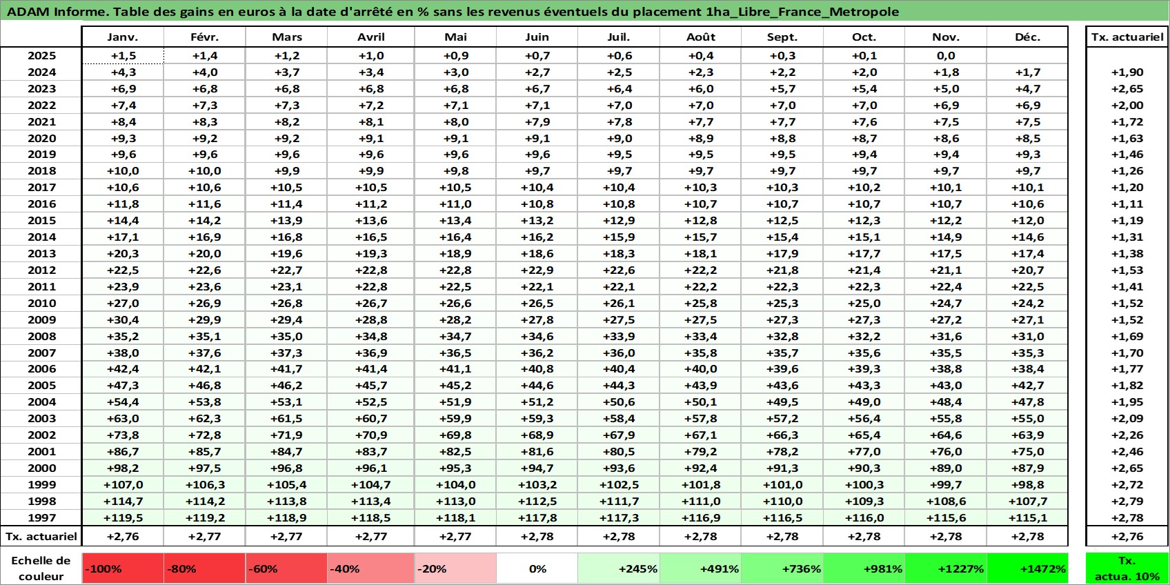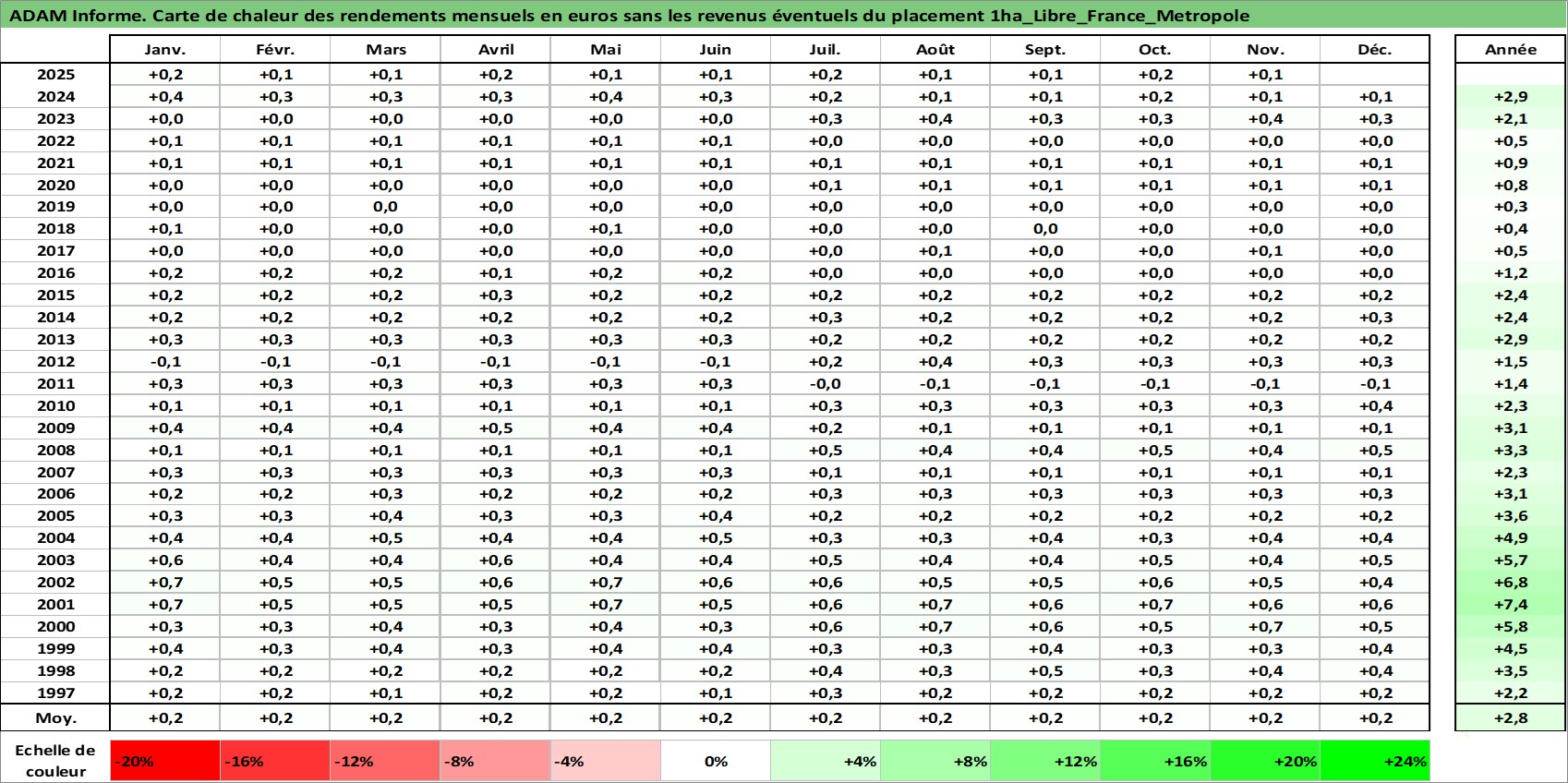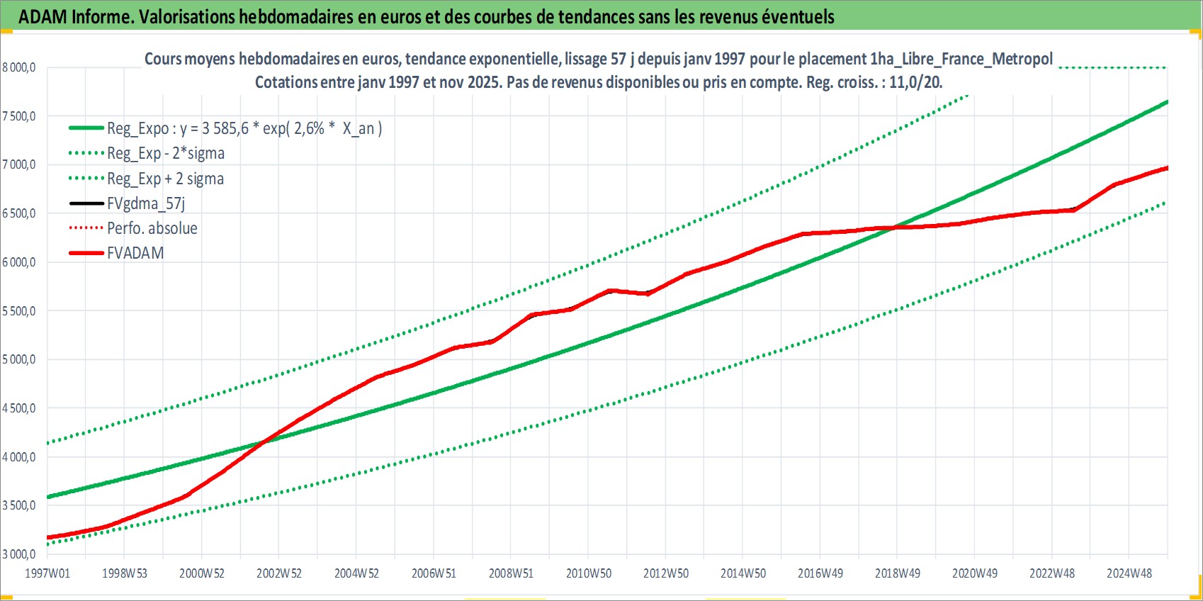 Site dédié aux investisseursPage dédiée sur site financeAnalyse des valorisations hebdomadaires de l'actif 1ha_Libre_France_Metropole. Cet actif est cote en EUR. Les valorisations couvrent les semaines 1997W01 a 2025W48. Les fermages de ce bien foncier sont pris egaux a 2,5% annuels de la valeur venale du bien.