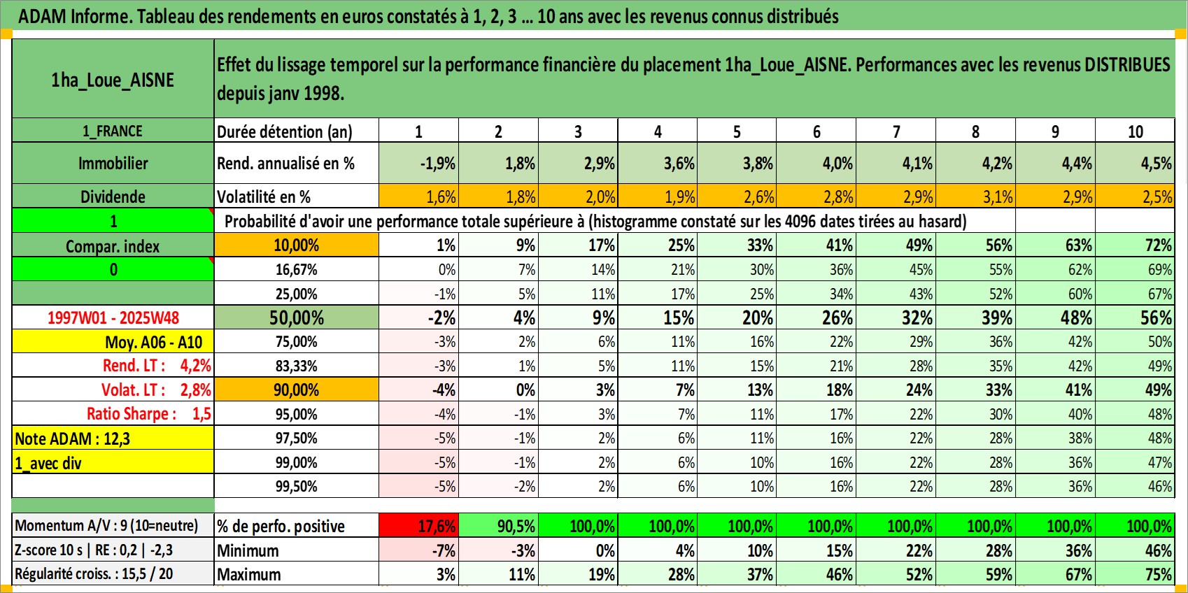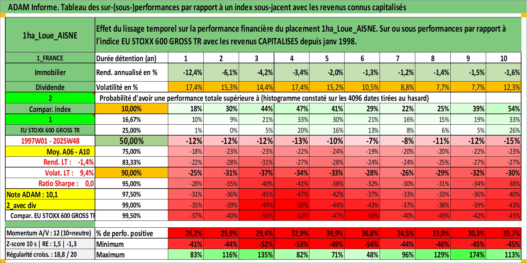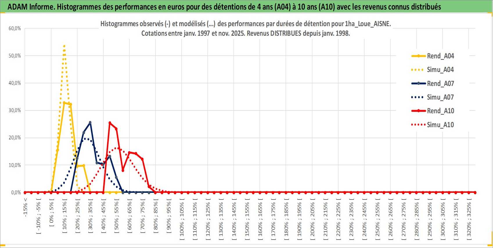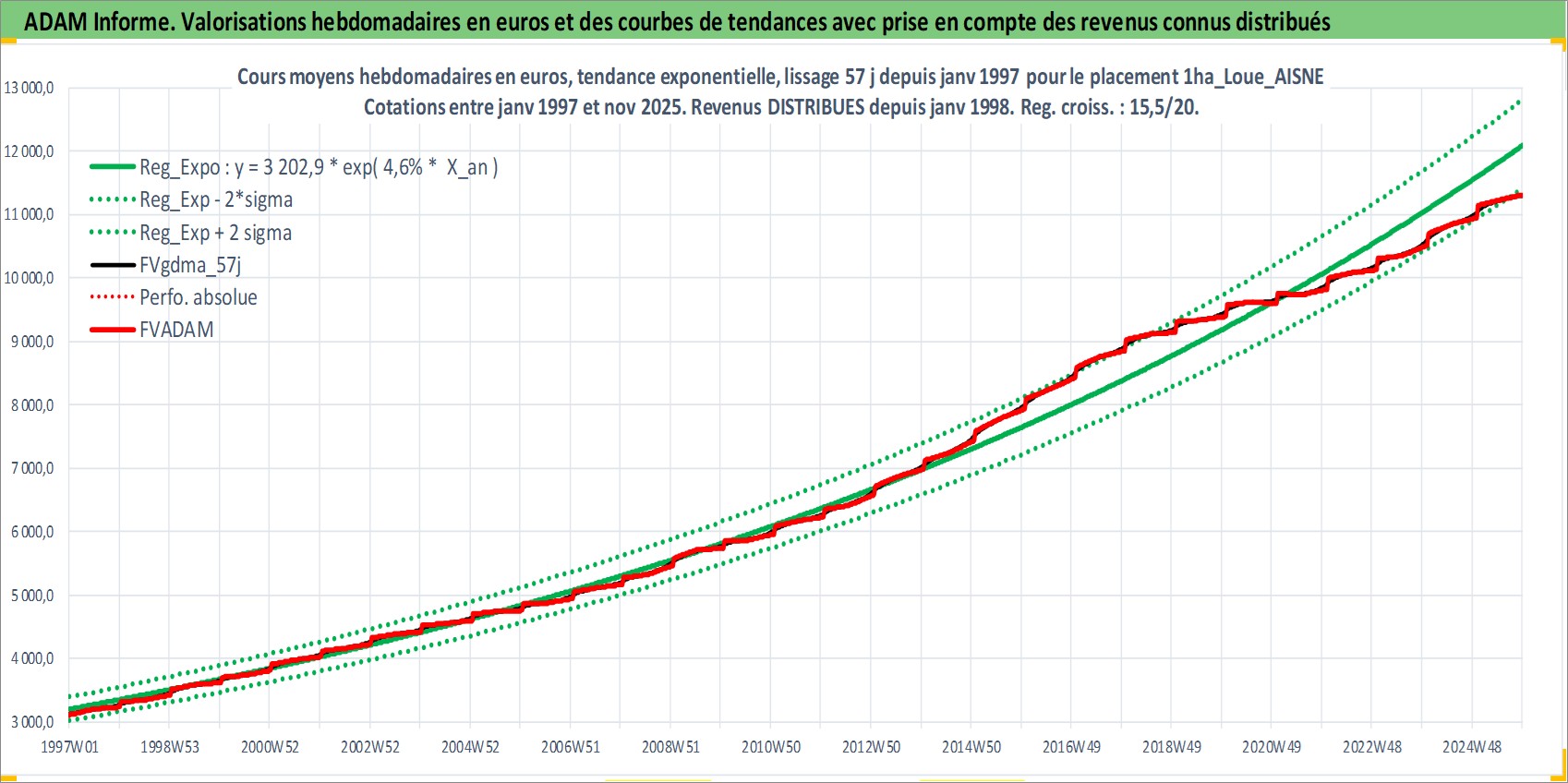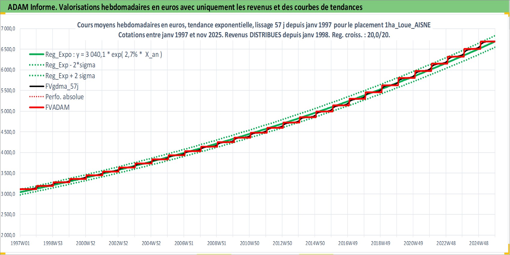 Site dédié aux investisseursPage dédiée sur site financeAnalyse des valorisations hebdomadaires de l'actif 1ha_Loue_AISNE. Cet actif est cote en EUR. Les valorisations couvrent les semaines 1997W01 a 2025W48. Les fermages de ce bien foncier sont pris egaux a 2,5% annuels de la valeur venale du bien.