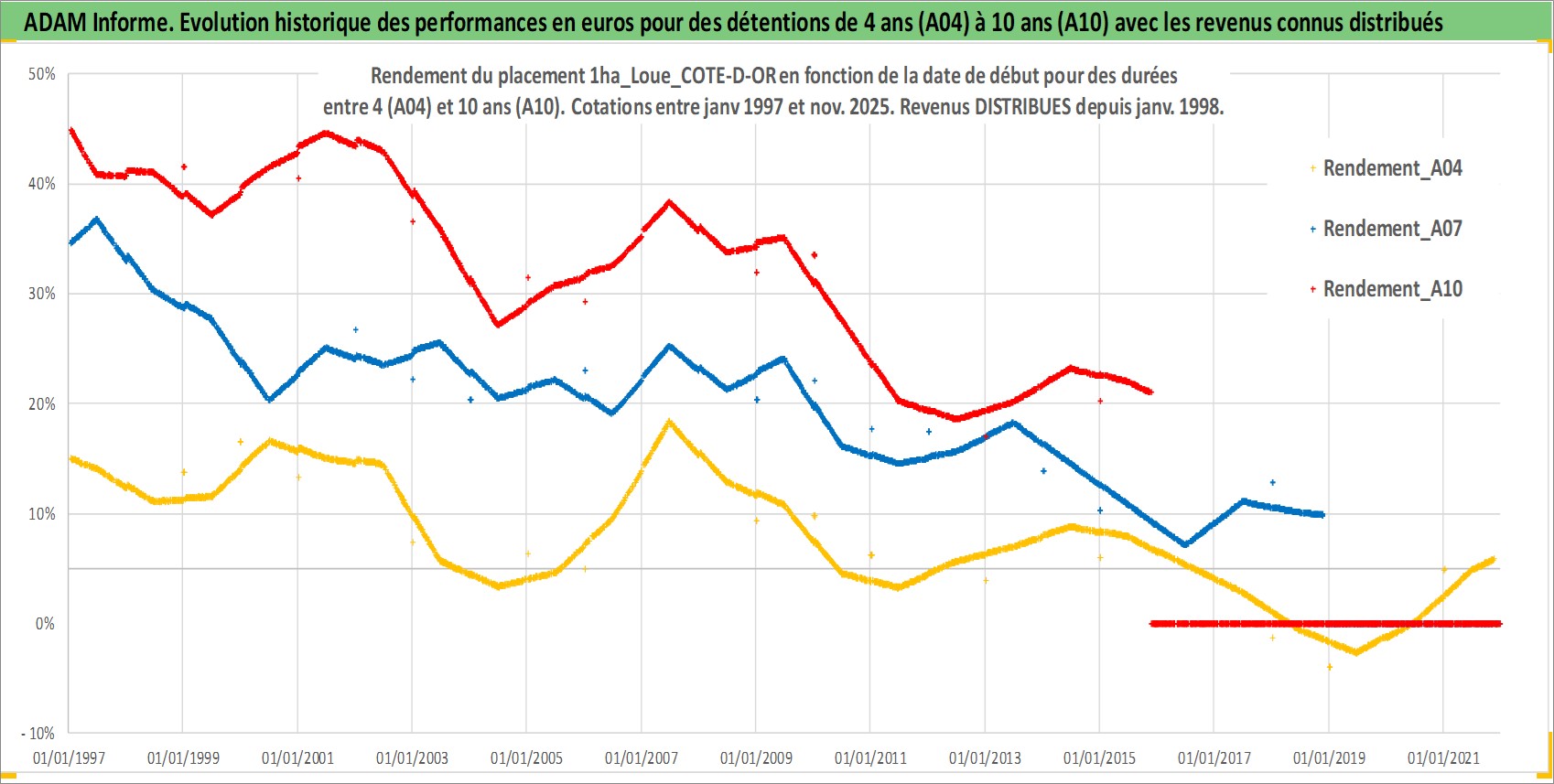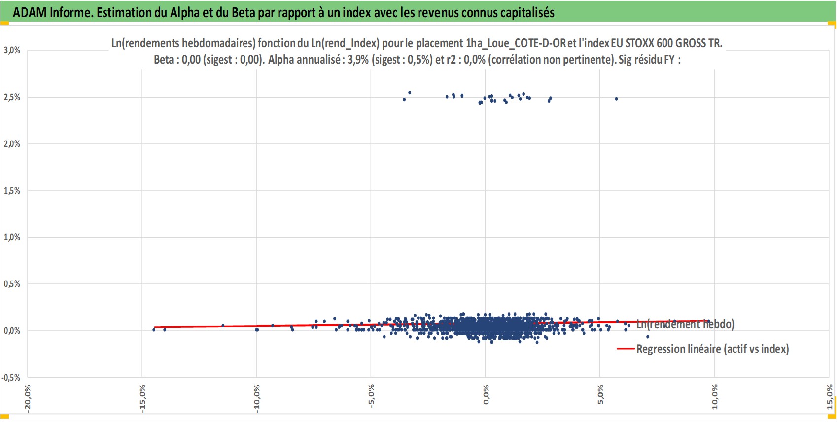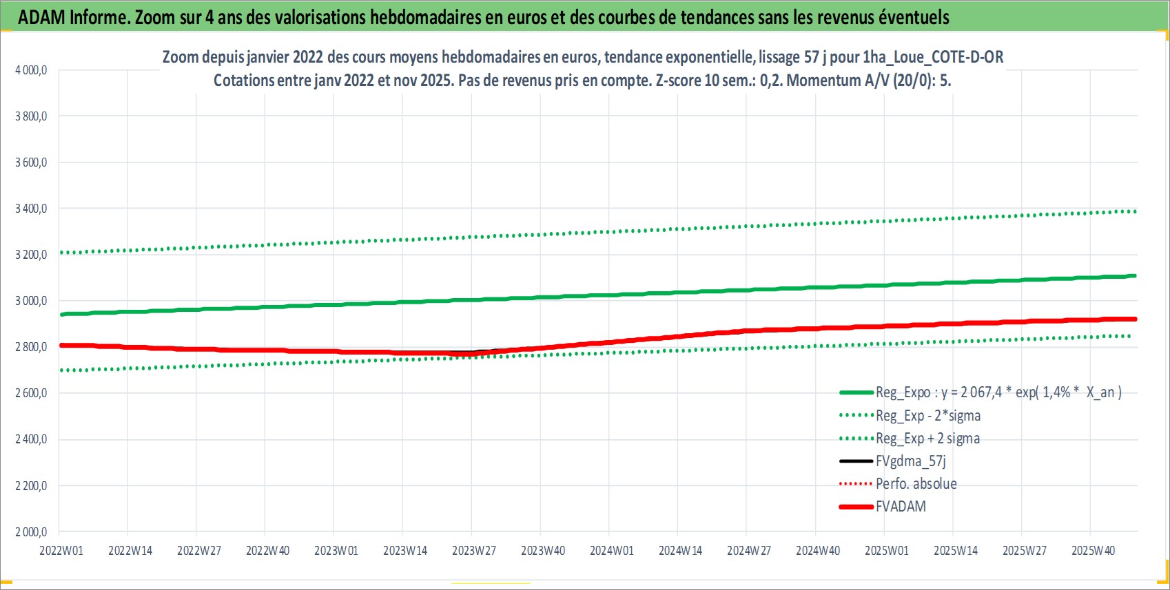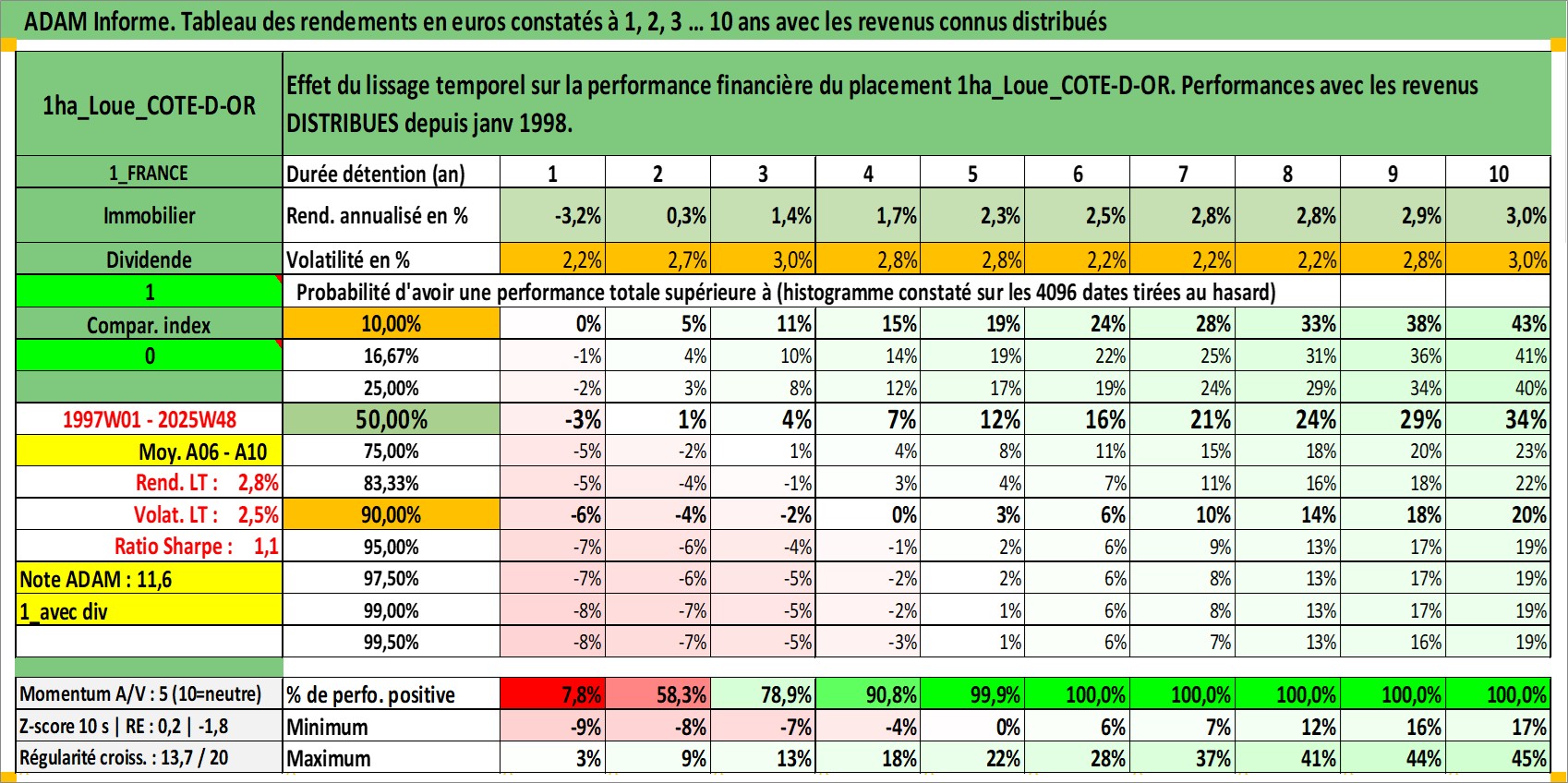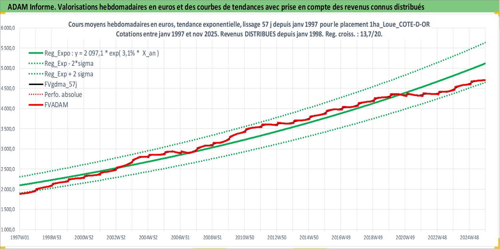 Site dédié aux investisseursPage dédiée sur site financeAnalyse des valorisations hebdomadaires de l'actif 1ha_Loue_COTE-D-OR. Cet actif est cote en EUR. Les valorisations couvrent les semaines 1997W01 a 2025W48. Les fermages de ce bien foncier sont pris egaux a 2,5% annuels de la valeur venale du bien.