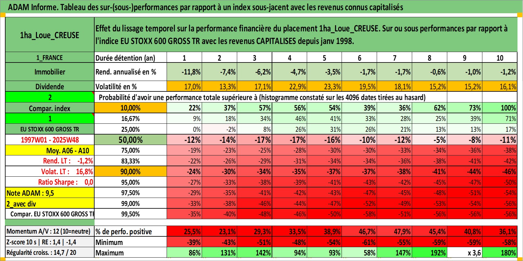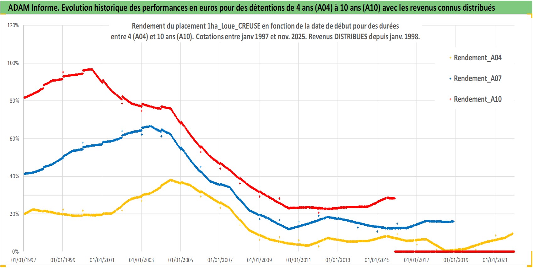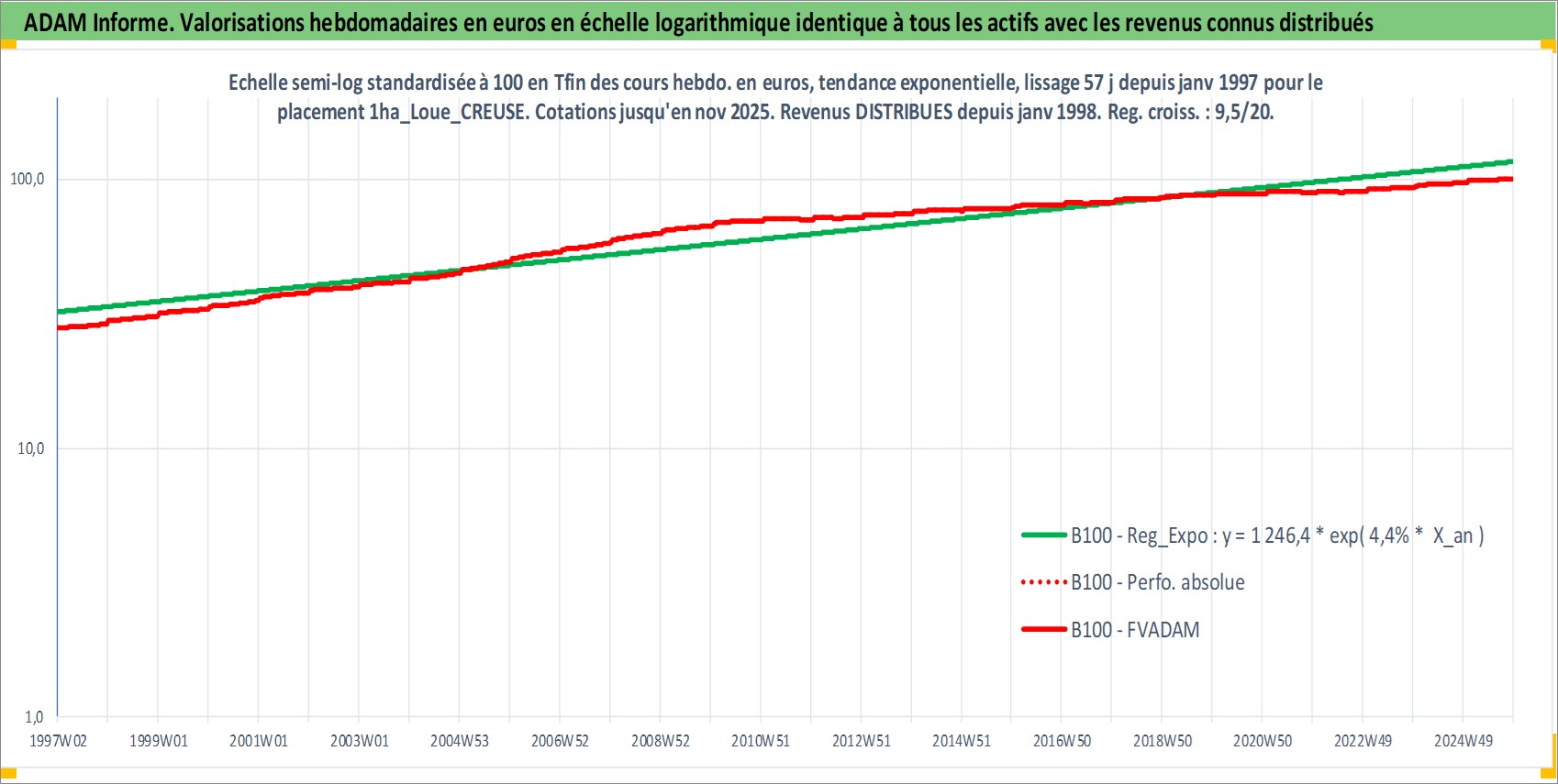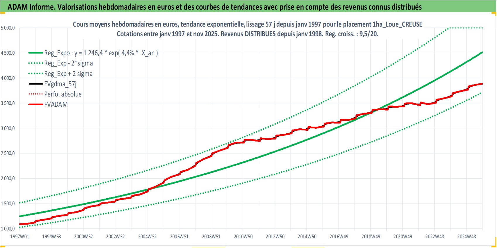 Site dédié aux investisseursPage dédiée sur site financeAnalyse des valorisations hebdomadaires de l'actif 1ha_Loue_CREUSE. Cet actif est cote en EUR. Les valorisations couvrent les semaines 1997W01 a 2025W48. Les fermages de ce bien foncier sont pris egaux a 2,5% annuels de la valeur venale du bien.
