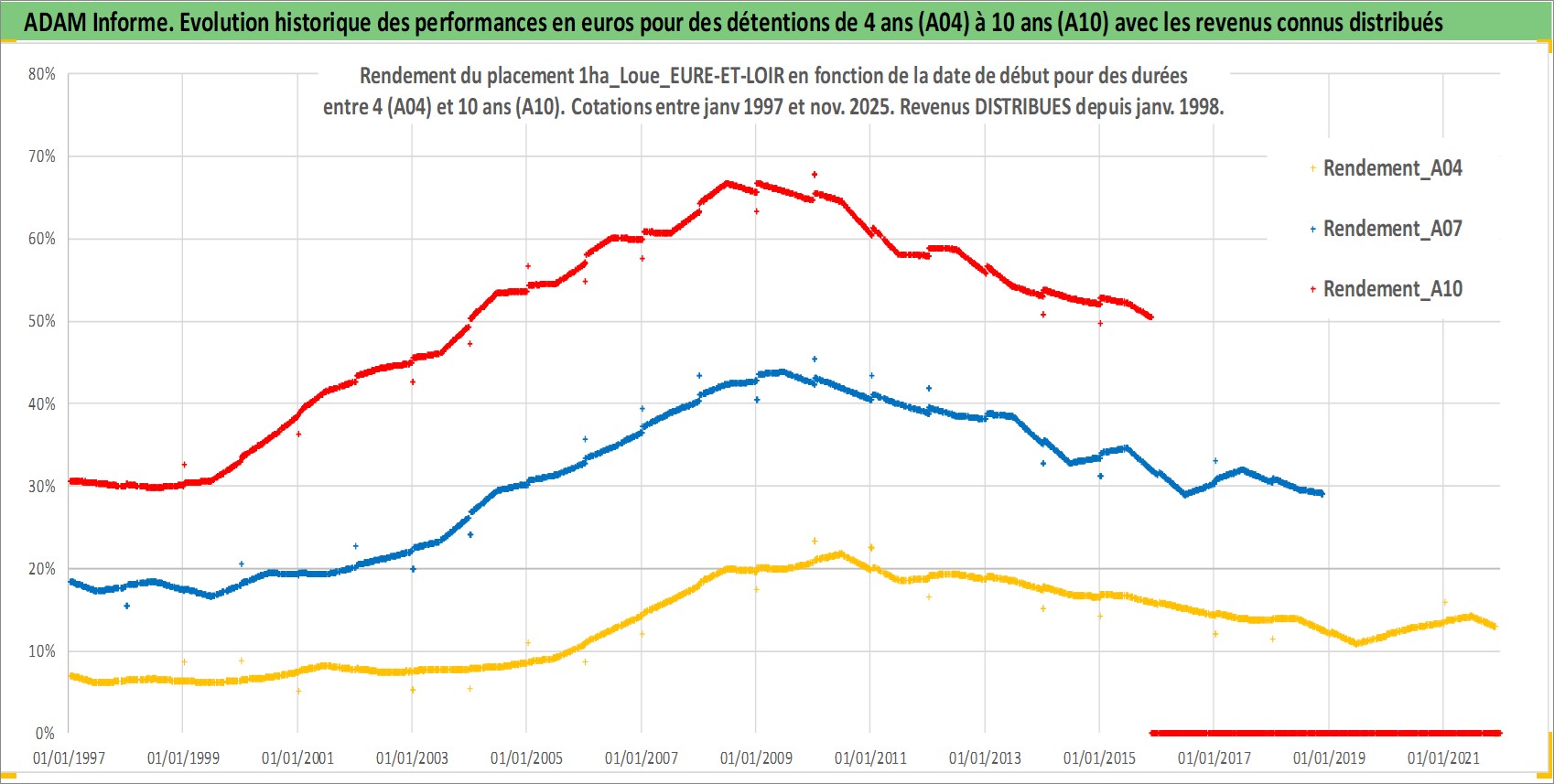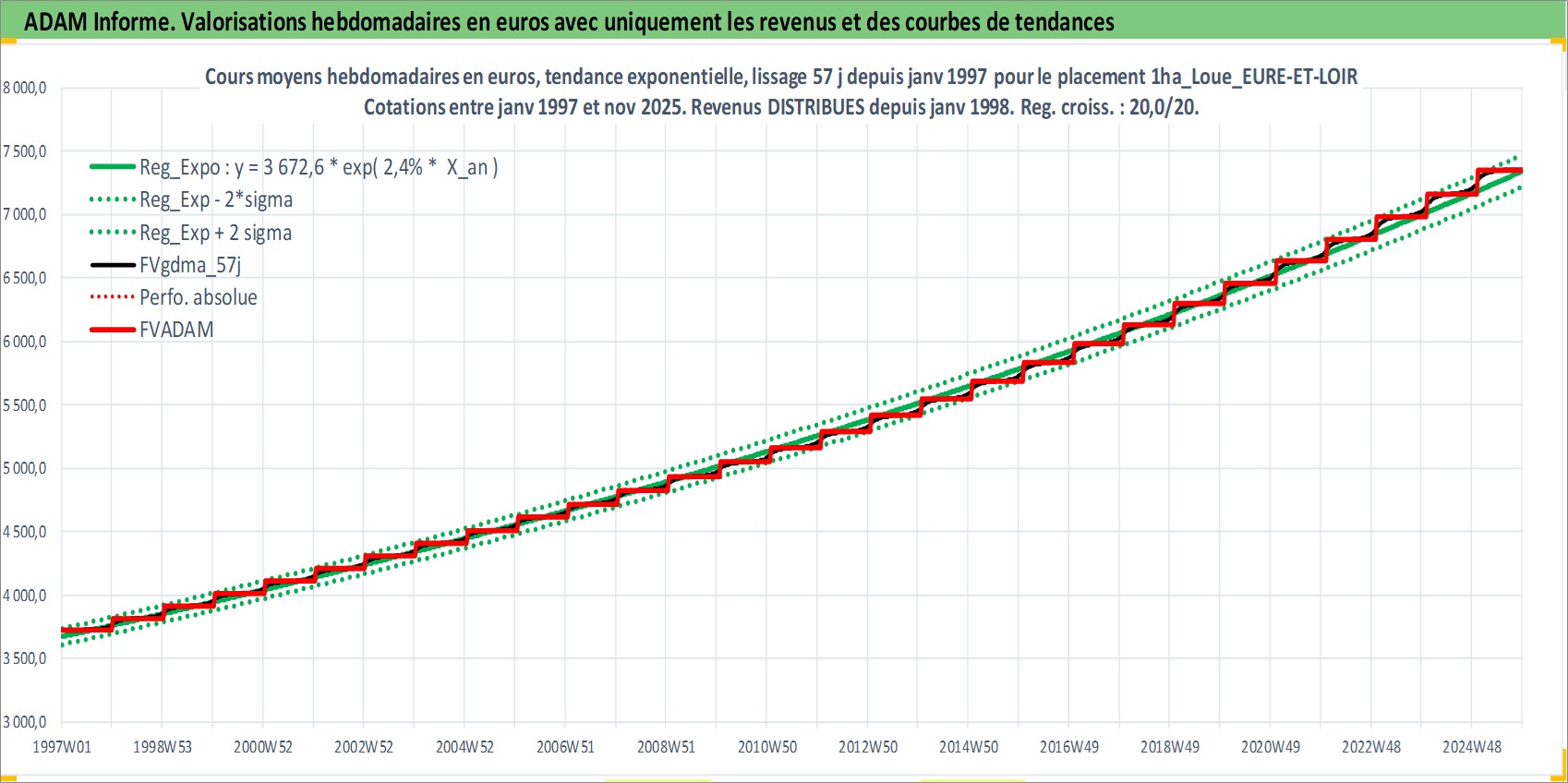 Site dédié aux investisseursPage dédiée sur site financeAnalyse des valorisations hebdomadaires de l'actif 1ha_Loue_EURE-ET-LOIR. Cet actif est cote en EUR. Les valorisations couvrent les semaines 1997W01 a 2025W48. Les fermages de ce bien foncier sont pris egaux a 2,5% annuels de la valeur venale du bien.