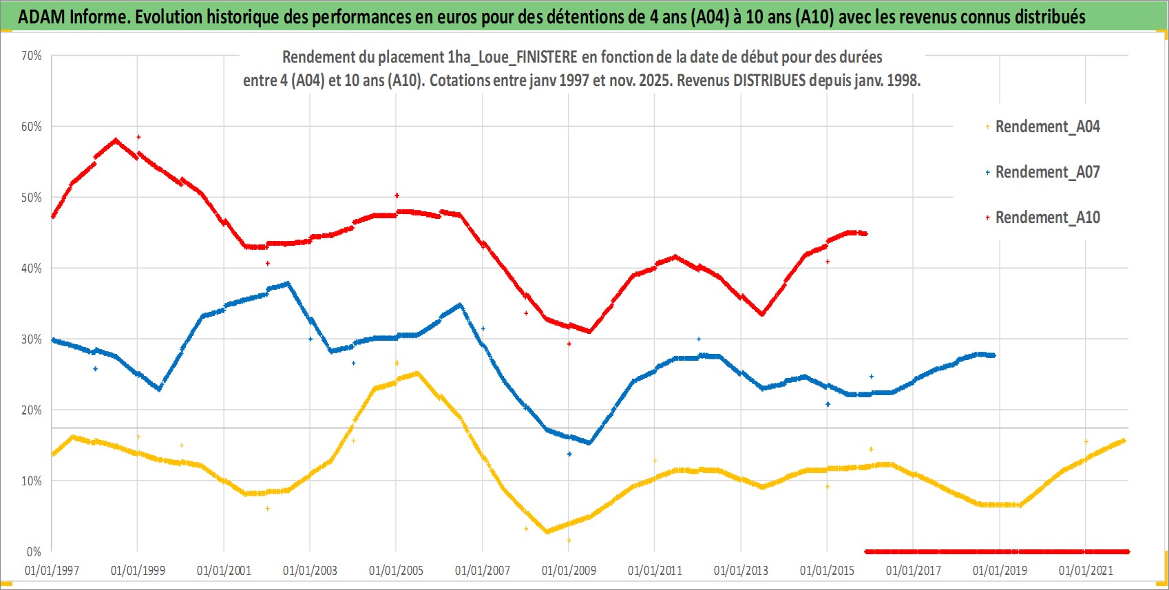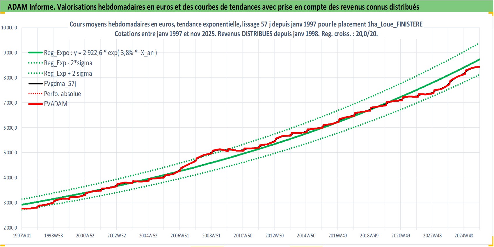 Site dédié aux investisseursPage dédiée sur site financeAnalyse des valorisations hebdomadaires de l'actif 1ha_Loue_FINISTERE. Cet actif est cote en EUR. Les valorisations couvrent les semaines 1997W01 a 2025W48. Les fermages de ce bien foncier sont pris egaux a 2,5% annuels de la valeur venale du bien.