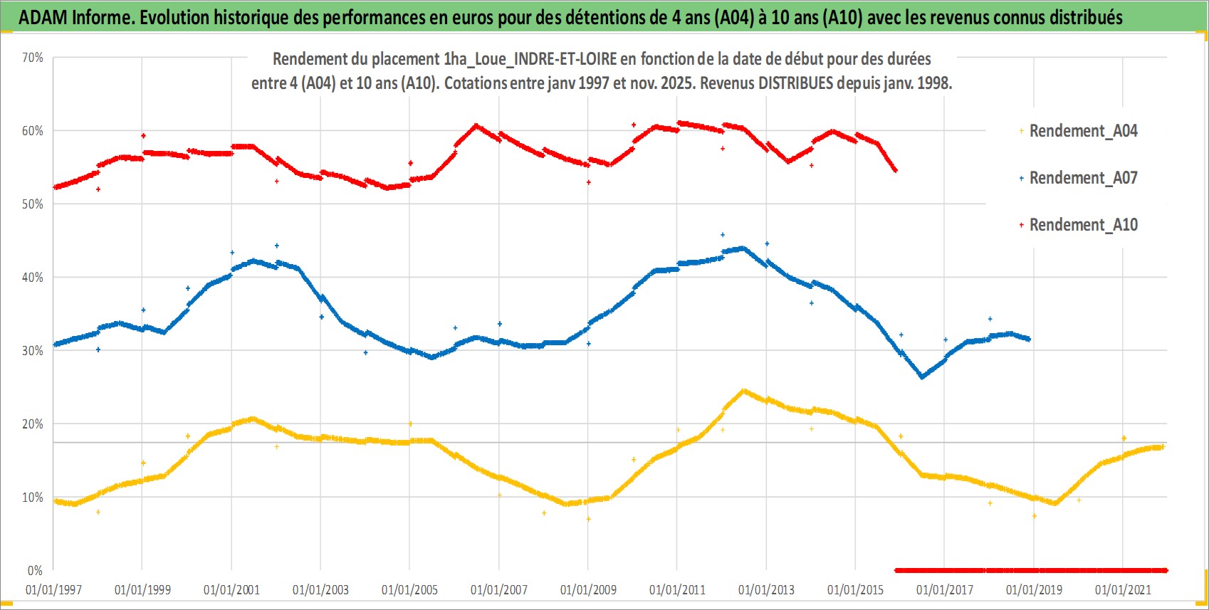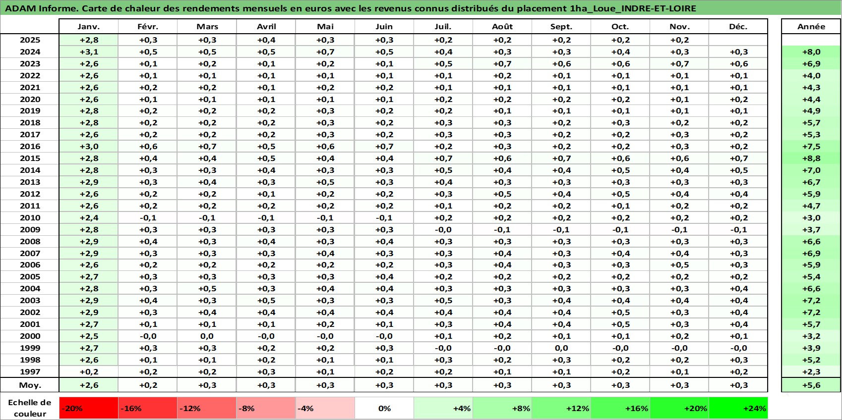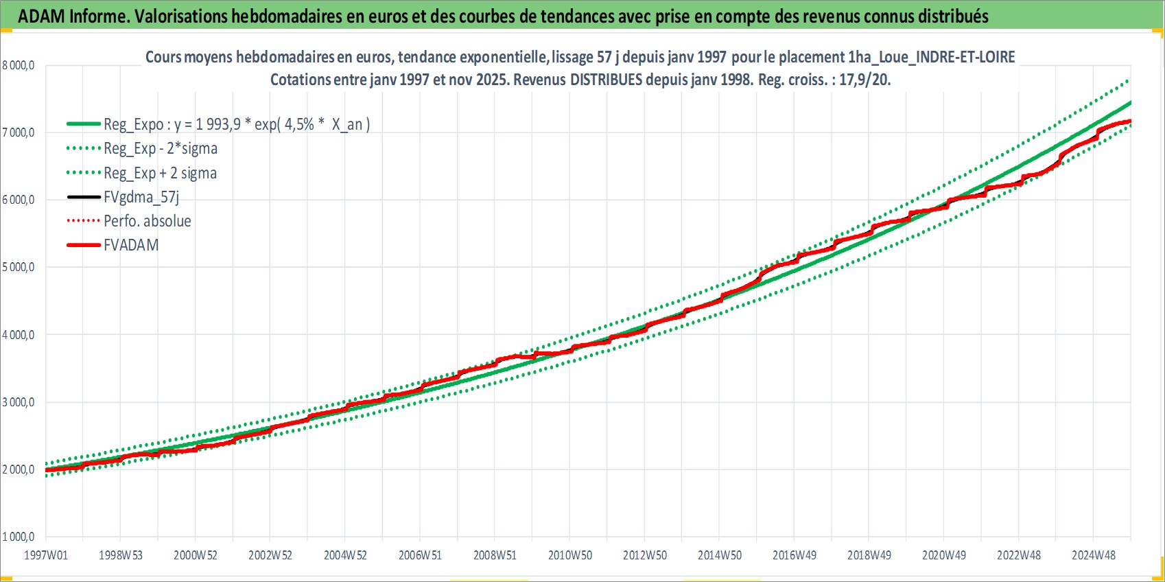Site dédié aux investisseursPage dédiée sur site financeAnalyse des valorisations hebdomadaires de l'actif 1ha_Loue_INDRE-ET-LOIRE. Cet actif est cote en EUR. Les valorisations couvrent les semaines 1997W01 a 2025W48. Les fermages de ce bien foncier sont pris egaux a 2,5% annuels de la valeur venale du bien.