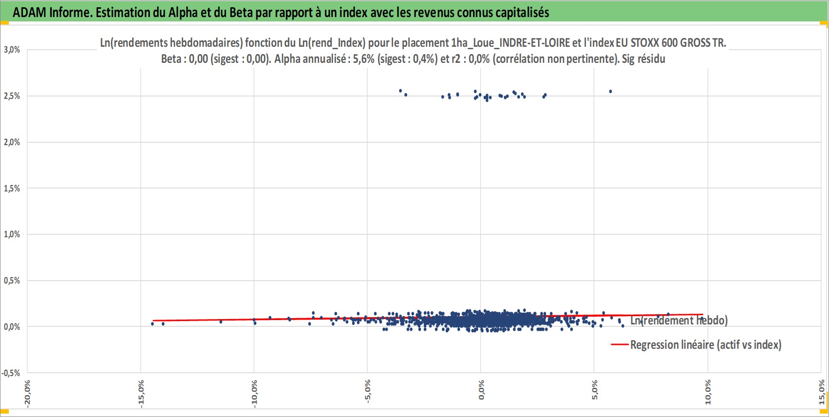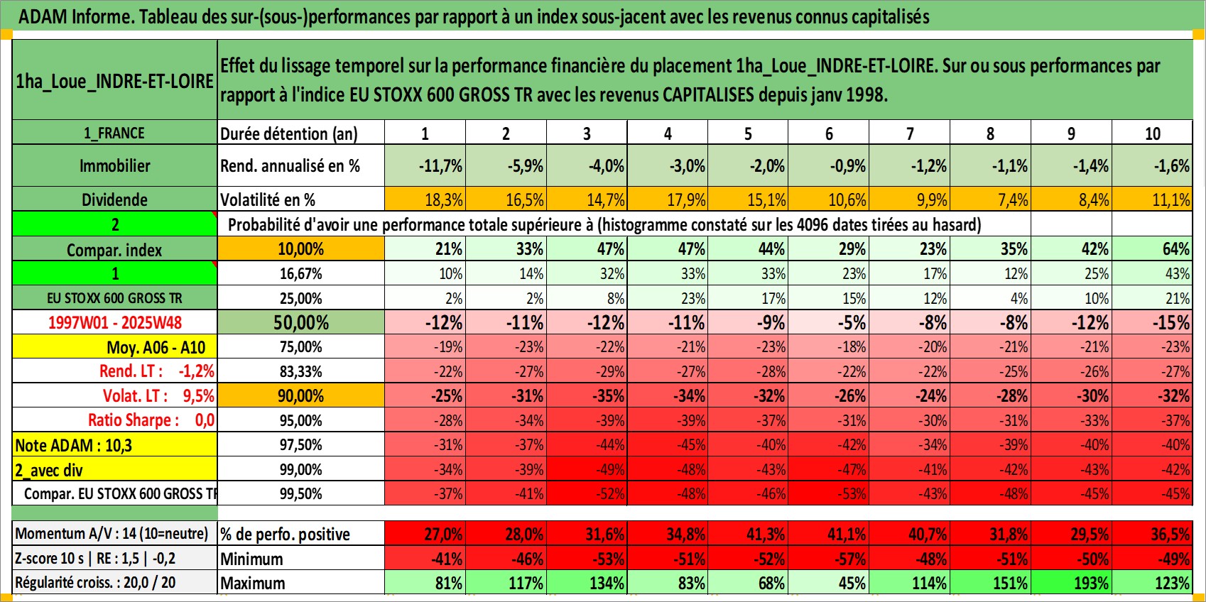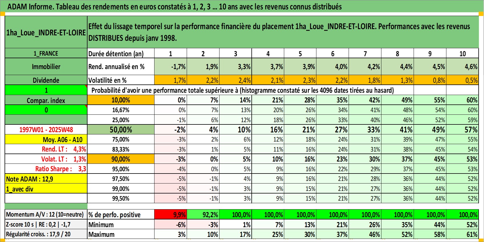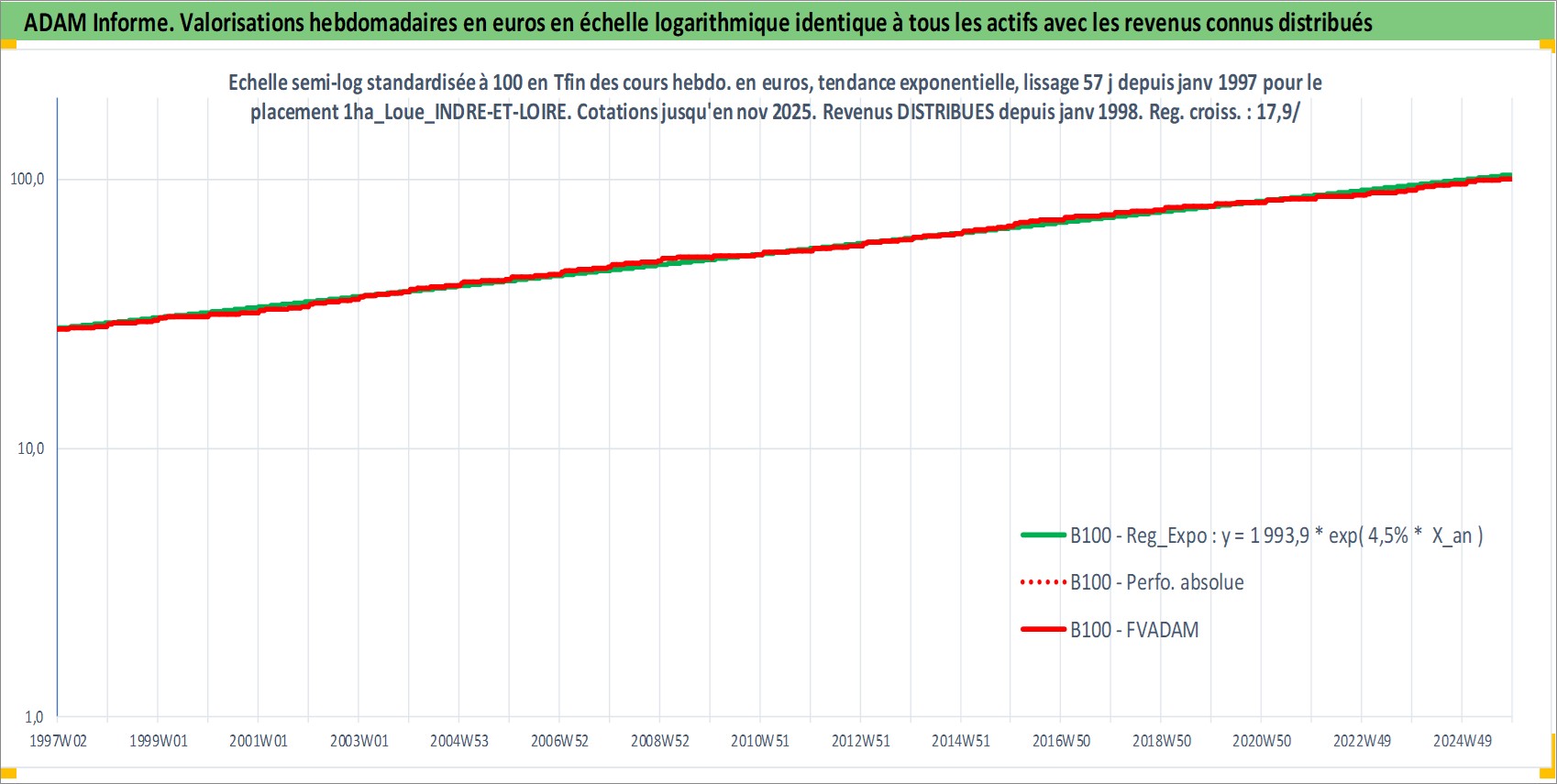 Site dédié aux investisseursPage dédiée sur site financeAnalyse des valorisations hebdomadaires de l'actif 1ha_Loue_INDRE-ET-LOIRE. Cet actif est cote en EUR. Les valorisations couvrent les semaines 1997W01 a 2025W48. Les fermages de ce bien foncier sont pris egaux a 2,5% annuels de la valeur venale du bien.