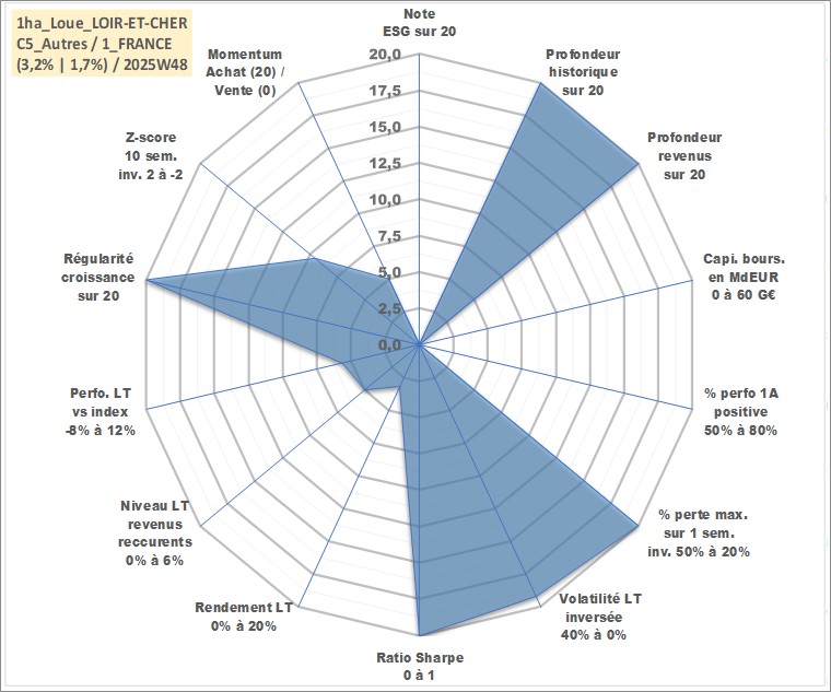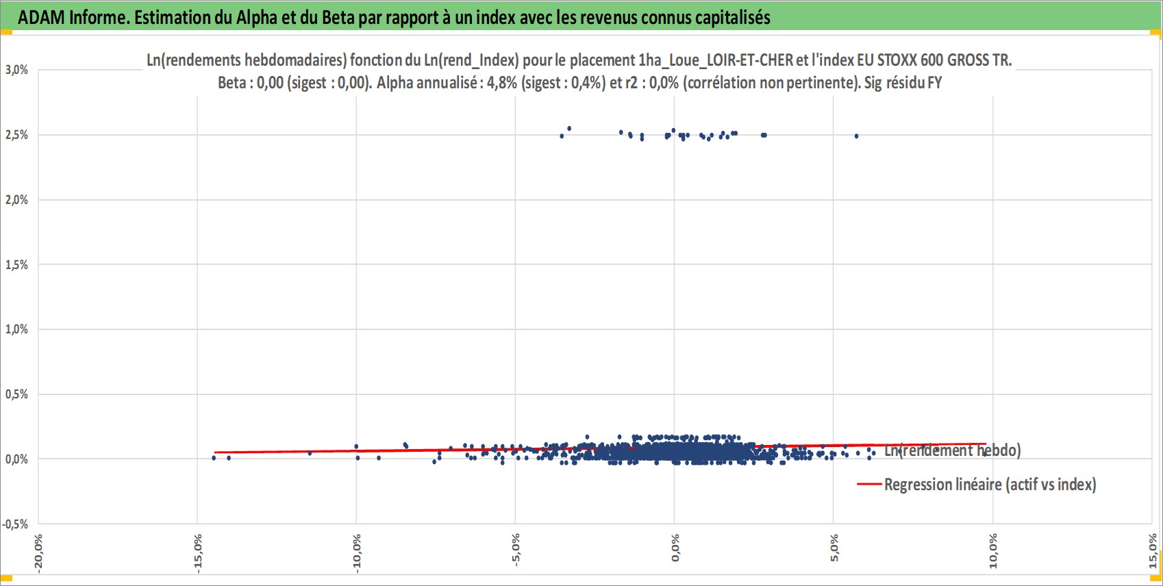 Site dédié aux investisseursPage dédiée sur site financeAnalyse des valorisations hebdomadaires de l'actif 1ha_Loue_LOIR-ET-CHER. Cet actif est cote en EUR. Les valorisations couvrent les semaines 1997W01 a 2025W48. Les fermages de ce bien foncier sont pris egaux a 2,5% annuels de la valeur venale du bien.