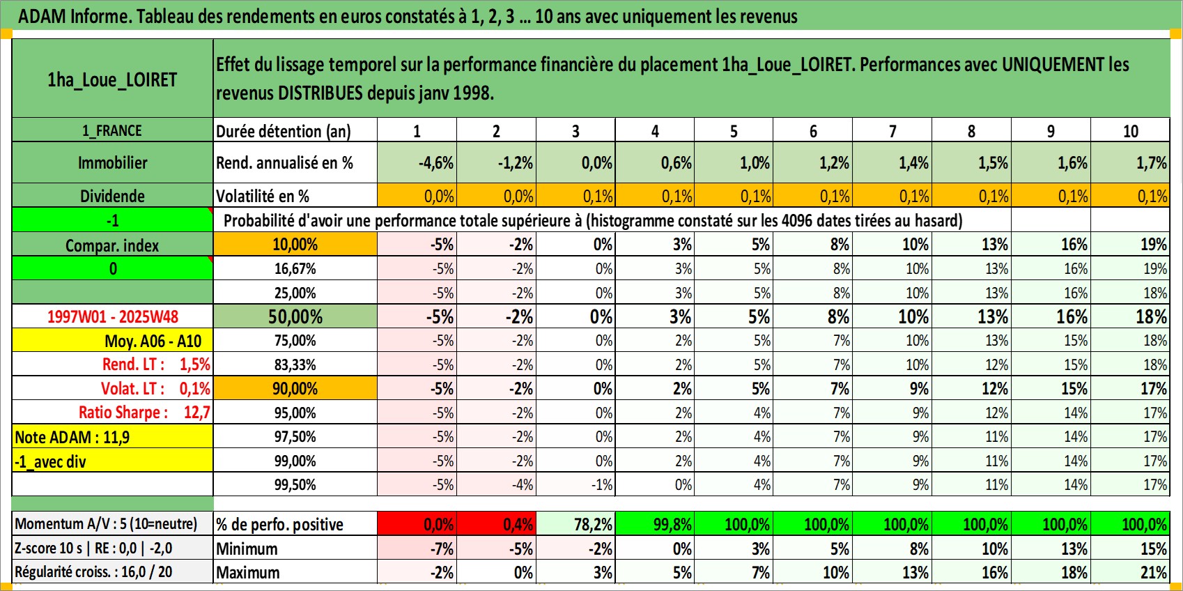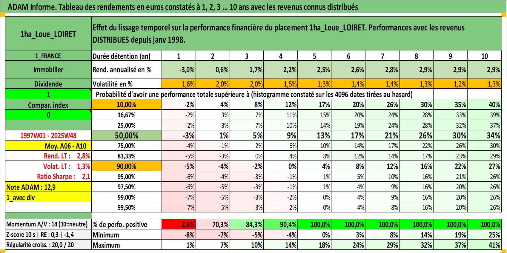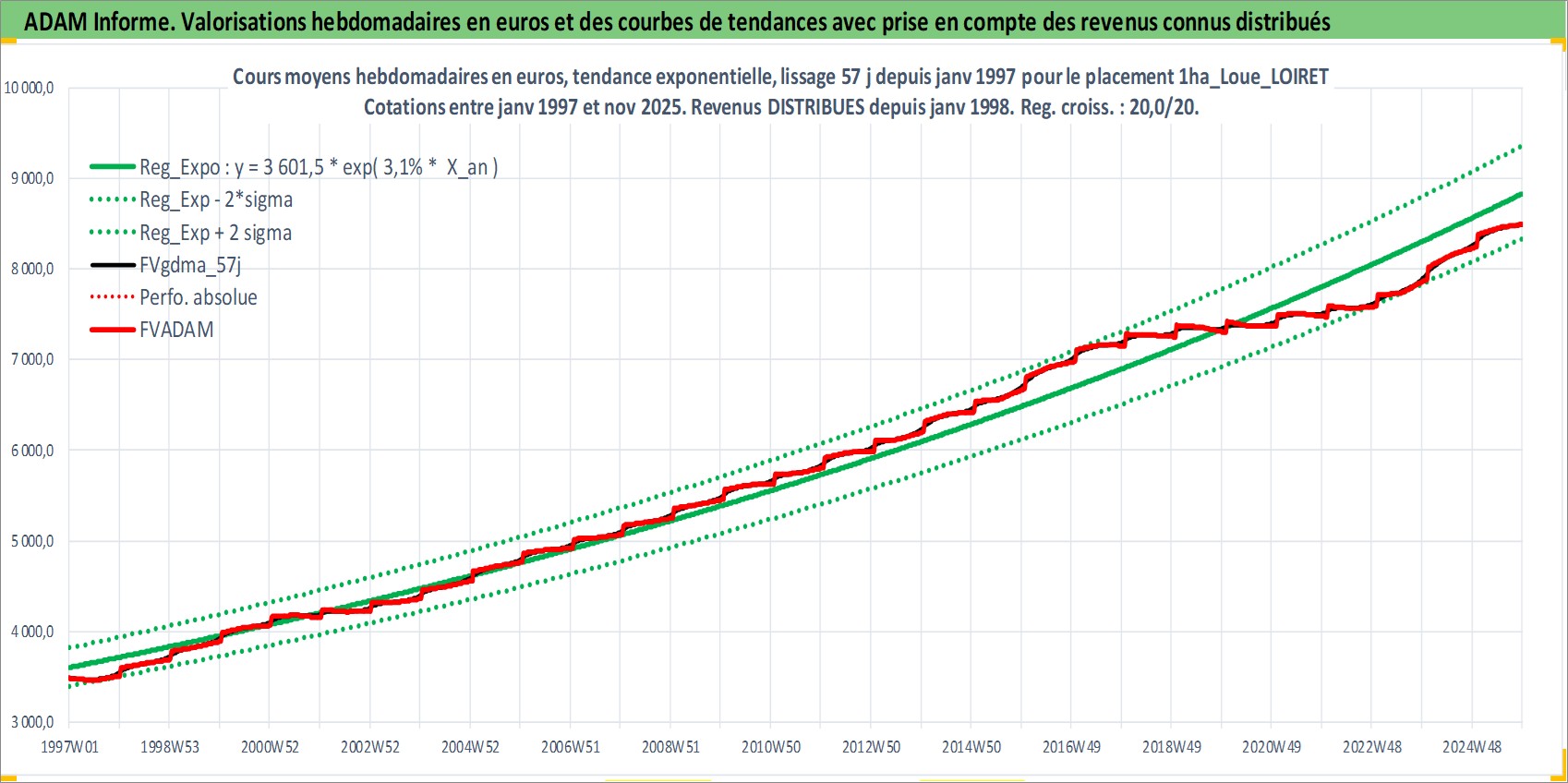 Site dédié aux investisseursPage dédiée sur site financeAnalyse des valorisations hebdomadaires de l'actif 1ha_Loue_LOIRET. Cet actif est cote en EUR. Les valorisations couvrent les semaines 1997W01 a 2025W48. Les fermages de ce bien foncier sont pris egaux a 2,5% annuels de la valeur venale du bien.