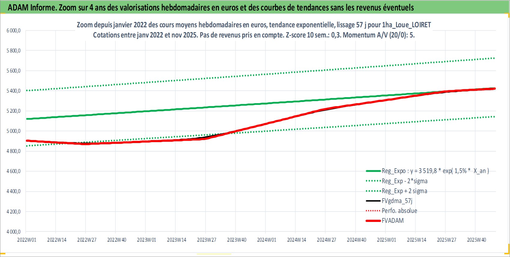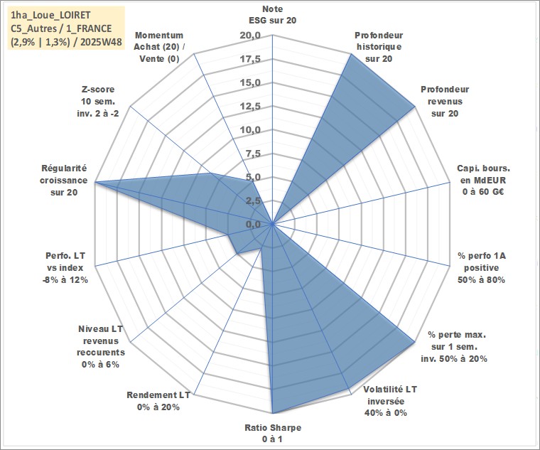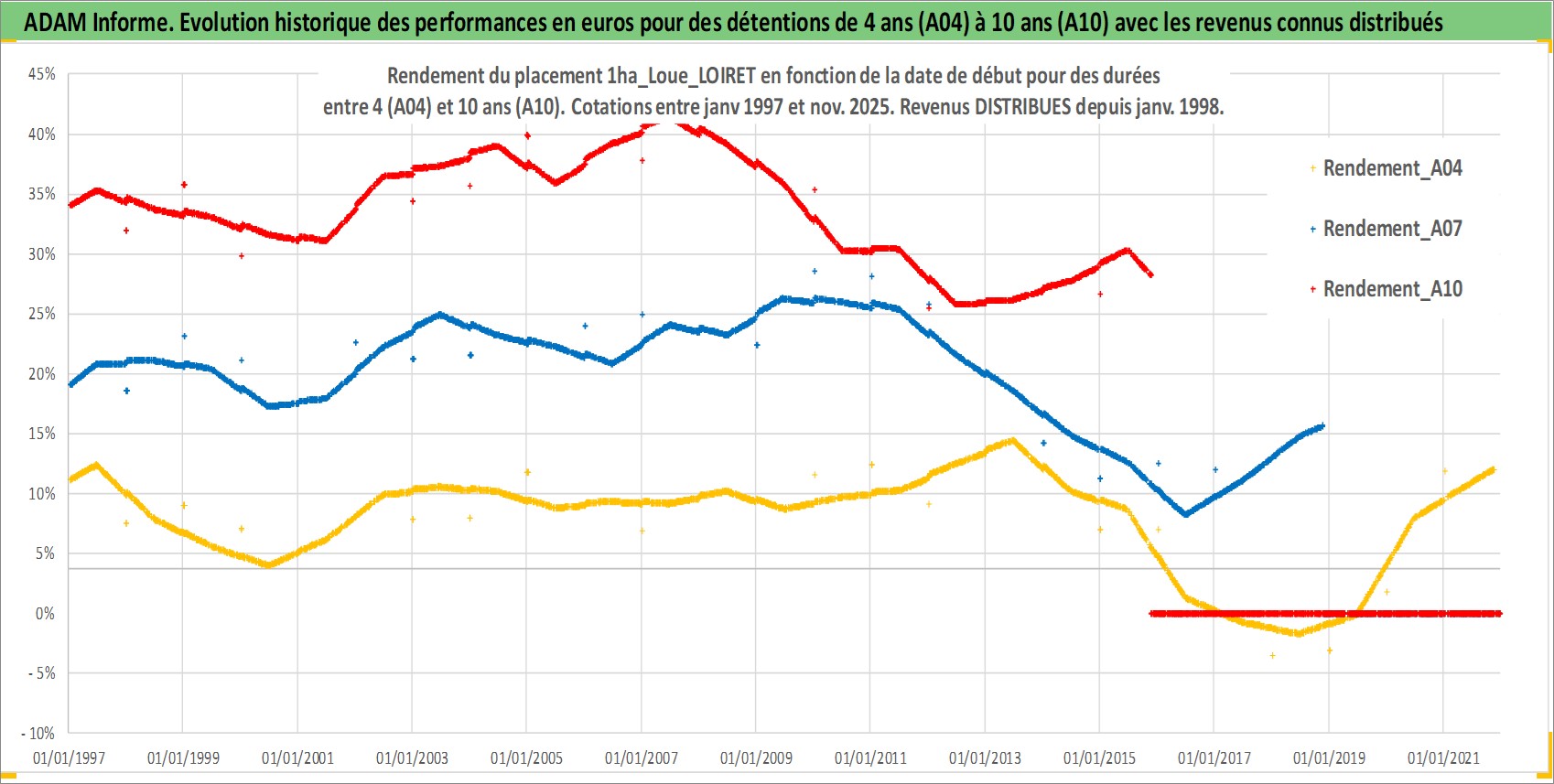 Site dédié aux investisseursPage dédiée sur site financeAnalyse des valorisations hebdomadaires de l'actif 1ha_Loue_LOIRET. Cet actif est cote en EUR. Les valorisations couvrent les semaines 1997W01 a 2025W48. Les fermages de ce bien foncier sont pris egaux a 2,5% annuels de la valeur venale du bien.