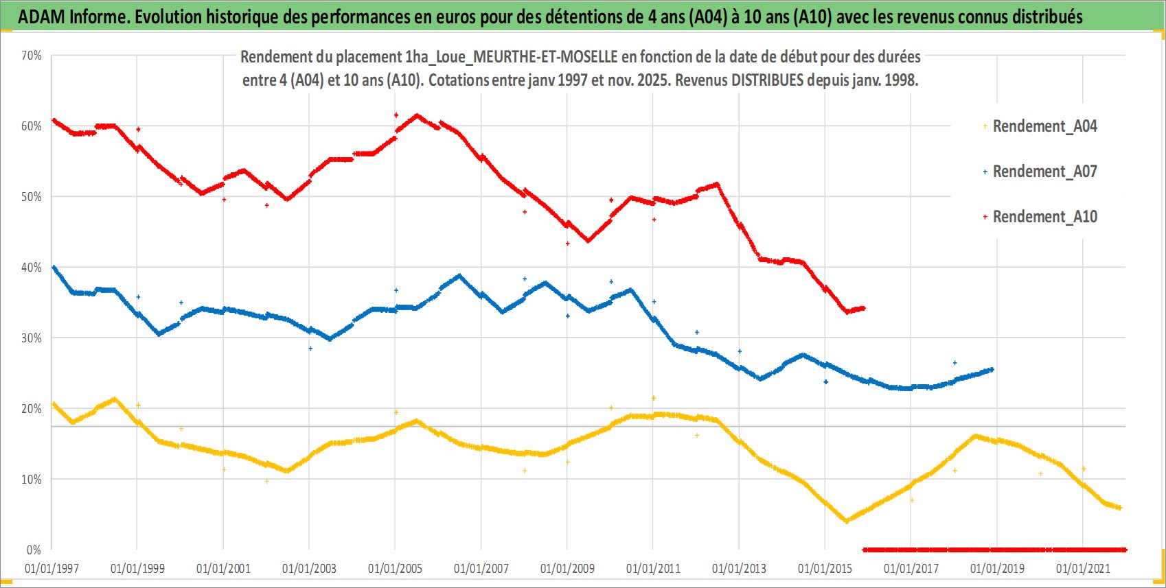 Site dédié aux investisseursPage dédiée sur site financeAnalyse des valorisations hebdomadaires de l'actif 1ha_Loue_MEURTHE-ET-MOSELLE. Cet actif est cote en EUR. Les valorisations couvrent les semaines 1997W01 a 2025W48. Les fermages de ce bien foncier sont pris egaux a 2,5% annuels de la valeur venale du bien.