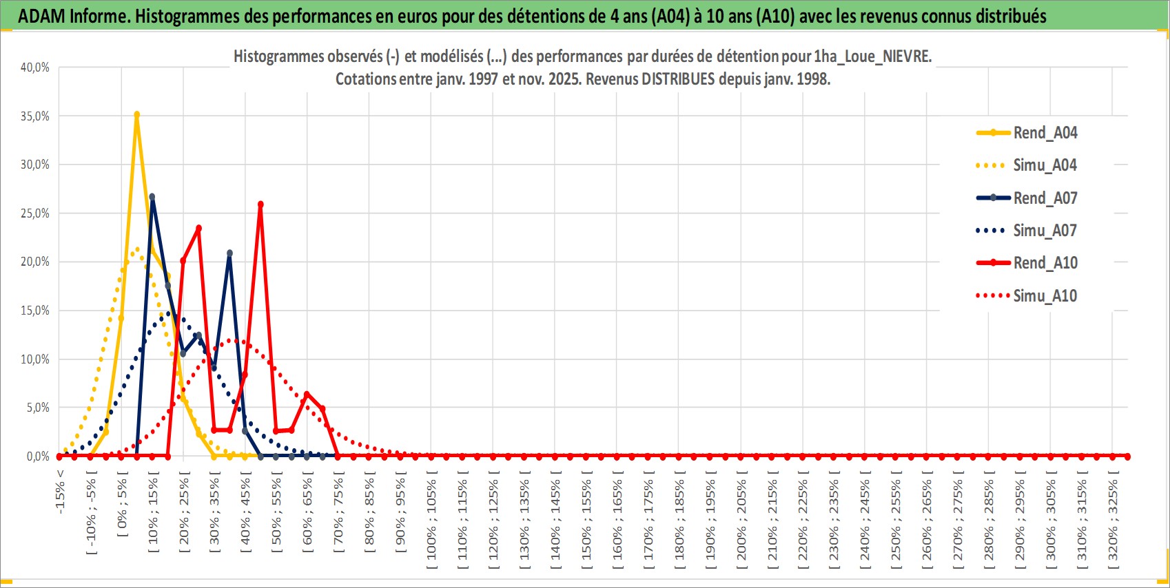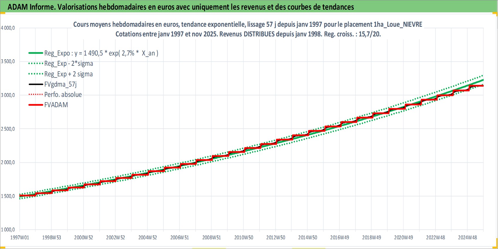 Site dédié aux investisseursPage dédiée sur site financeAnalyse des valorisations hebdomadaires de l'actif 1ha_Loue_NIEVRE. Cet actif est cote en EUR. Les valorisations couvrent les semaines 1997W01 a 2025W48. Les fermages de ce bien foncier sont pris egaux a 2,5% annuels de la valeur venale du bien.