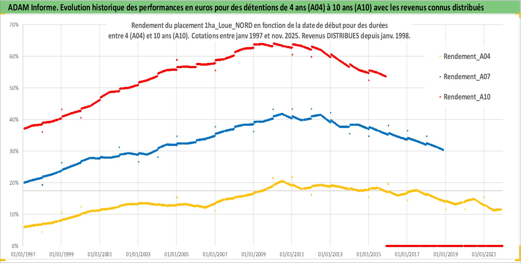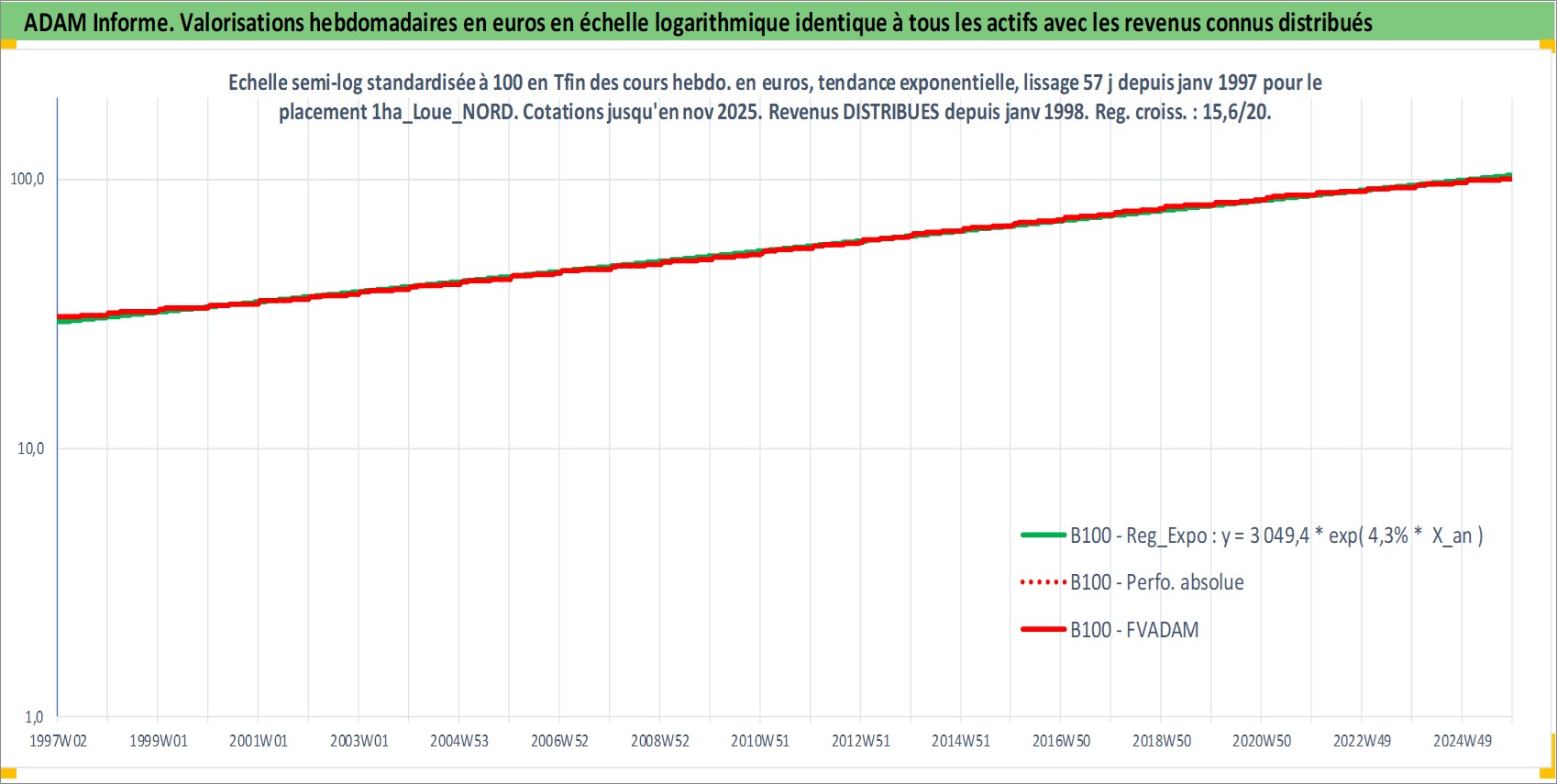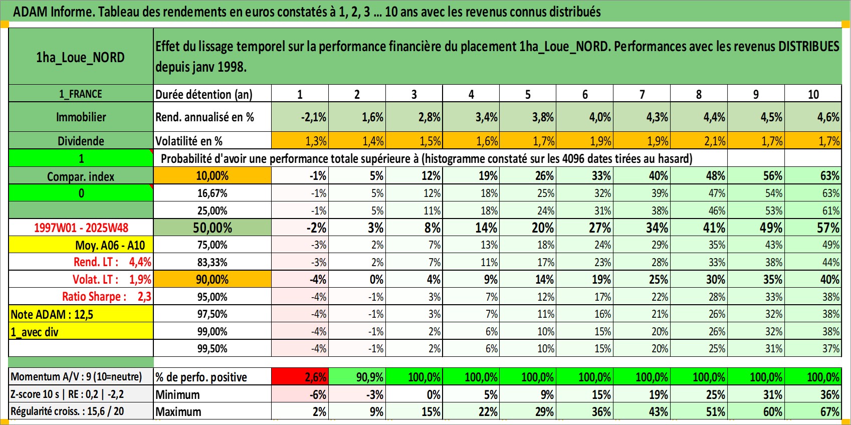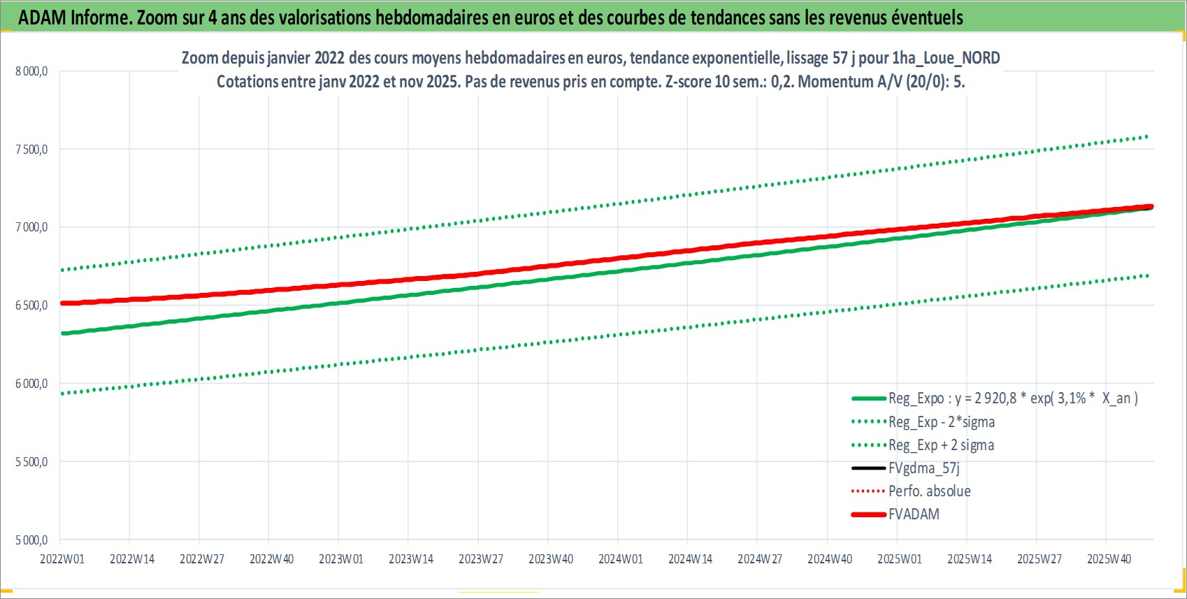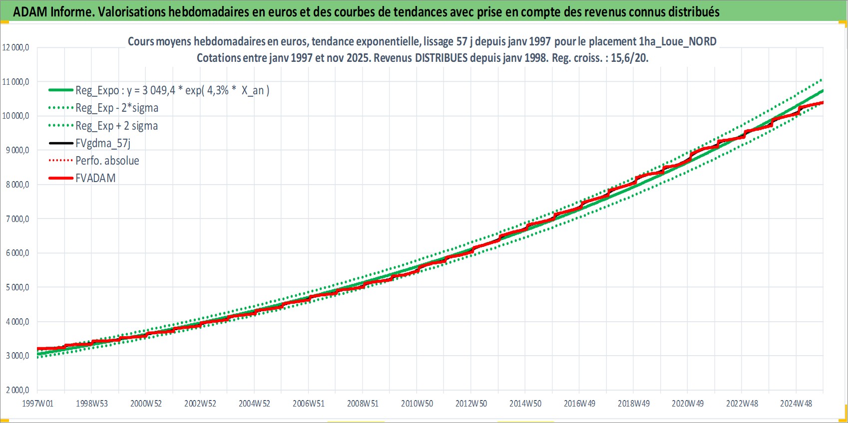 Site dédié aux investisseursPage dédiée sur site financeAnalyse des valorisations hebdomadaires de l'actif 1ha_Loue_NORD. Cet actif est cote en EUR. Les valorisations couvrent les semaines 1997W01 a 2025W48. Les fermages de ce bien foncier sont pris egaux a 2,5% annuels de la valeur venale du bien.