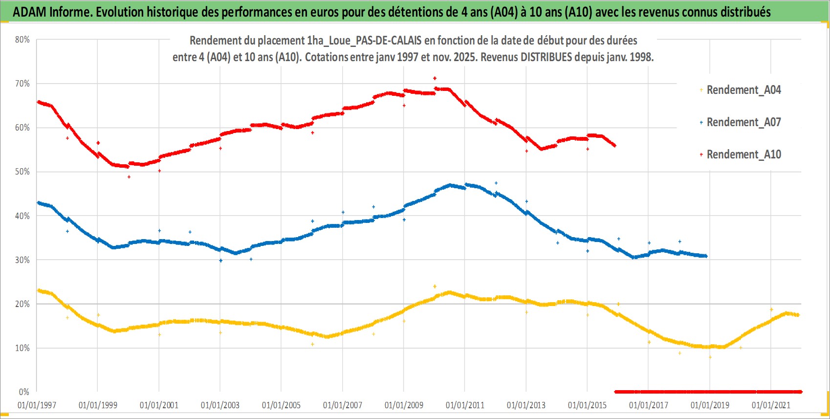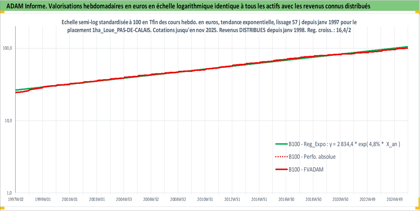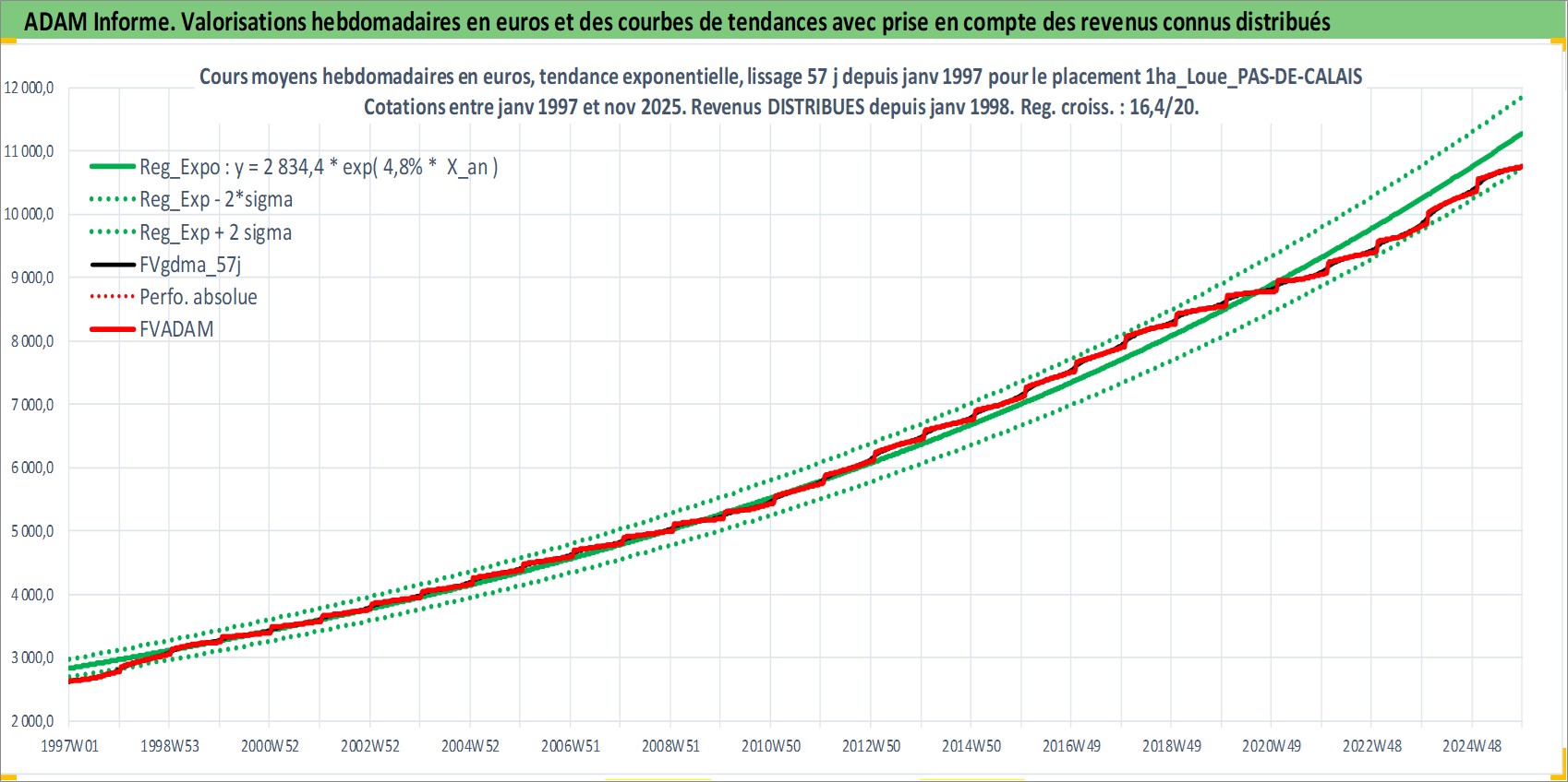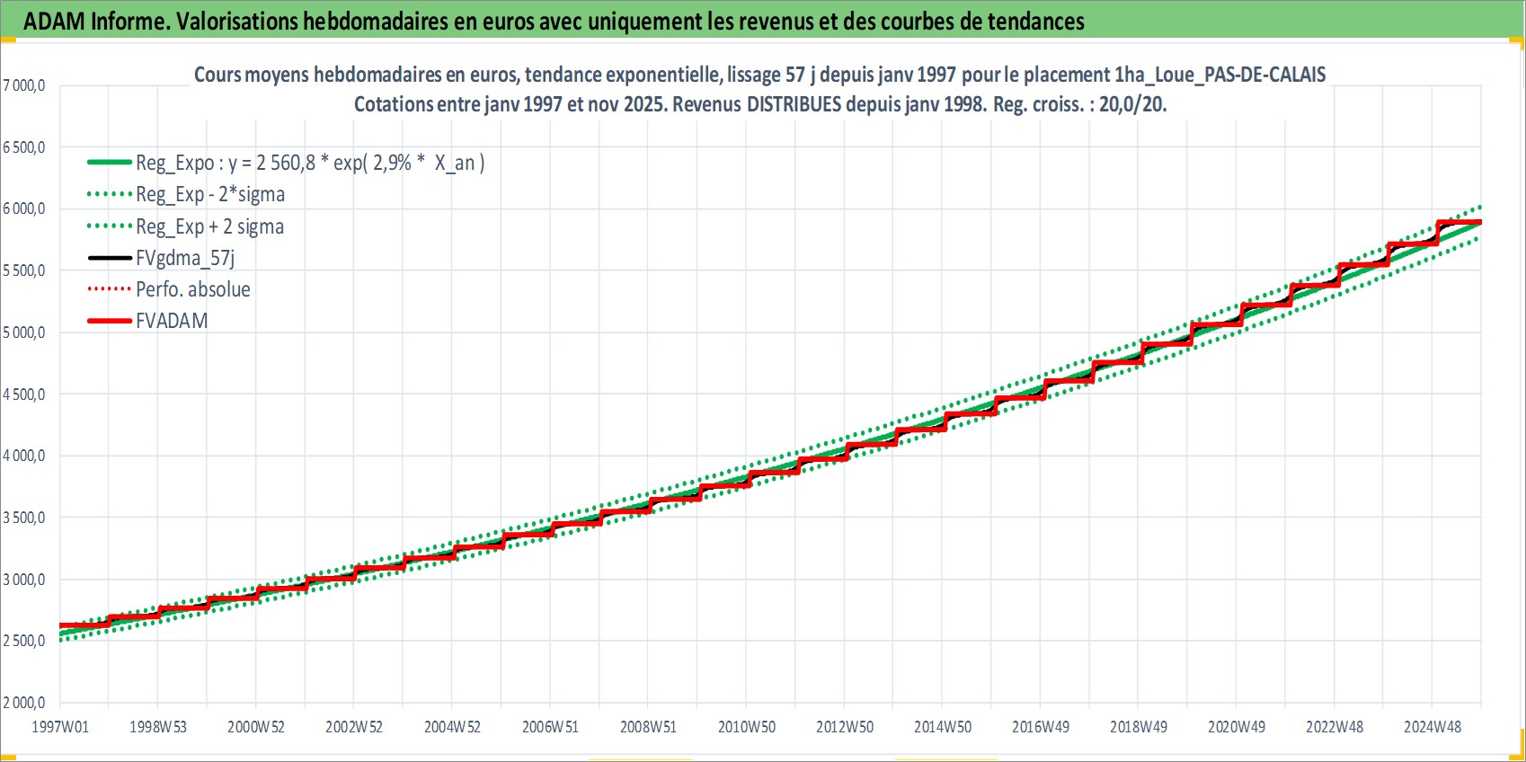 Site dédié aux investisseursPage dédiée sur site financeAnalyse des valorisations hebdomadaires de l'actif 1ha_Loue_PAS-DE-CALAIS. Cet actif est cote en EUR. Les valorisations couvrent les semaines 1997W01 a 2025W48. Les fermages de ce bien foncier sont pris egaux a 2,5% annuels de la valeur venale du bien.
