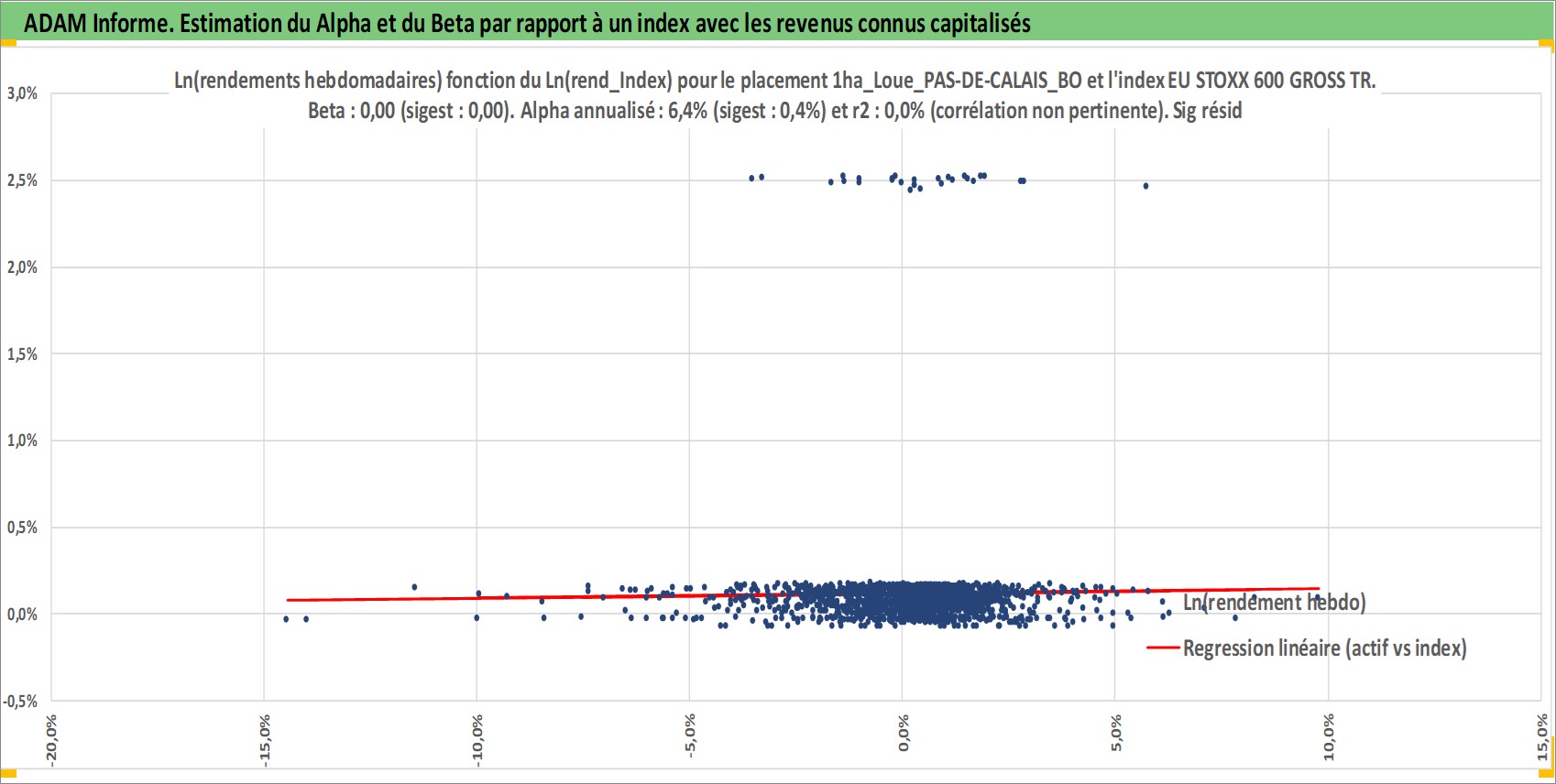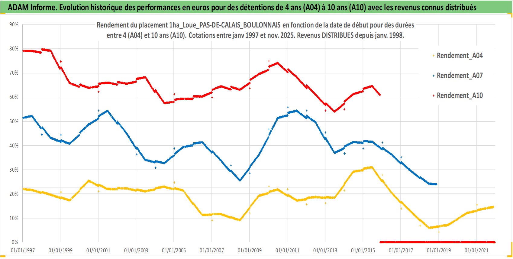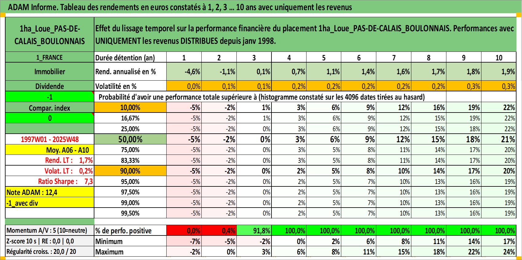 Site dédié aux investisseursPage dédiée sur site financeAnalyse des valorisations hebdomadaires de l'actif 1ha_Loue_PAS-DE-CALAIS_BOULONNAIS. Cet actif est cote en EUR. Les valorisations couvrent les semaines 1997W01 a 2025W48. Les fermages de ce bien foncier sont pris egaux a 2,5% annuels de la valeur venale du bien.