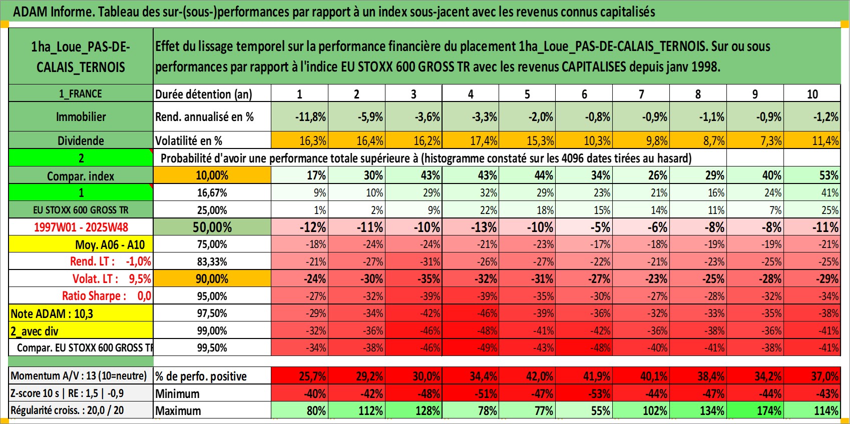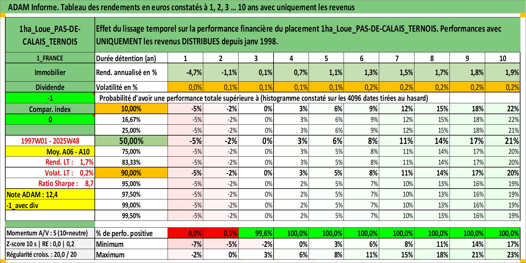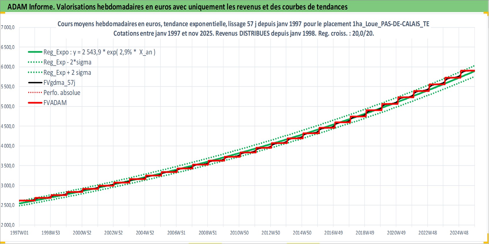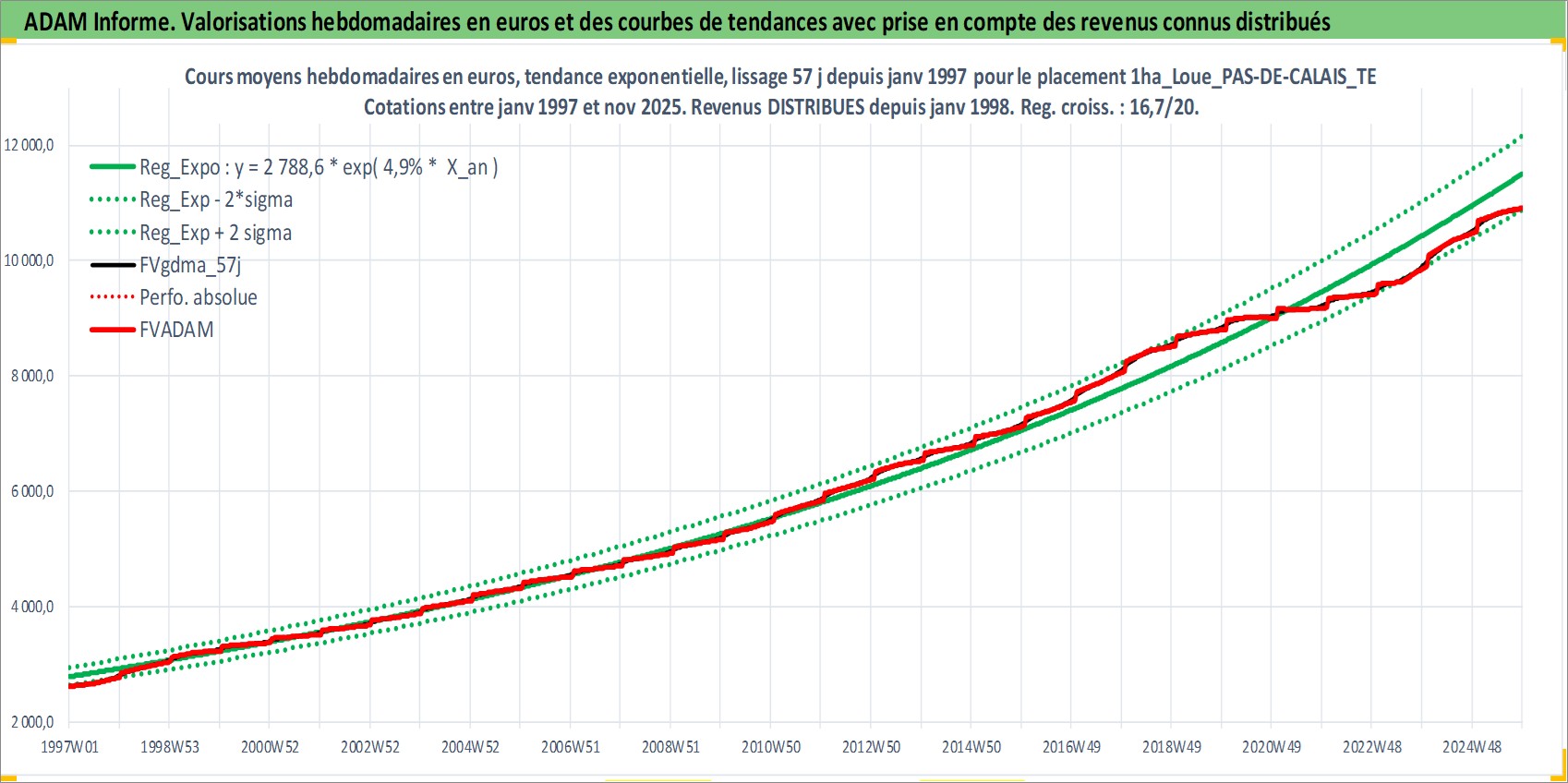 Site dédié aux investisseursPage dédiée sur site financeAnalyse des valorisations hebdomadaires de l'actif 1ha_Loue_PAS-DE-CALAIS_TERNOIS. Cet actif est cote en EUR. Les valorisations couvrent les semaines 1997W01 a 2025W48. Les fermages de ce bien foncier sont pris egaux a 2,5% annuels de la valeur venale du bien.
