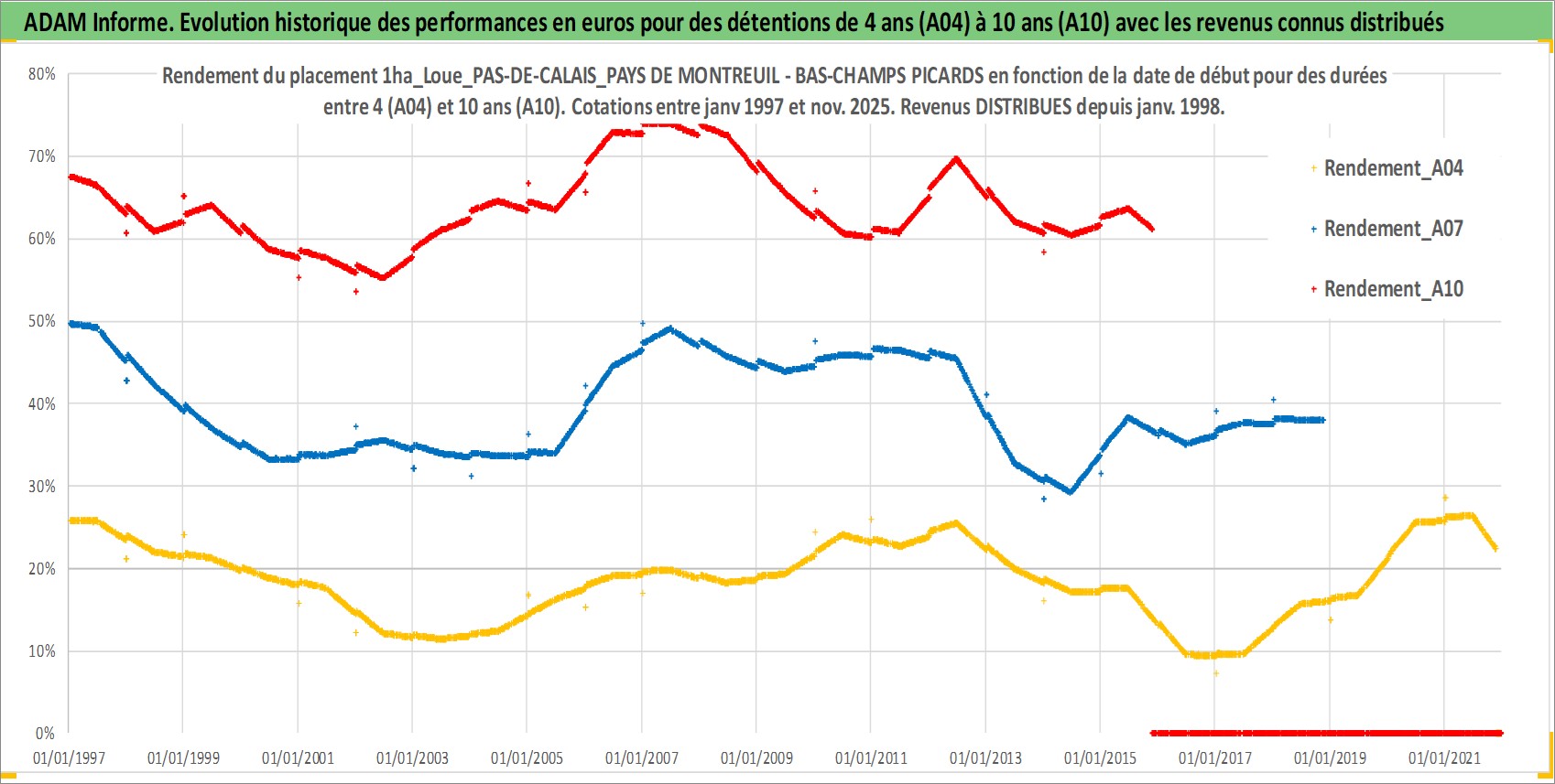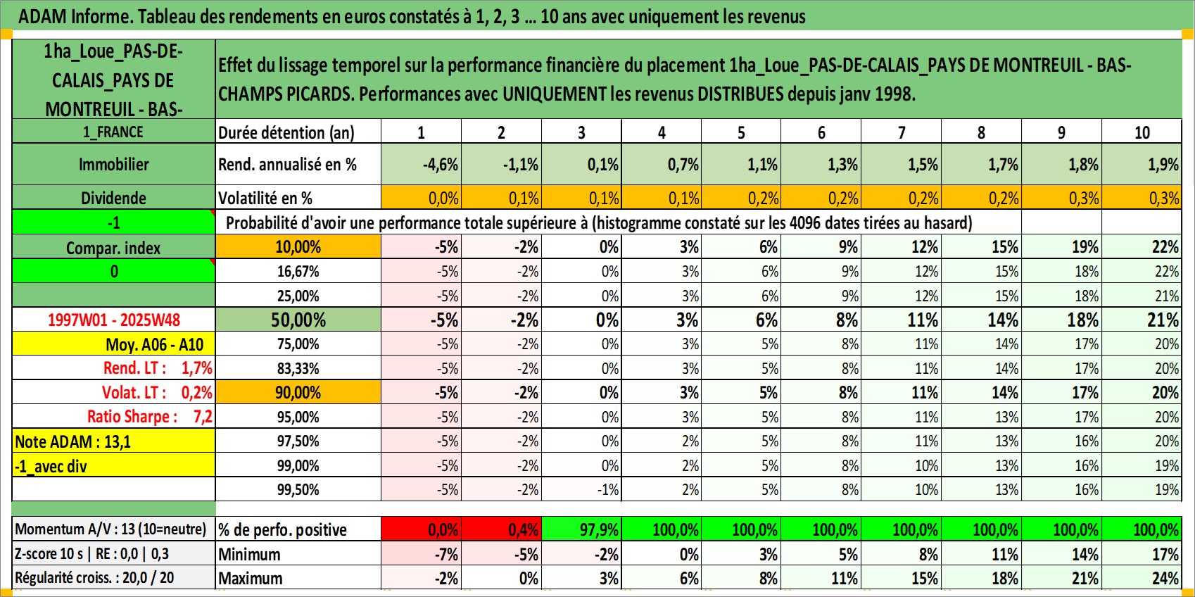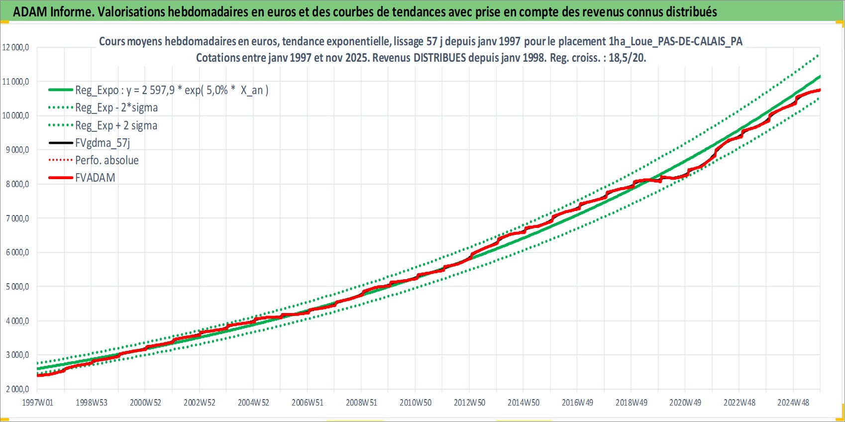Site dédié aux investisseursPage dédiée sur site financeAnalyse des valorisations hebdomadaires de l'actif 1ha_Loue_PAS-DE-CALAIS_PAYS DE MONTREUIL - BAS-CHAMPS PICARDS. Cet actif est cote en EUR. Les valorisations couvrent les semaines 1997W01 a 2025W48. Les fermages de ce bien foncier sont pris egaux a 2,5% annuels de la valeur venale du bien.