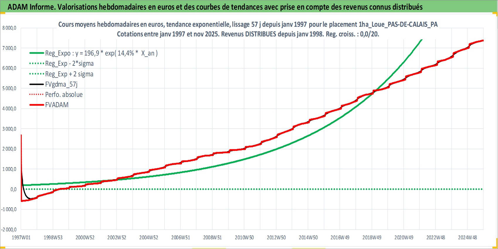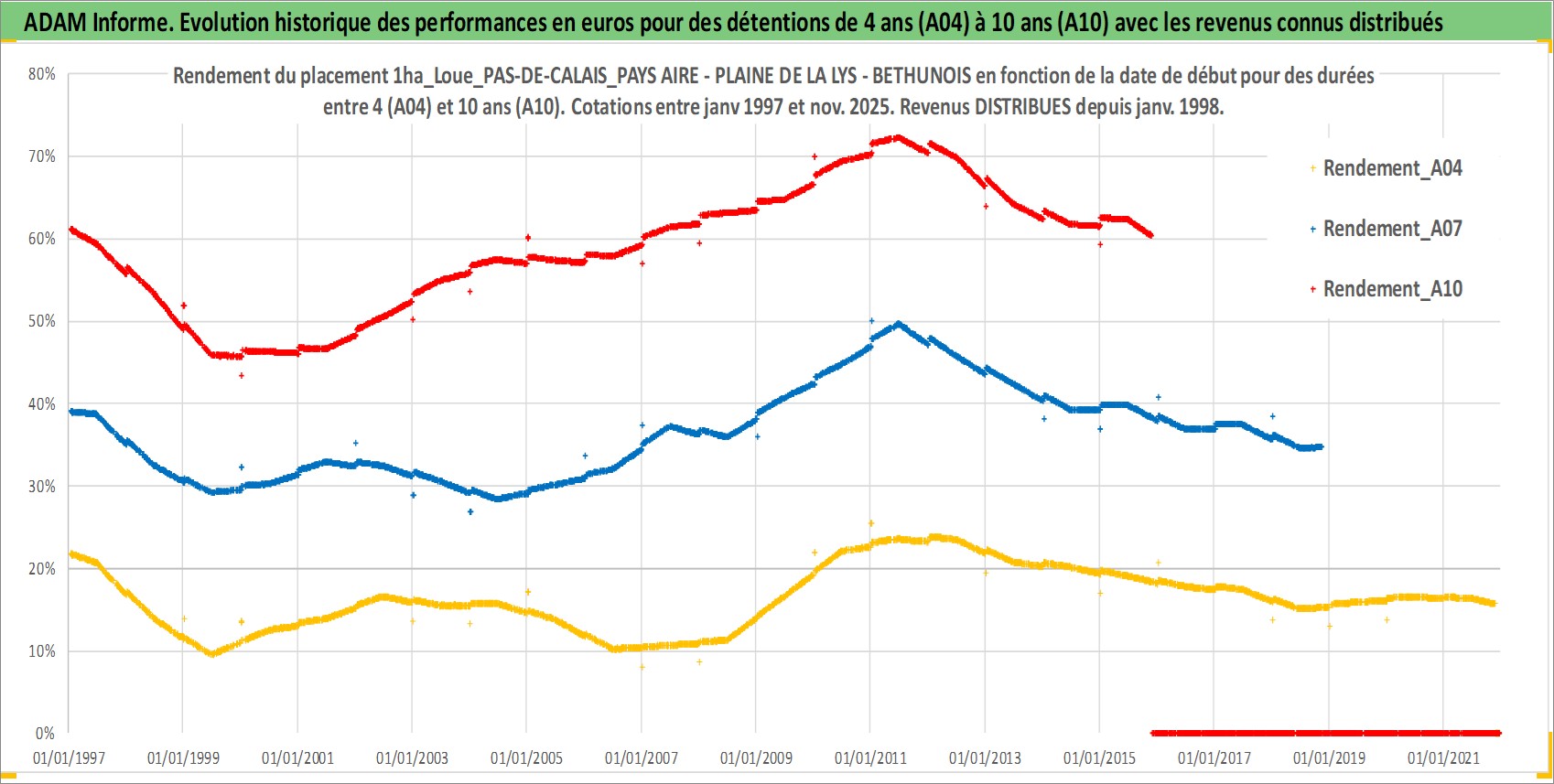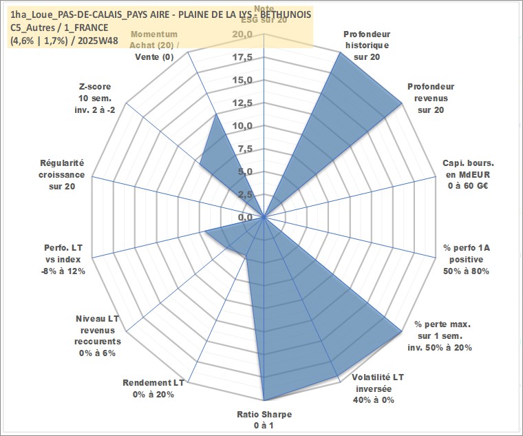 Site dédié aux investisseursPage dédiée sur site financeAnalyse des valorisations hebdomadaires de l'actif 1ha_Loue_PAS-DE-CALAIS_PAYS AIRE - PLAINE DE LA LYS - BETHUNOIS. Cet actif est cote en EUR. Les valorisations couvrent les semaines 1997W01 a 2025W48. Les fermages de ce bien foncier sont pris egaux a 2,5% annuels de la valeur venale du bien.