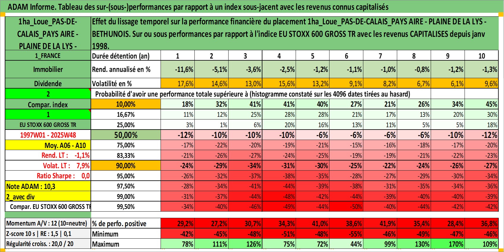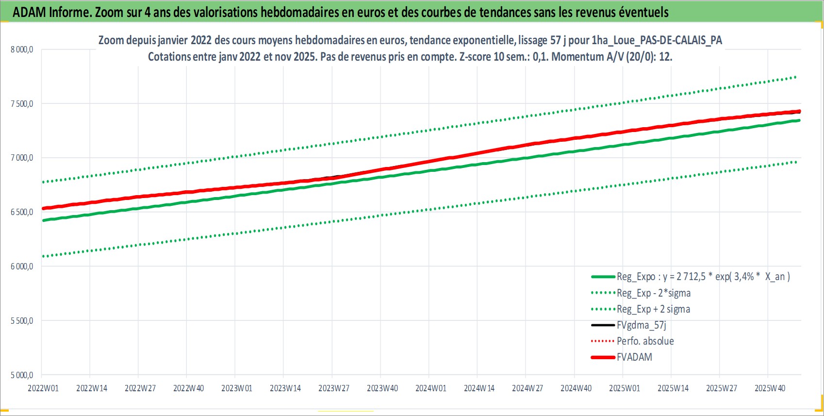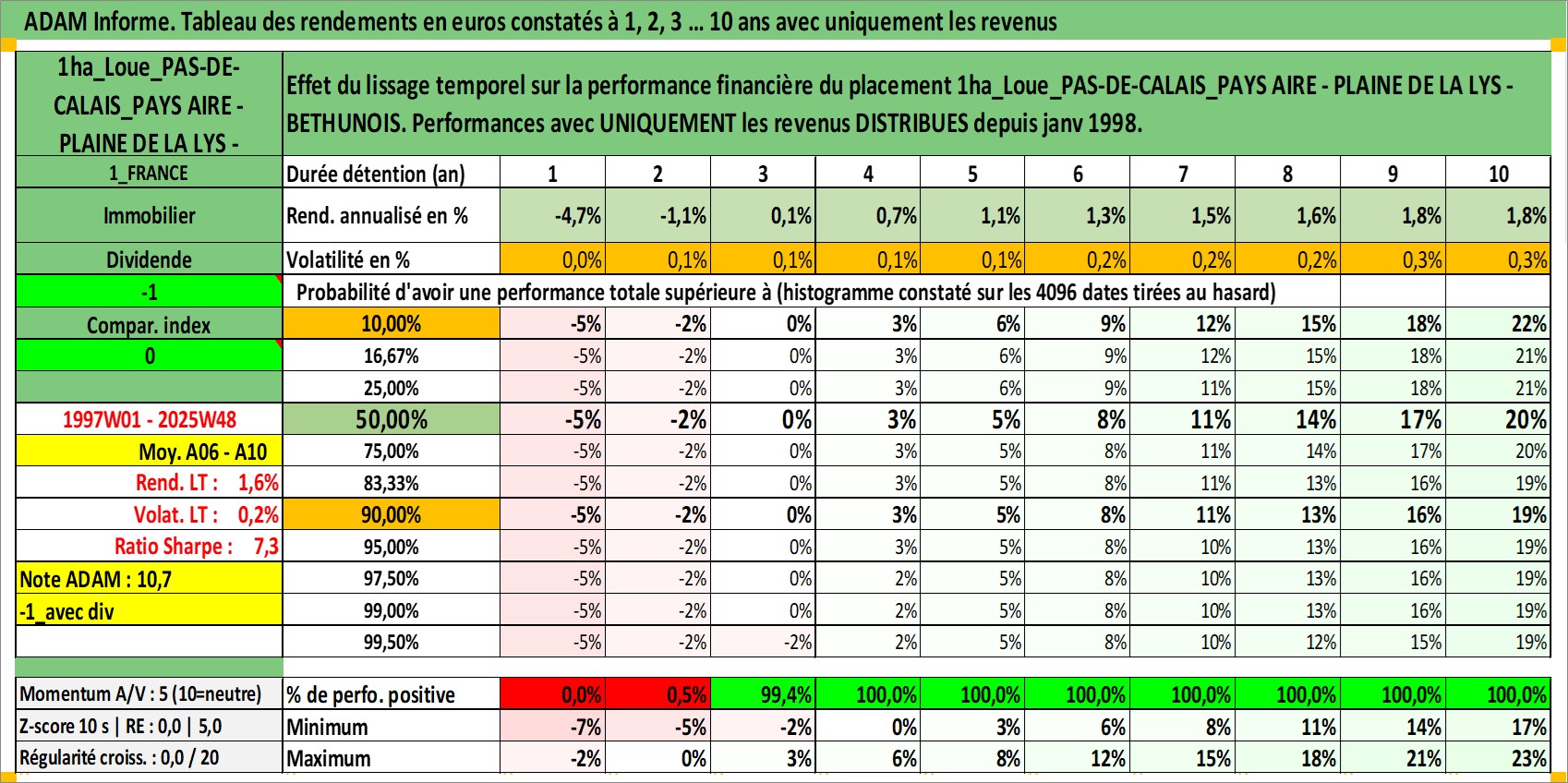 Site dédié aux investisseursPage dédiée sur site financeAnalyse des valorisations hebdomadaires de l'actif 1ha_Loue_PAS-DE-CALAIS_PAYS AIRE - PLAINE DE LA LYS - BETHUNOIS. Cet actif est cote en EUR. Les valorisations couvrent les semaines 1997W01 a 2025W48. Les fermages de ce bien foncier sont pris egaux a 2,5% annuels de la valeur venale du bien.