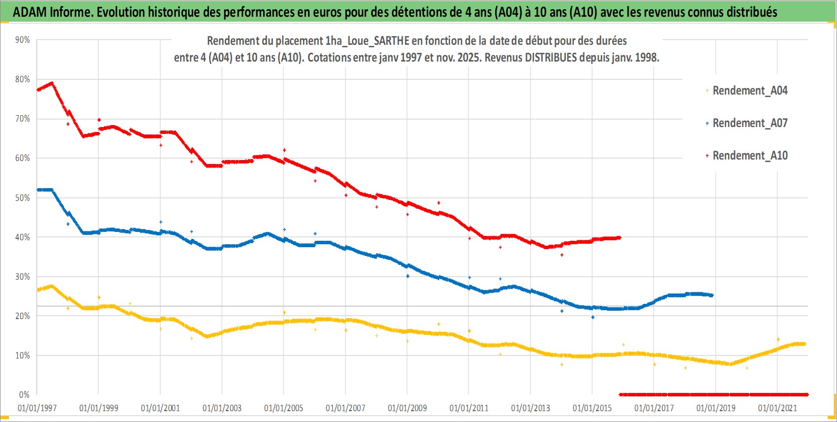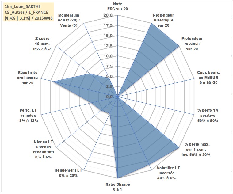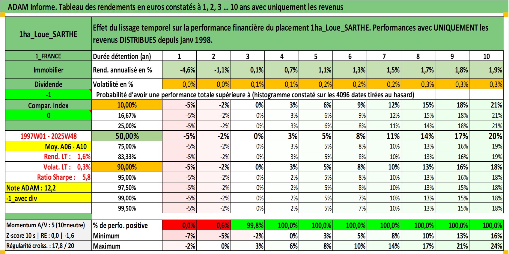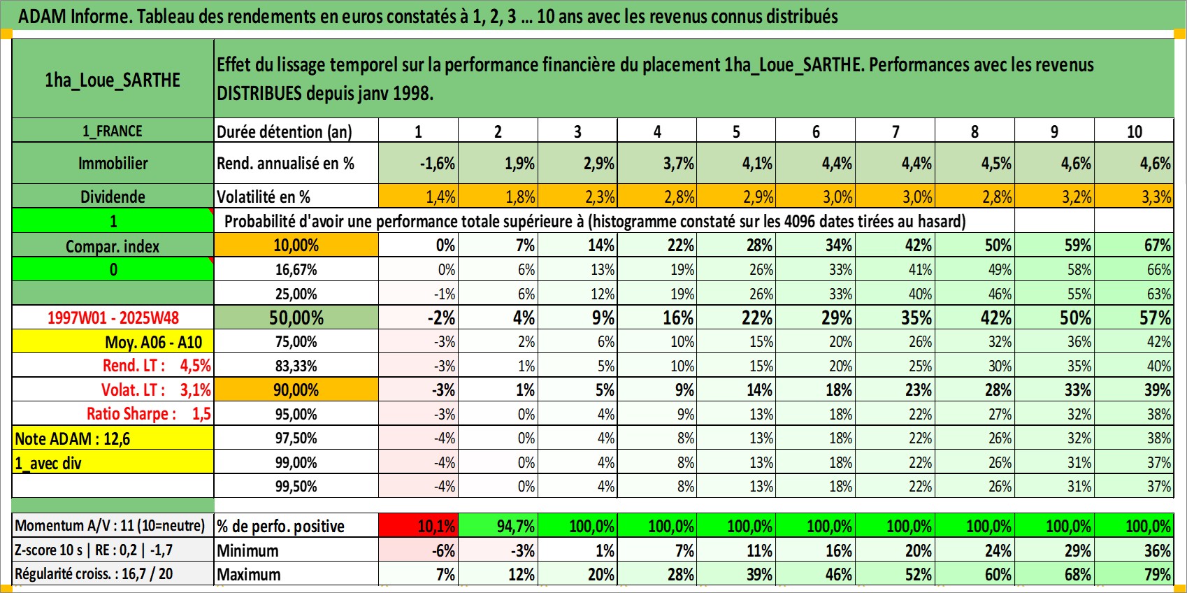 Site dédié aux investisseursPage dédiée sur site financeAnalyse des valorisations hebdomadaires de l'actif 1ha_Loue_SARTHE. Cet actif est cote en EUR. Les valorisations couvrent les semaines 1997W01 a 2025W48. Les fermages de ce bien foncier sont pris egaux a 2,5% annuels de la valeur venale du bien.