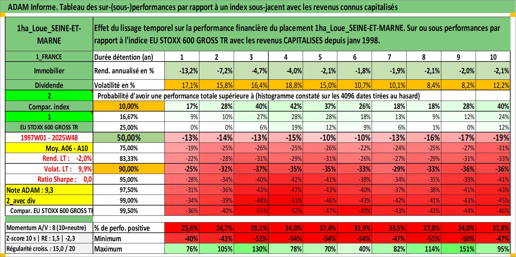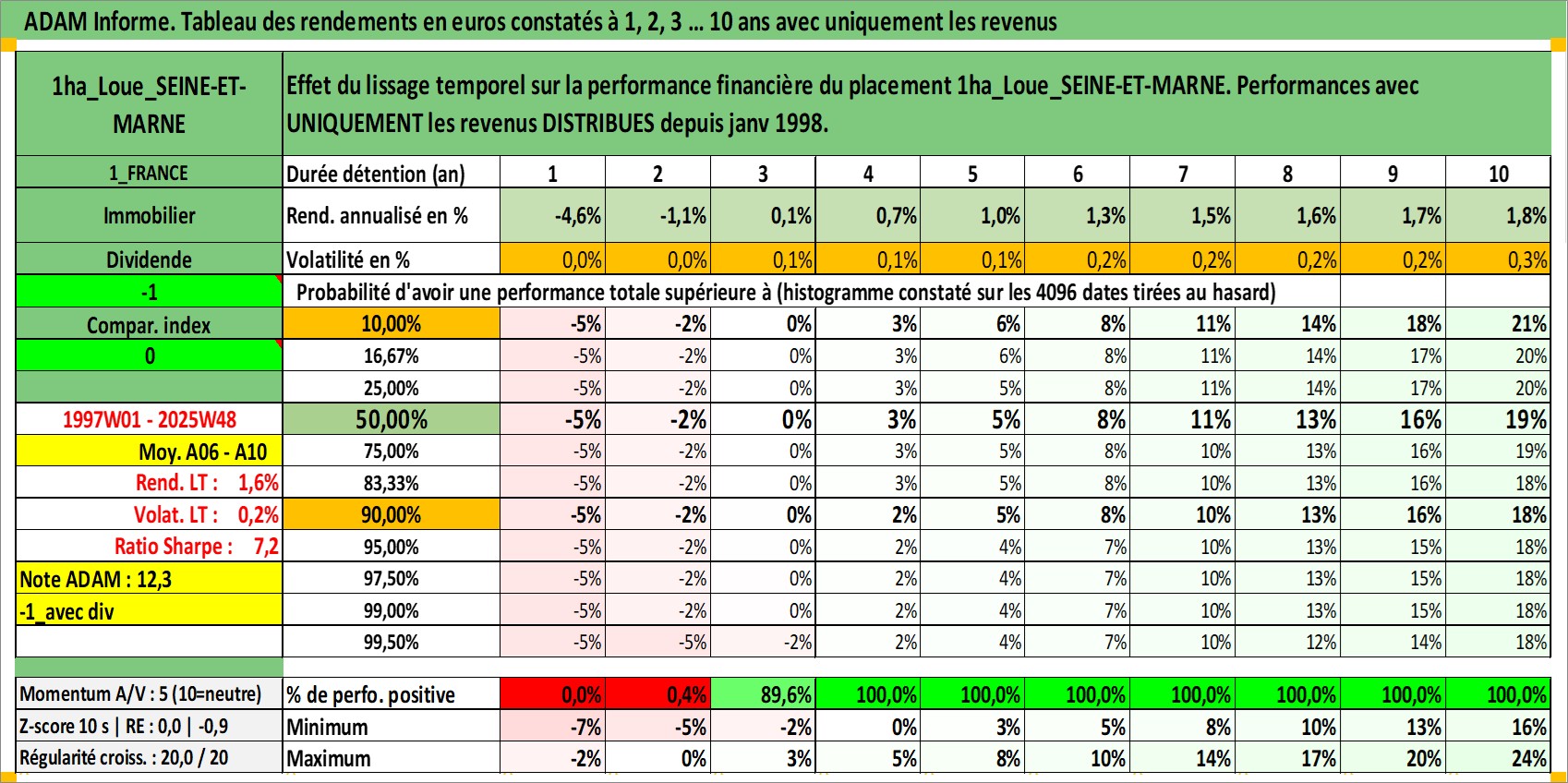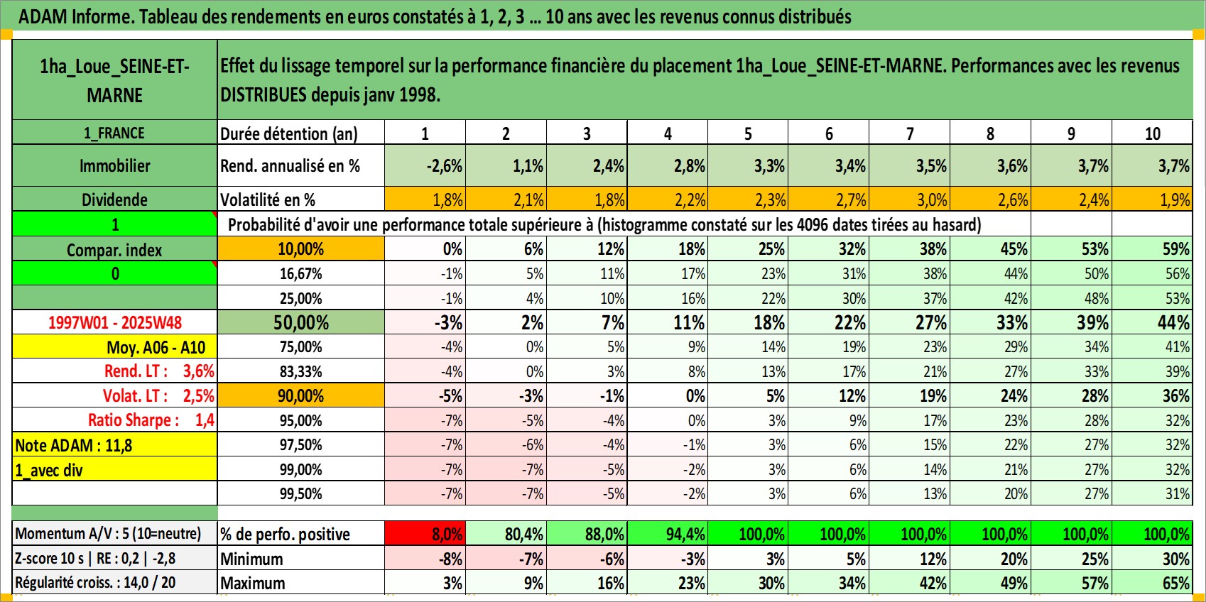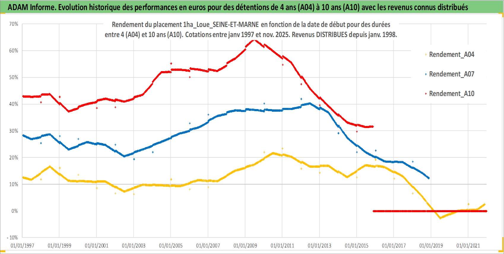 Site dédié aux investisseursPage dédiée sur site financeAnalyse des valorisations hebdomadaires de l'actif 1ha_Loue_SEINE-ET-MARNE. Cet actif est cote en EUR. Les valorisations couvrent les semaines 1997W01 a 2025W48. Les fermages de ce bien foncier sont pris egaux a 2,5% annuels de la valeur venale du bien.